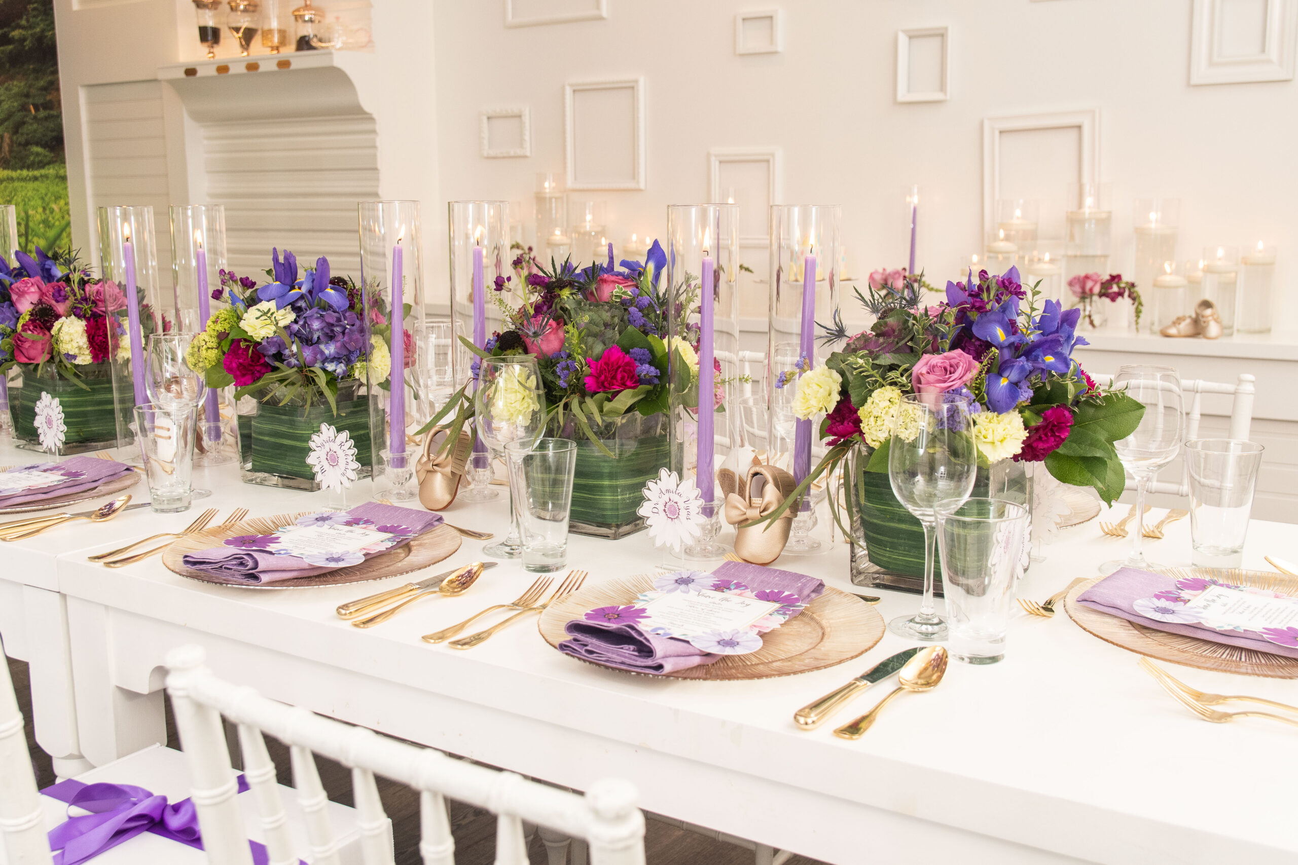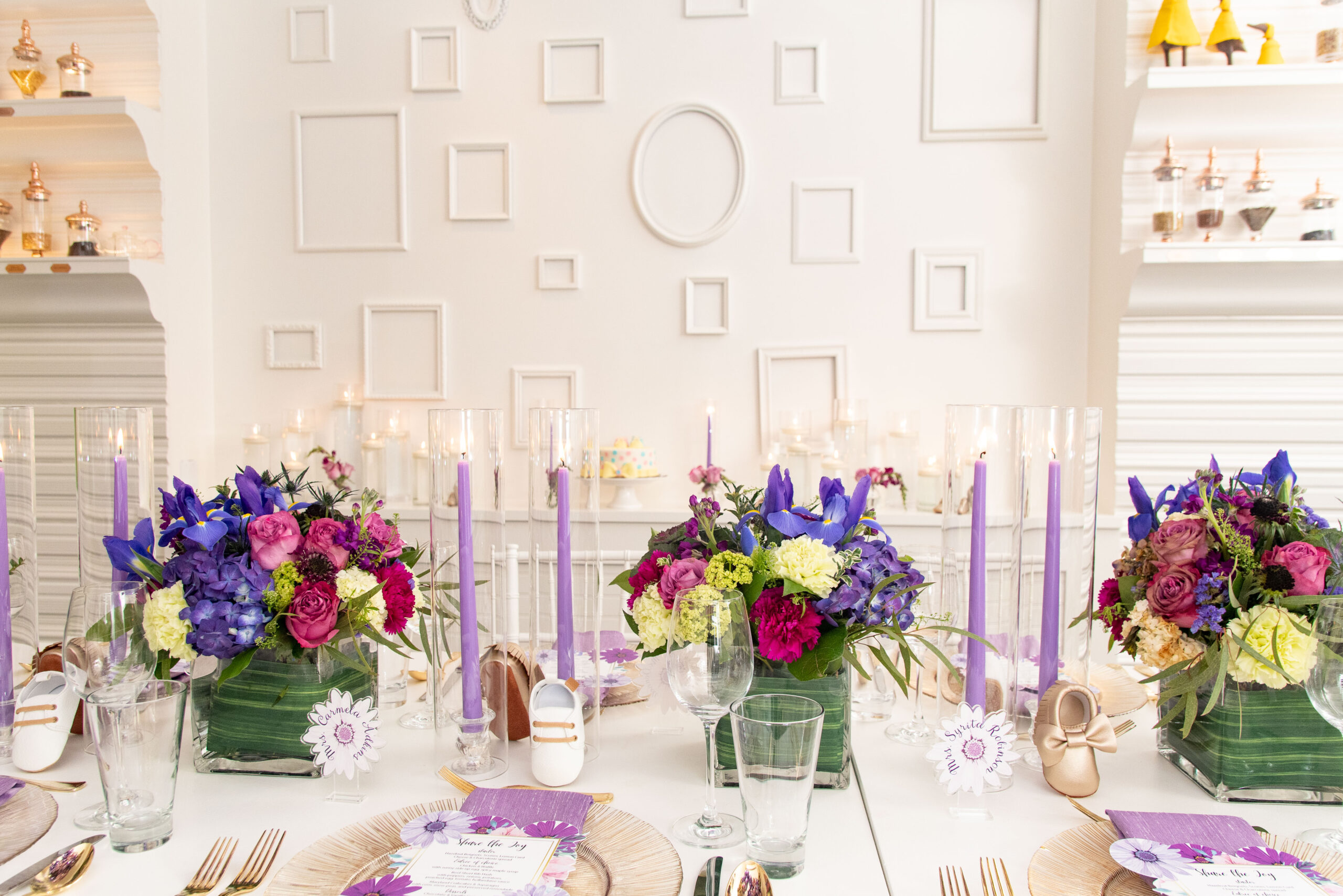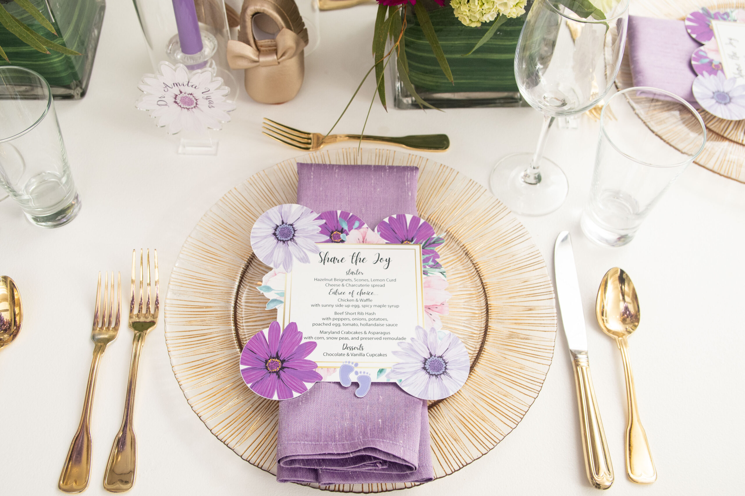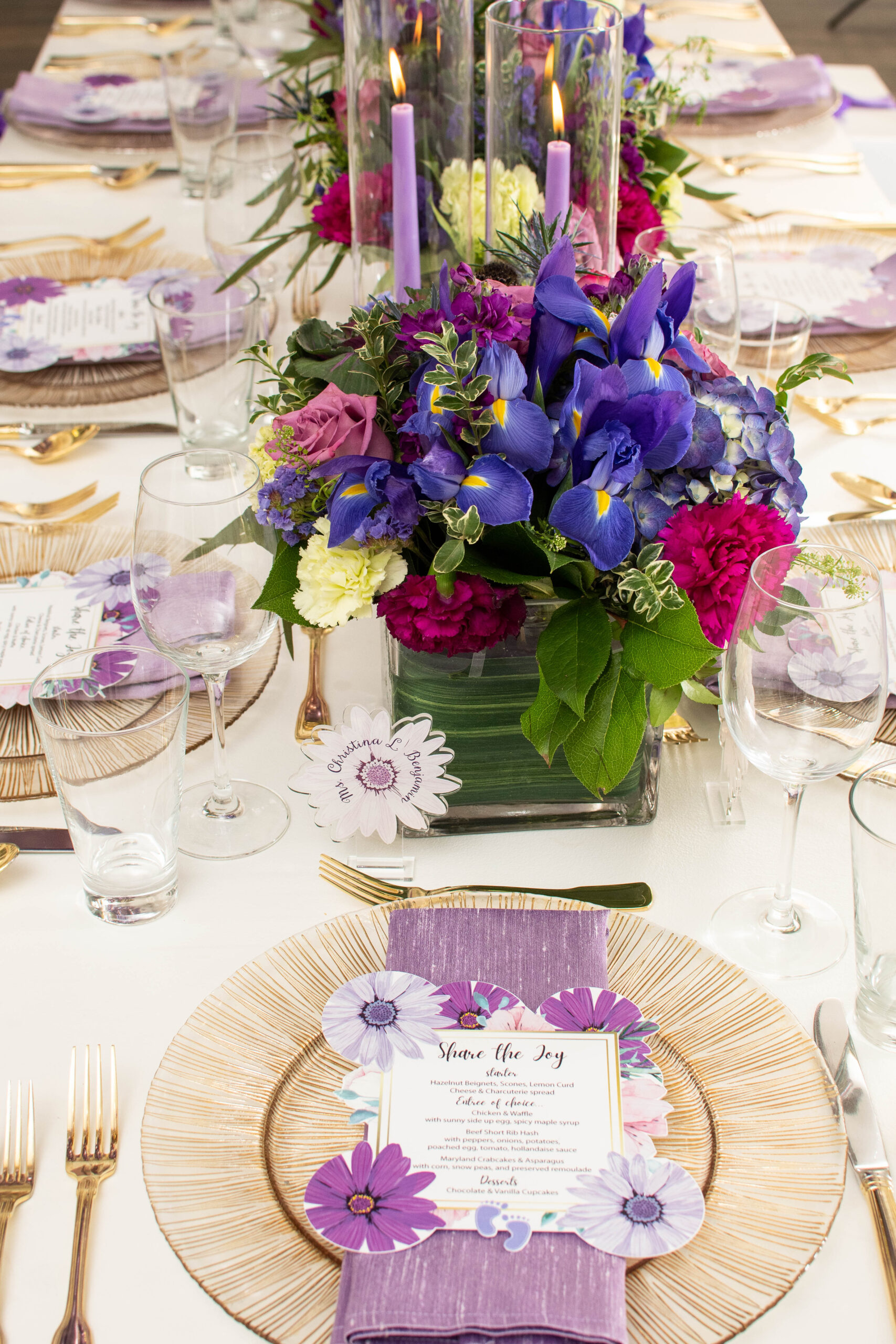 Within two-weeks I designed this elegant party from creating the design blue-print to curating heartfelt gift boxes that were shipped to guests who were attending the celebration virtually and those gathering in-person, to creating the themed-logo and designing the menu and escort cards, to selecting the brunch menu, to the technical setup for the virtual attendees, and more! Christina informed me that she absolutely loved floral gardens and the color purple. I had to balance birthday + baby shower + timeless, per the request of the the client. Every time, I met Christina she wore some shade of purple so I knew that was going to be the color for her party. For Christina, working with me was the ultimate experience that solved her problem; to have a celebration where all she had to do was put her trust in someone that would execute all angles and that is what she received.