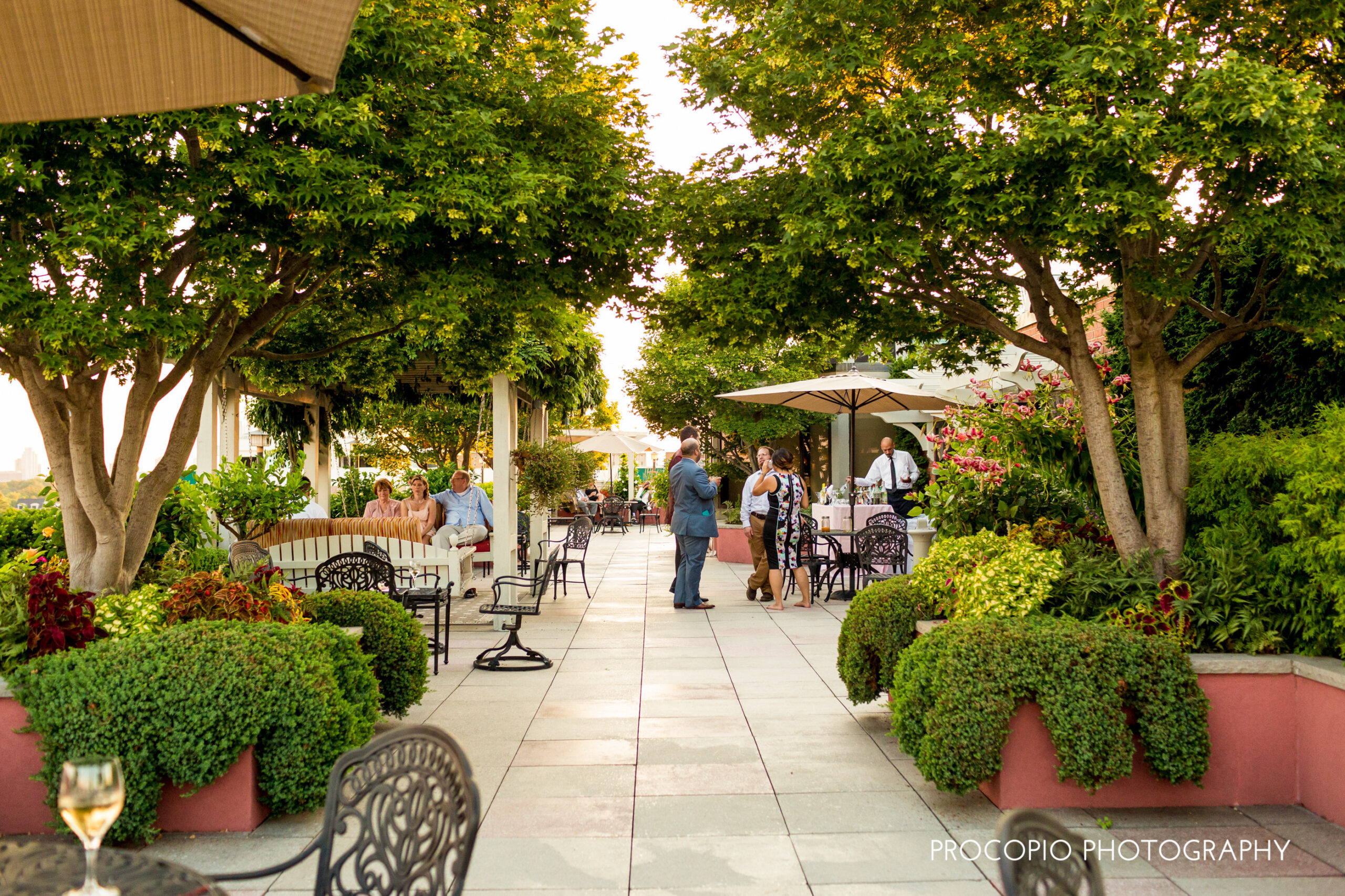 After the garden ceremony, guests enjoyed a beautiful cocktail reception on the rooftop patio and later assembled inside for a dinner reception catered by our friends at Main Event Caterers. From the heart-touching speeches by Jeromy and Eileen’s kids, to the carefully synchronized first dance by the couple, it was a magical evening of elegance and simplicity! The evening was filled with love and ended with a romantic kiss under the stars which was beautifully captured by our friends at Procopio Photography.