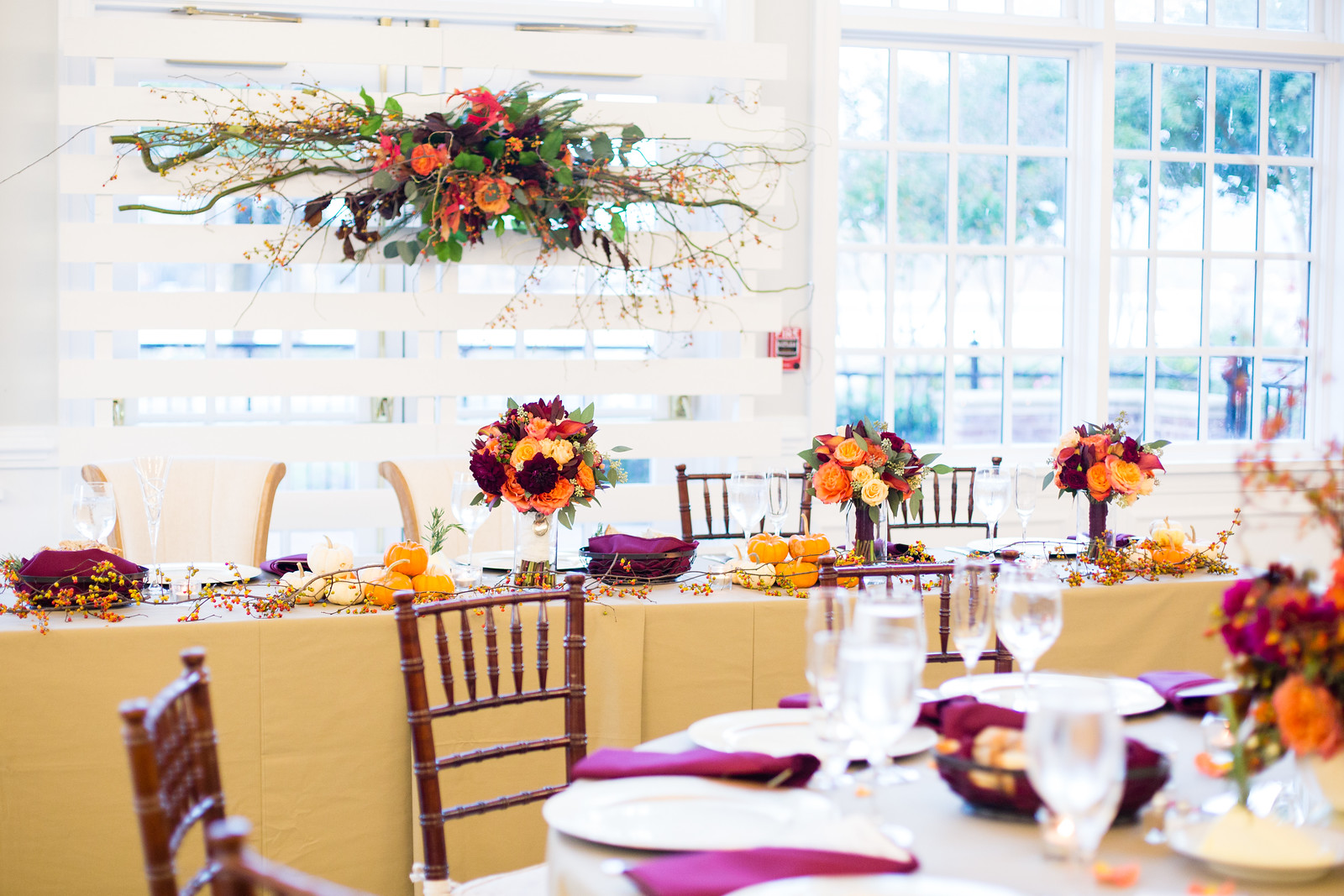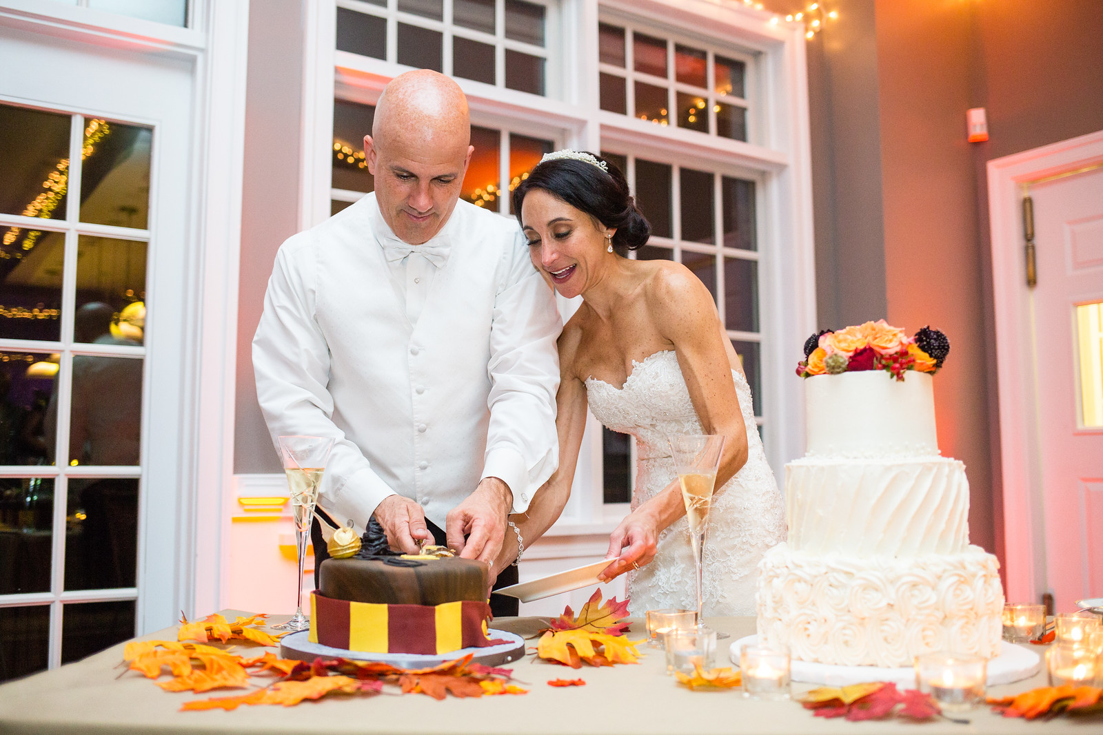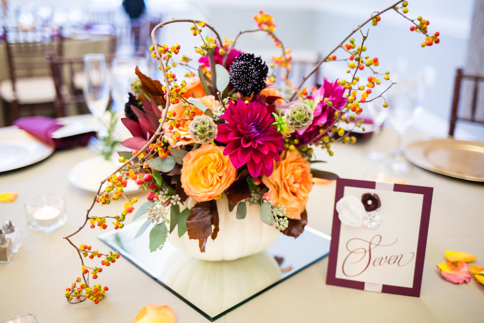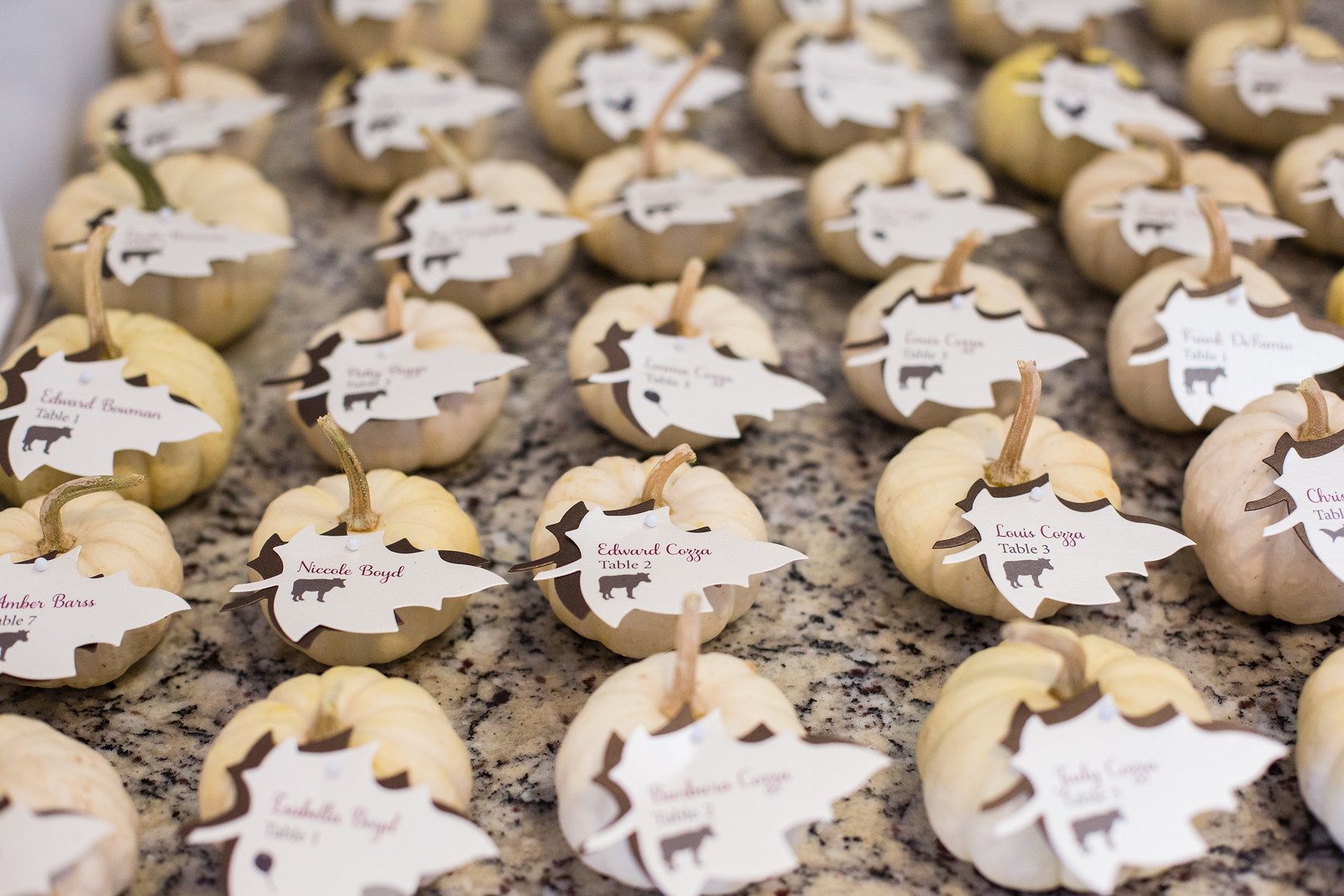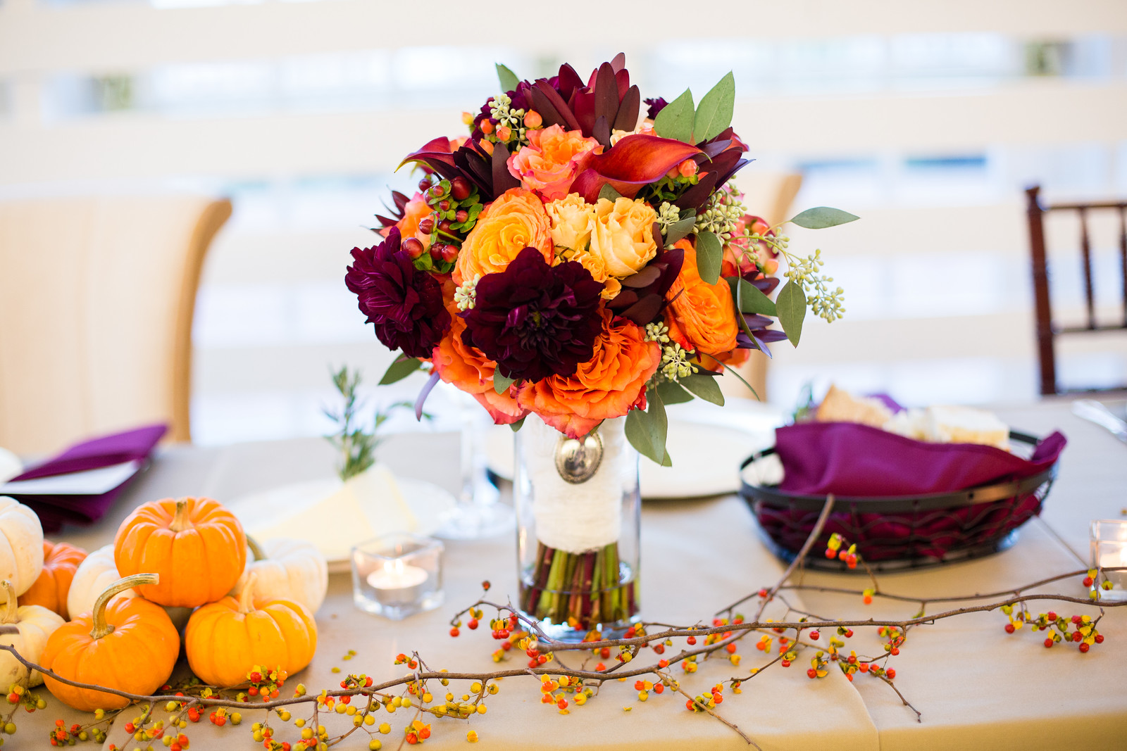 Their beautiful fall wedding was not only enriched with love but also enriched with the season with the beautiful selection of colors and décor used for their special day. Rich colors ranged from cinnamon to pumpkin spice, to burnt umber to amber, to bronze to marigold; a beautiful array of seasonal fall colors. Other intimate details on their wedding day, included the miniature pumpkin gourds with escort cards leaves on top; pumpkins were used as vases at the reception hosting a bounty of fall floral arrangements inside; pumpkins lining the steps at the altar; and a Harry Potter inspired groom’s cake. Details, details, details.