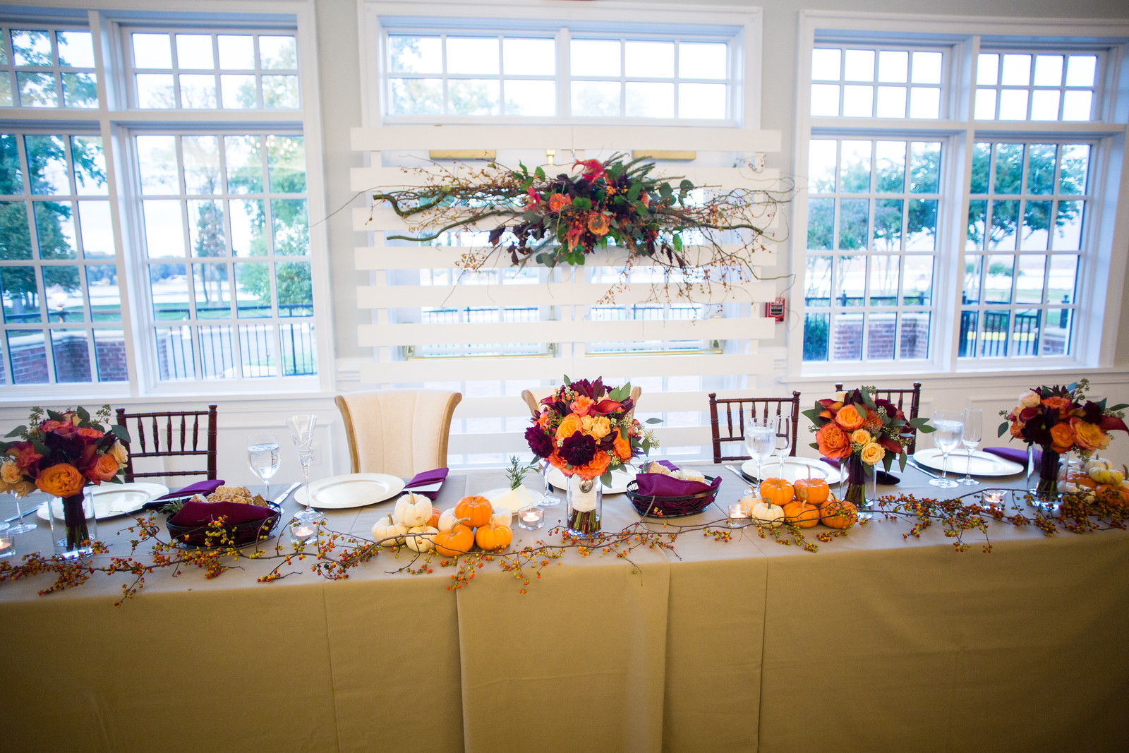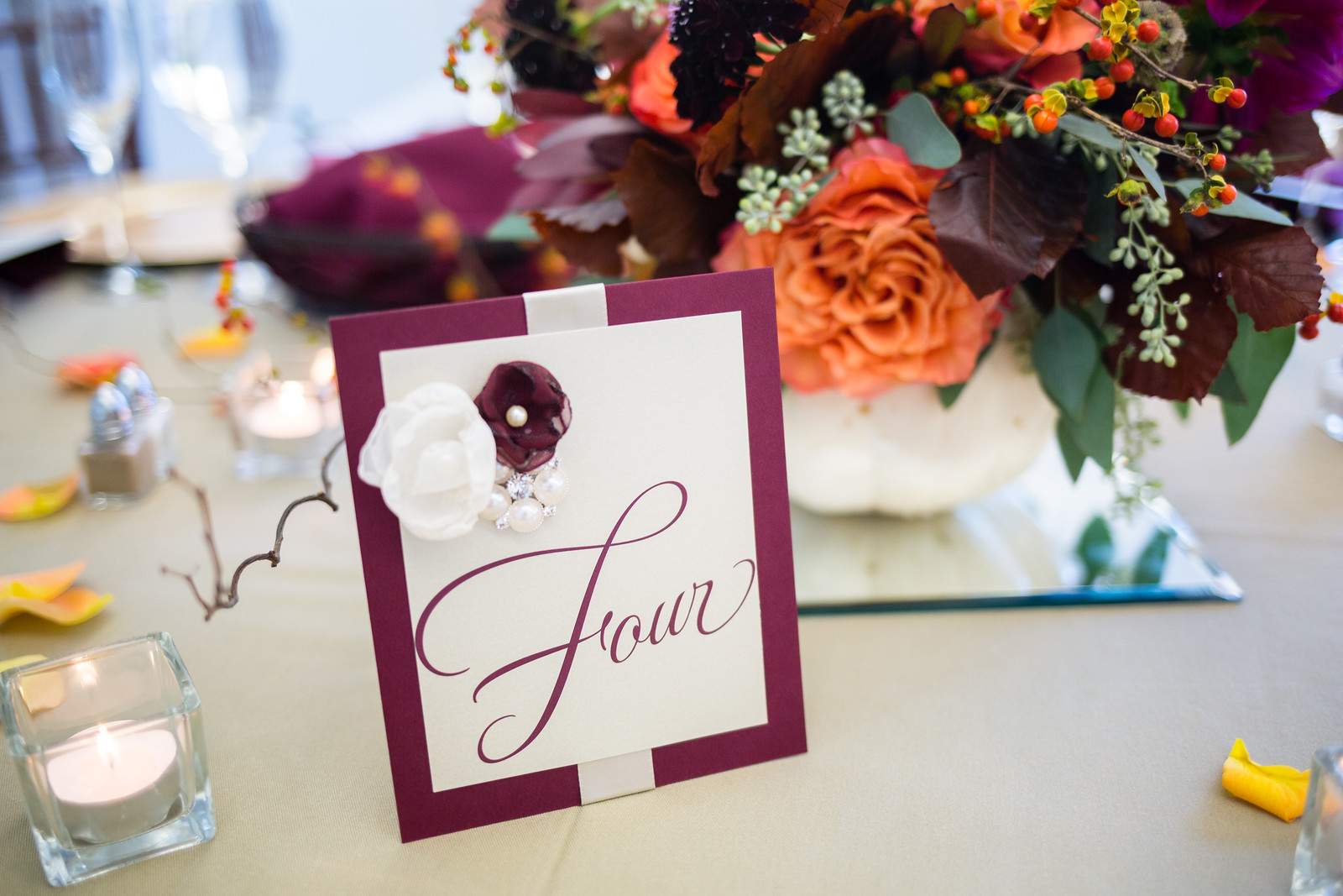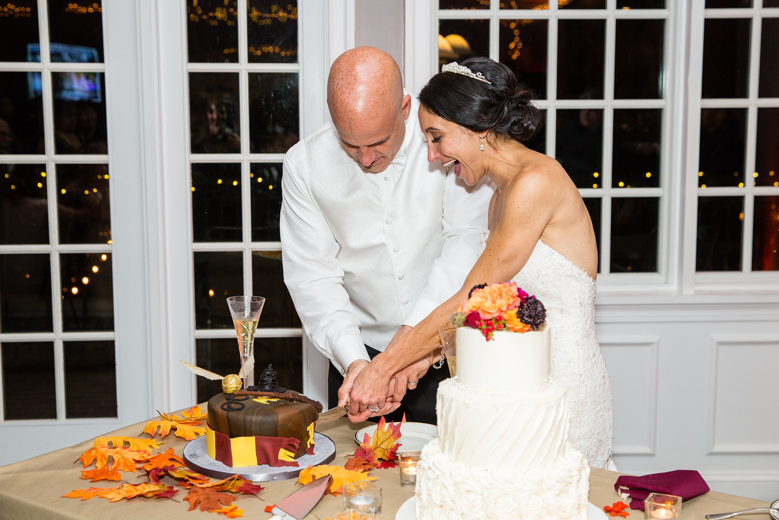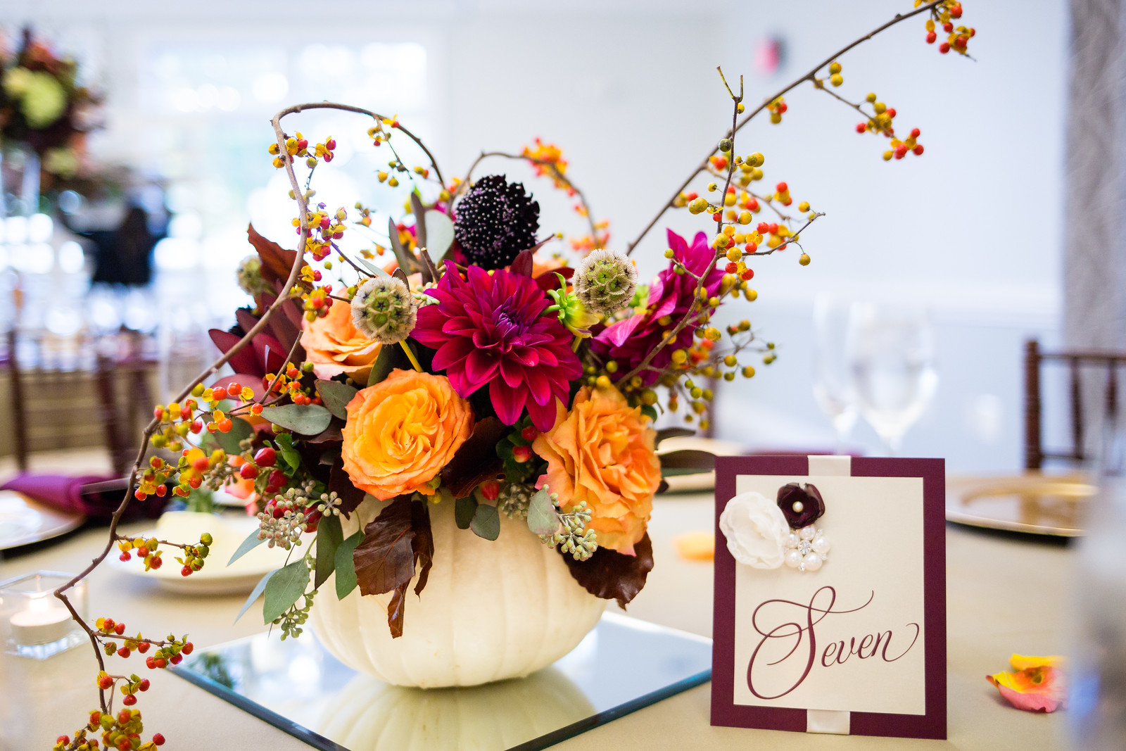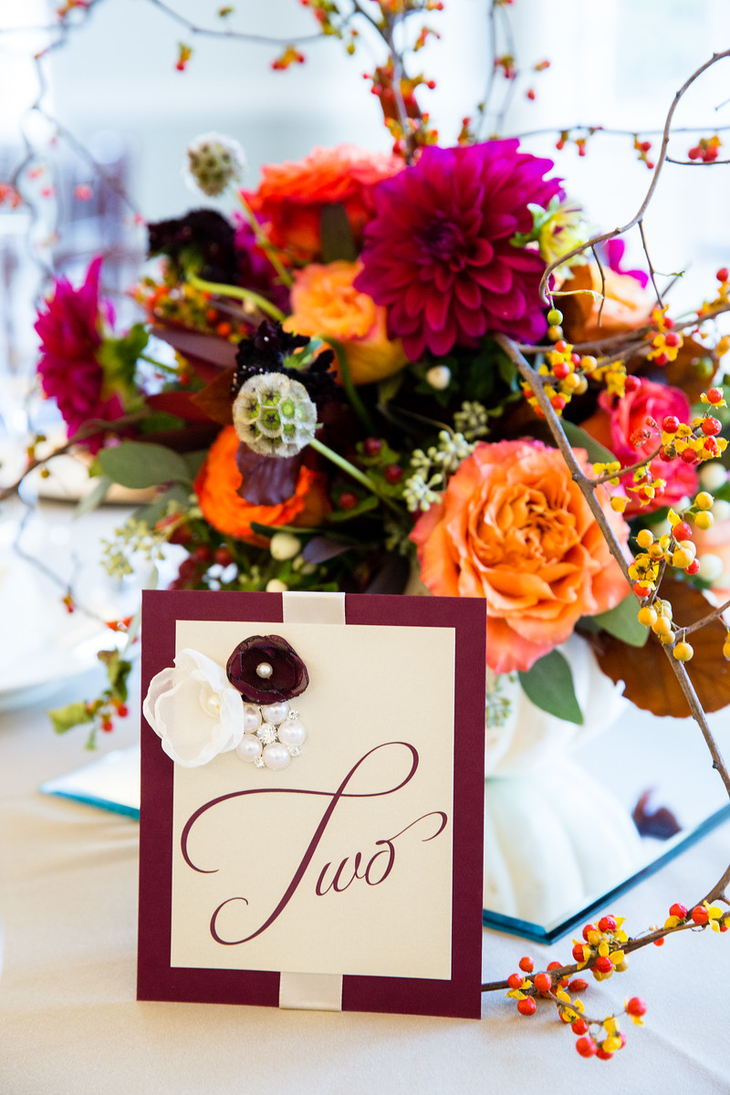 Their beautiful fall wedding was not only enriched with love but also enriched with the season with the beautiful selection of colors and décor used for their special day. Rich colors ranged from cinnamon to pumpkin spice, to burnt umber to amber, to bronze to marigold; a beautiful array of seasonal fall colors. Other intimate details on their wedding day, included the miniature pumpkin gourds with escort cards leaves on top; pumpkins were used as vases at the reception hosting a bounty of fall floral arrangements inside; pumpkins lining the steps at the altar; and a Harry Potter inspired groom’s cake. Details, details, details.