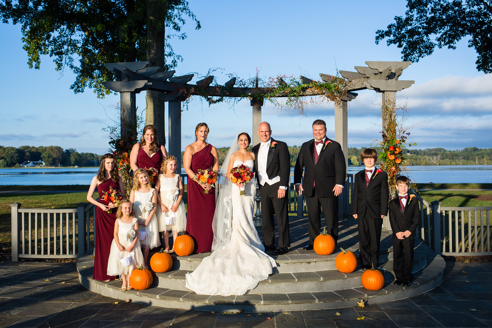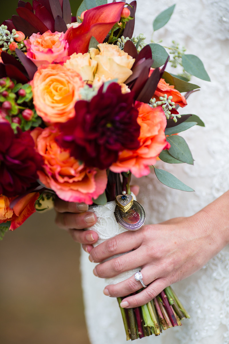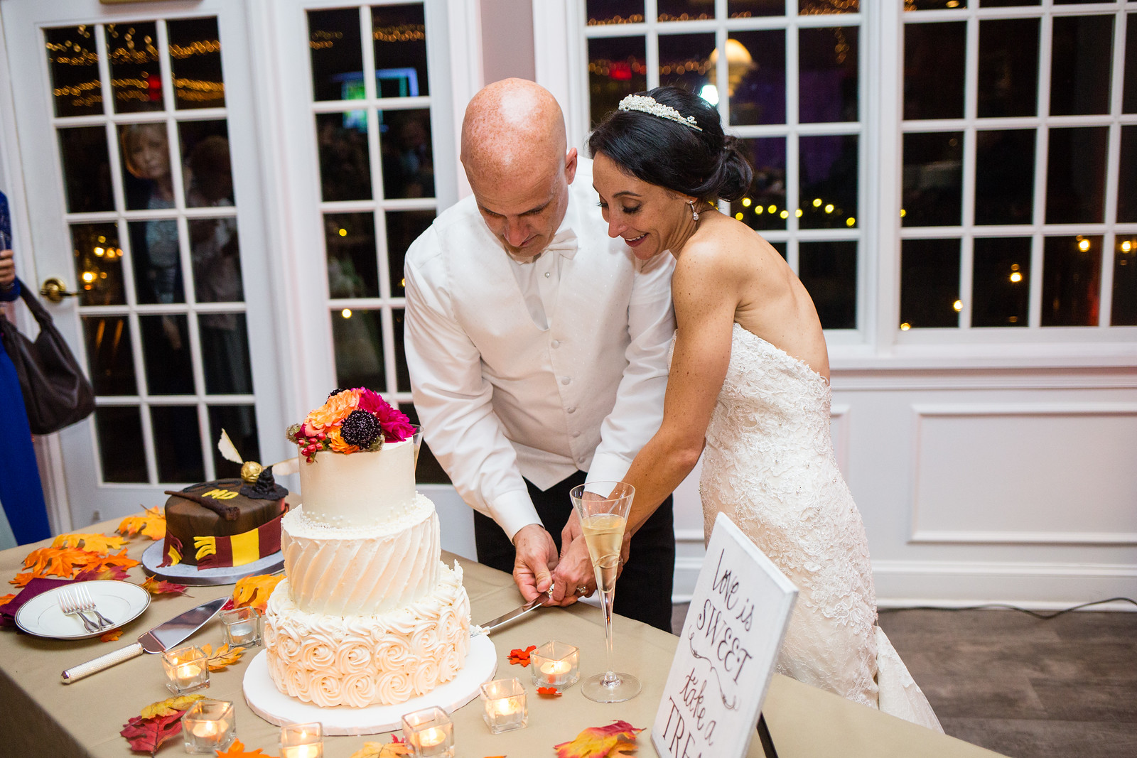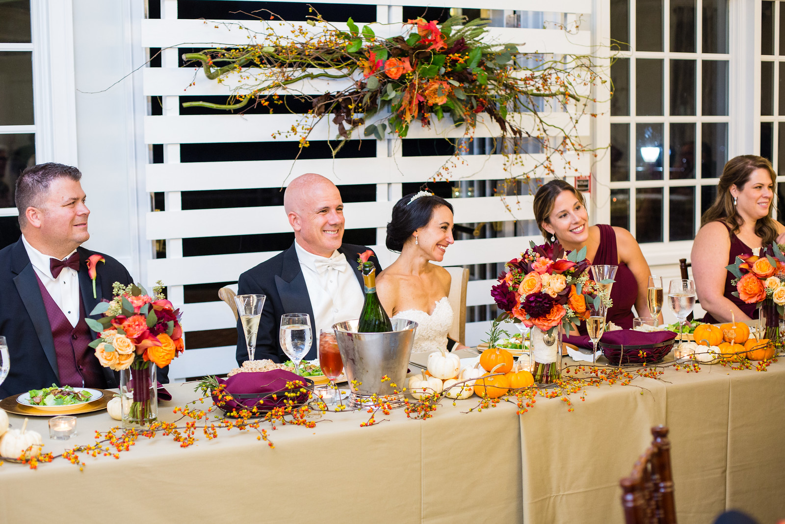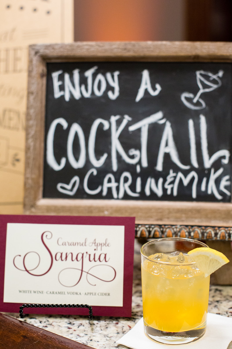 Their beautiful fall wedding was not only enriched with love but also enriched with the season with the beautiful selection of colors and décor used for their special day. Rich colors ranged from cinnamon to pumpkin spice, to burnt umber to amber, to bronze to marigold; a beautiful array of seasonal fall colors. Other intimate details on their wedding day, included the miniature pumpkin gourds with escort cards leaves on top; pumpkins were used as vases at the reception hosting a bounty of fall floral arrangements inside; pumpkins lining the steps at the altar; and a Harry Potter inspired groom’s cake. Details, details, details.
