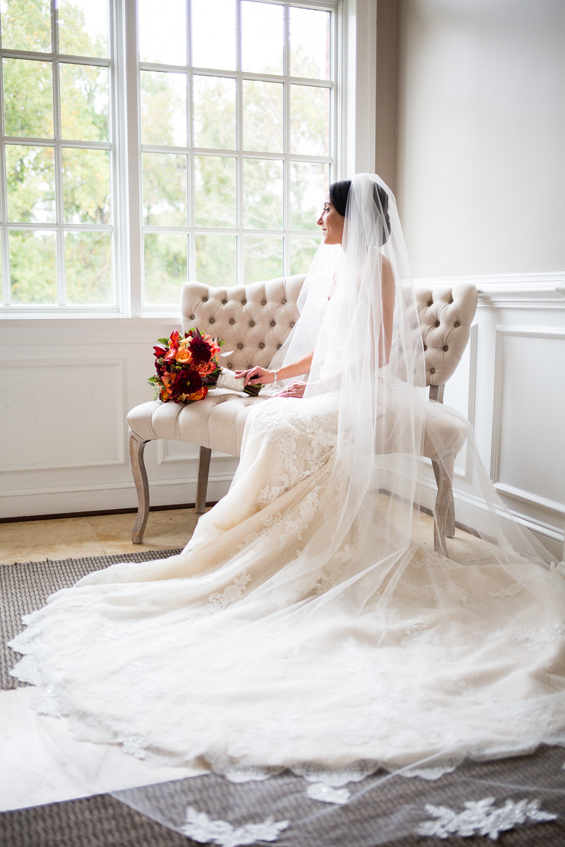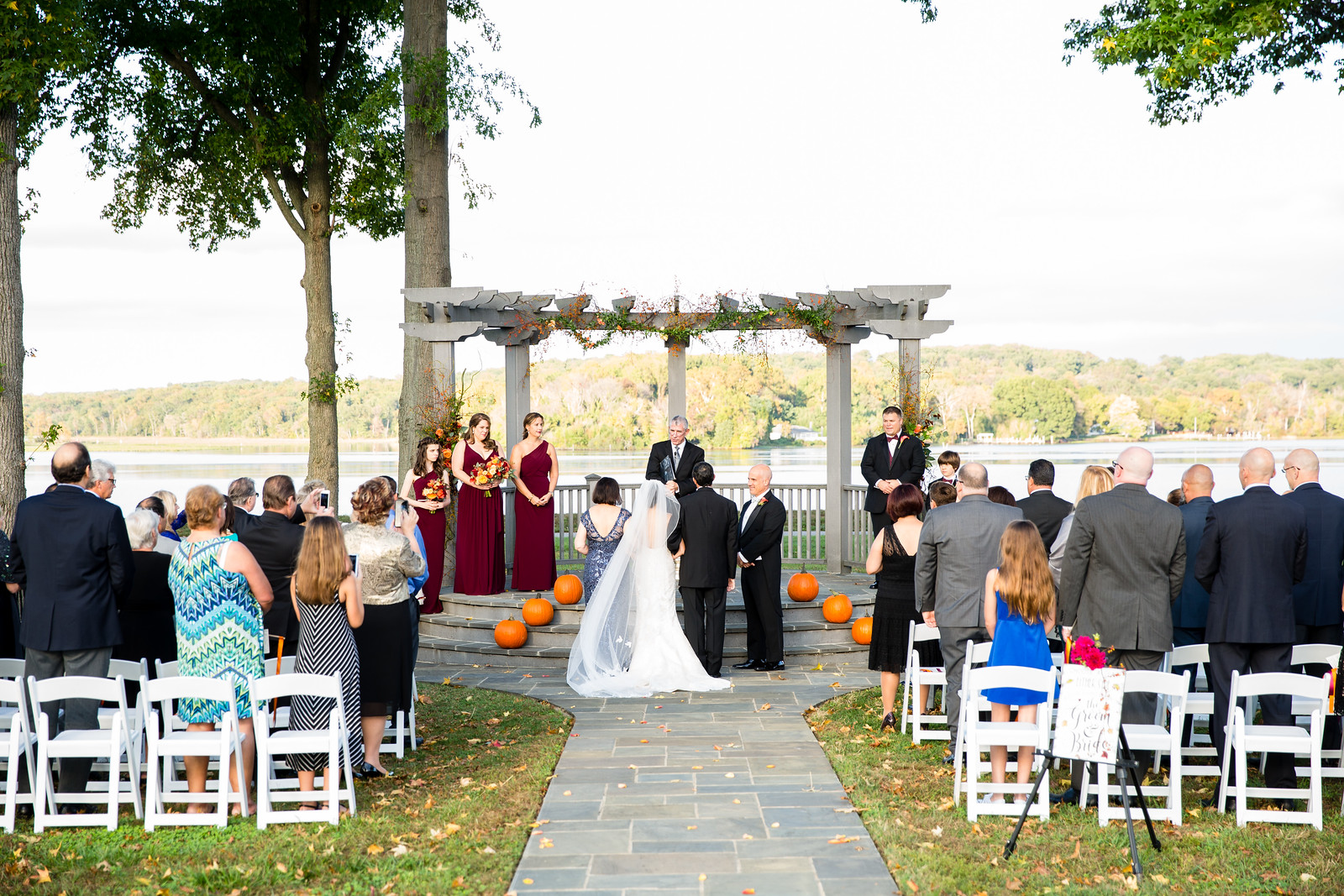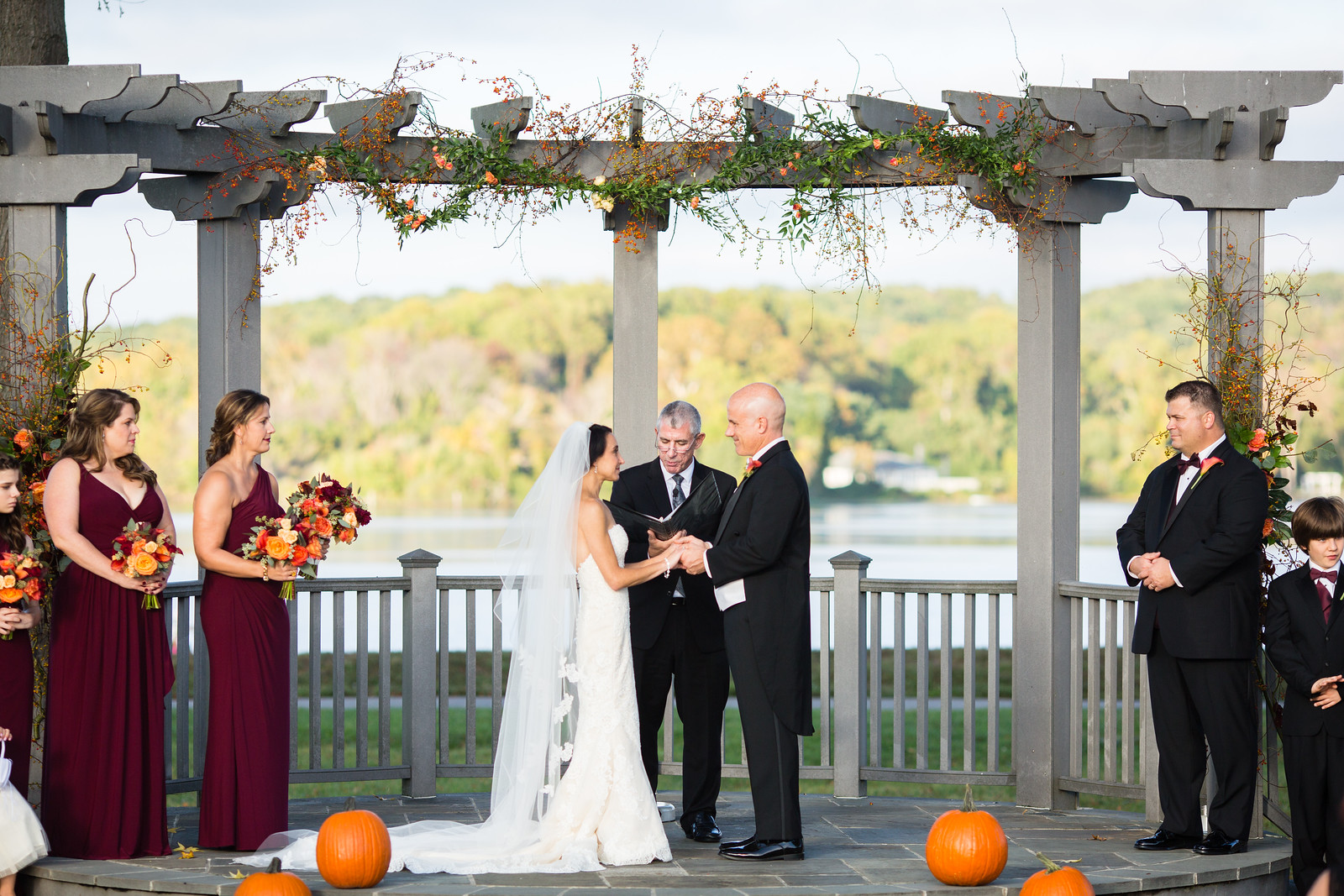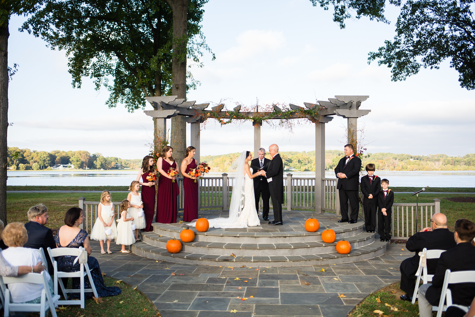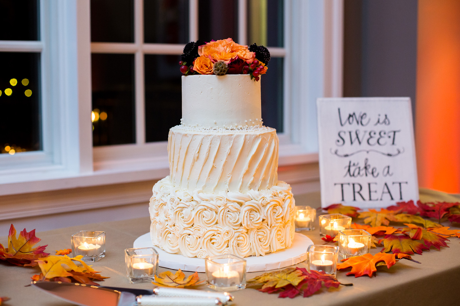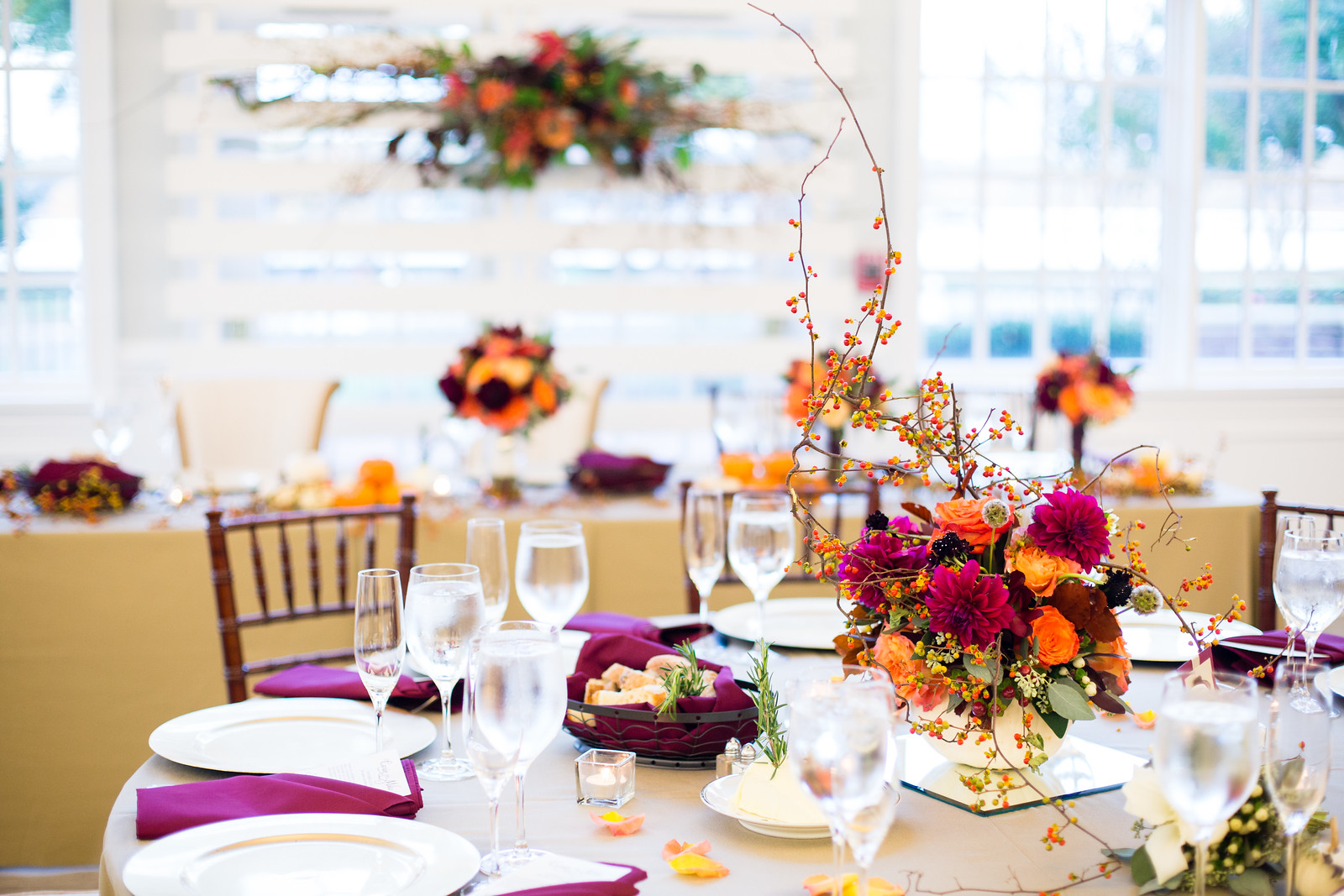 Their beautiful fall wedding was not only enriched with love but also enriched with the season with the beautiful selection of colors and décor used for their special day. Rich colors ranged from cinnamon to pumpkin spice, to burnt umber to amber, to bronze to marigold; a beautiful array of seasonal fall colors. Other intimate details on their wedding day, included the miniature pumpkin gourds with escort cards leaves on top; pumpkins were used as vases at the reception hosting a bounty of fall floral arrangements inside; pumpkins lining the steps at the altar; and a Harry Potter inspired groom’s cake. Details, details, details.