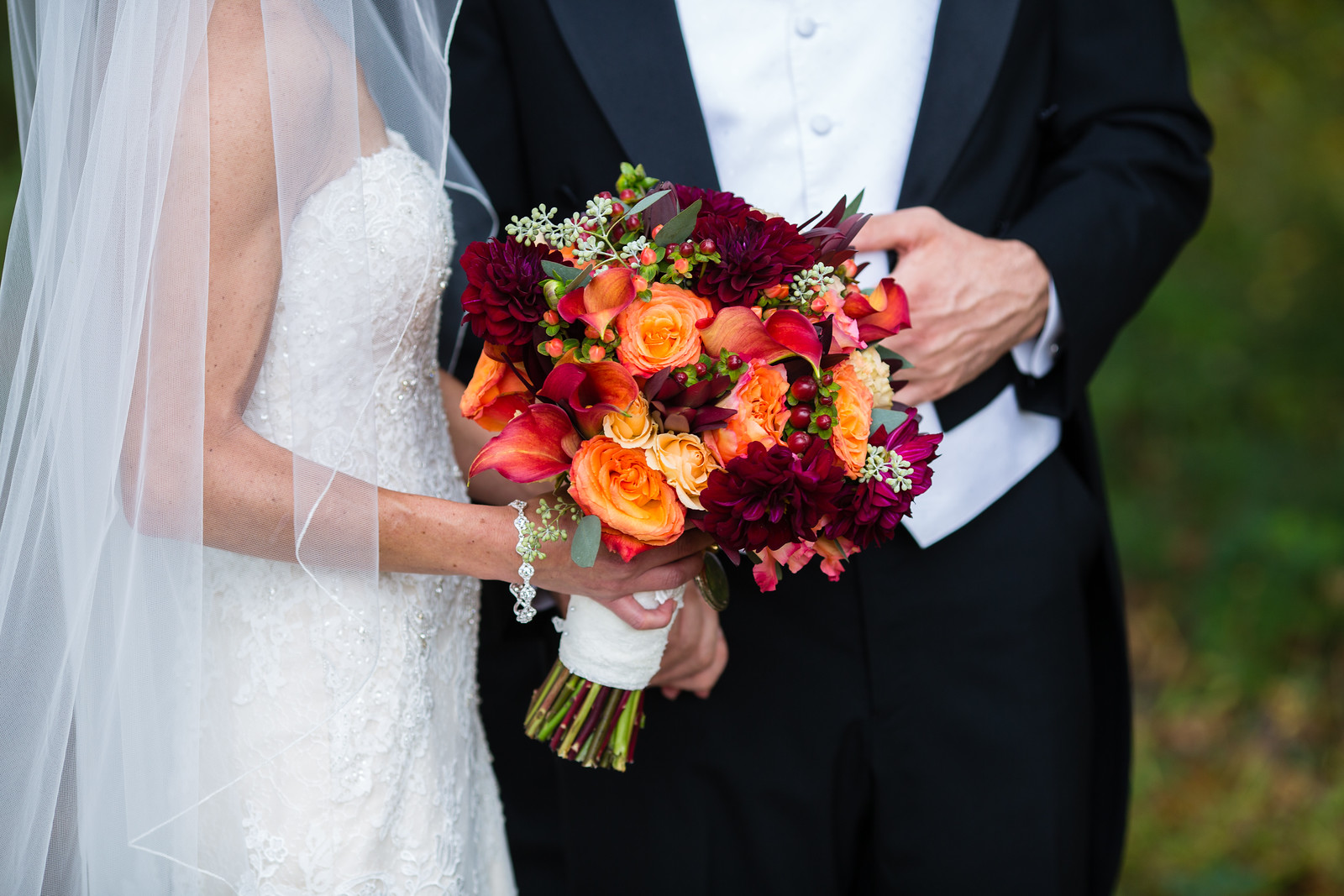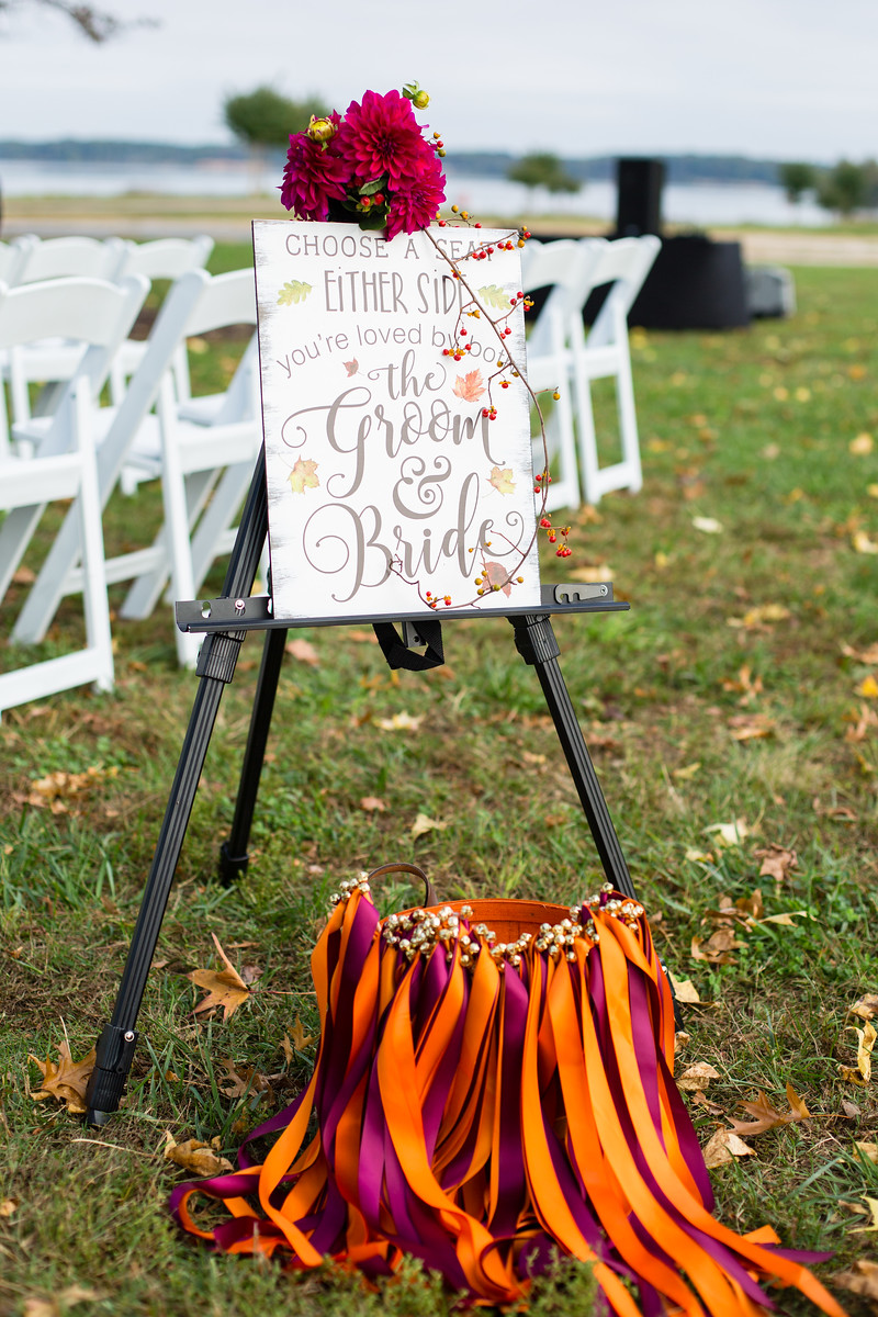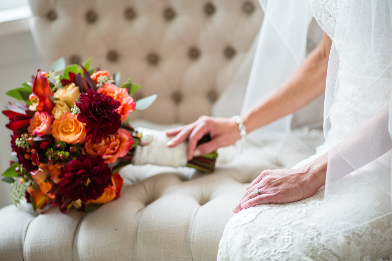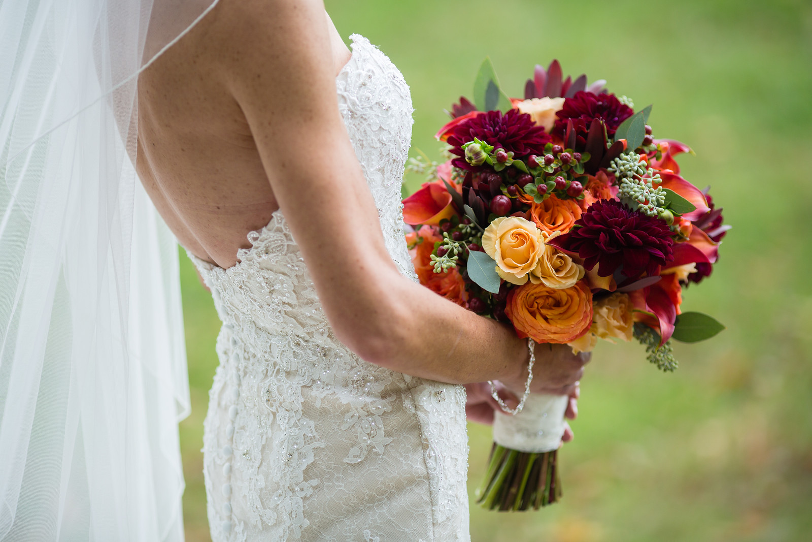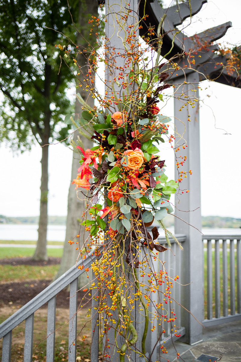 Their beautiful fall wedding was not only enriched with love but also enriched with the season with the beautiful selection of colors and décor used for their special day. Rich colors ranged from cinnamon to pumpkin spice, to burnt umber to amber, to bronze to marigold; a beautiful array of seasonal fall colors. Other intimate details on their wedding day, included the miniature pumpkin gourds with escort cards leaves on top; pumpkins were used as vases at the reception hosting a bounty of fall floral arrangements inside; pumpkins lining the steps at the altar; and a Harry Potter inspired groom’s cake. Details, details, details.