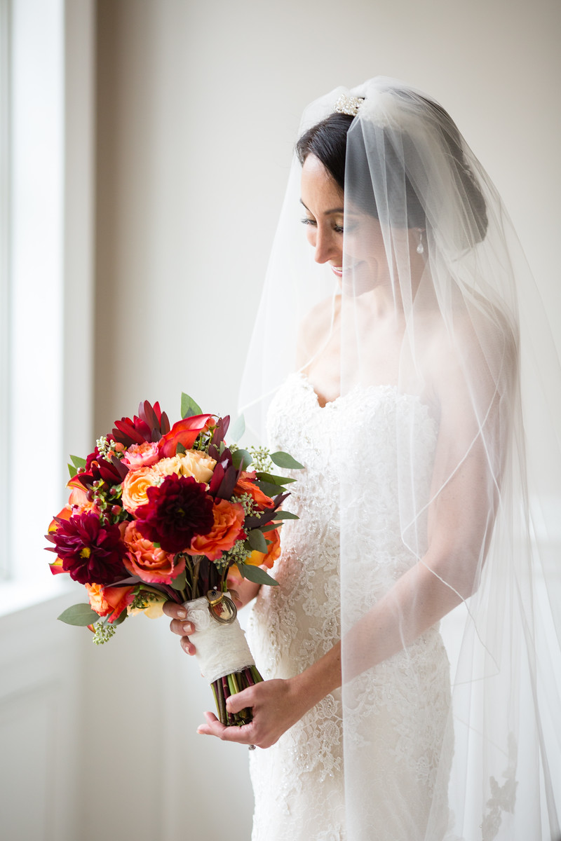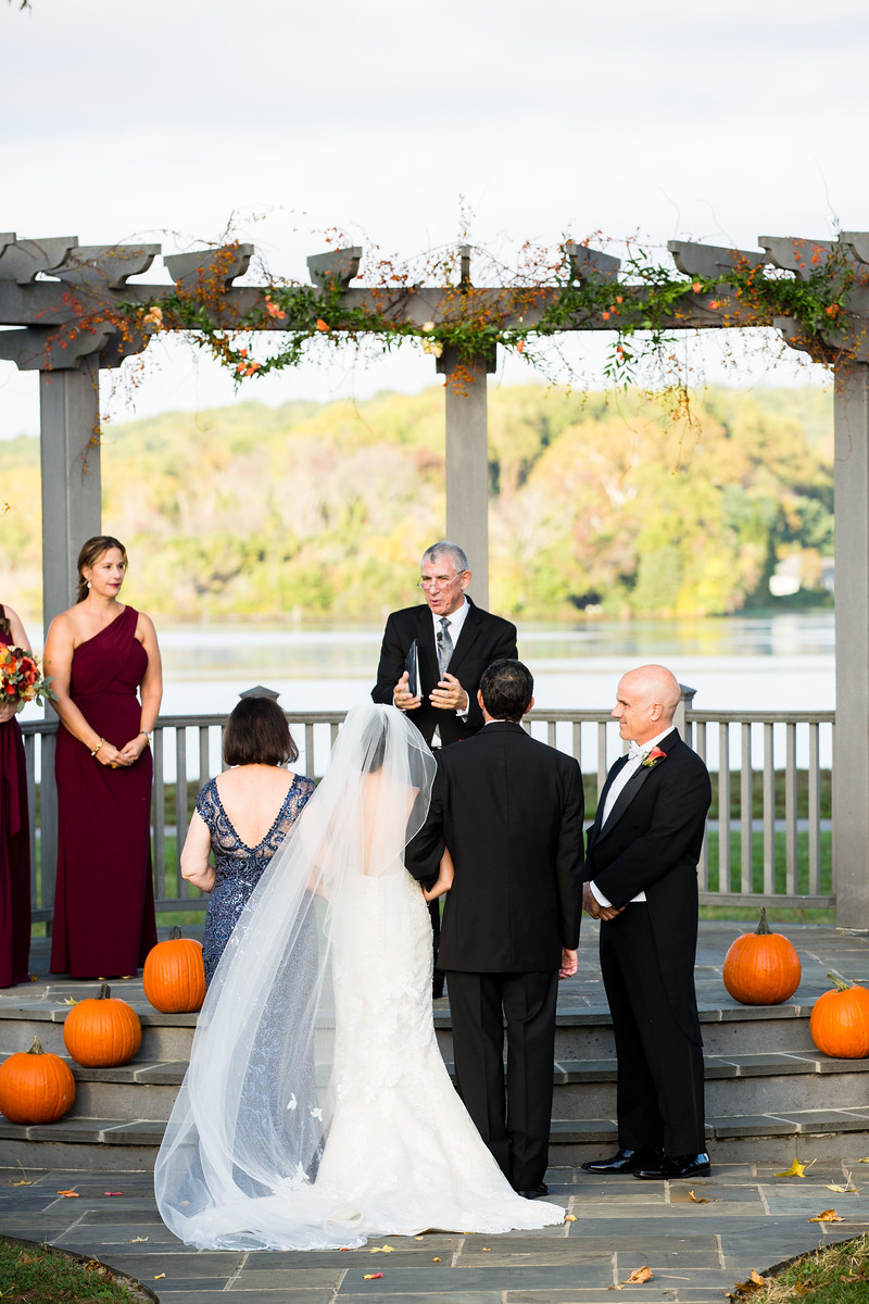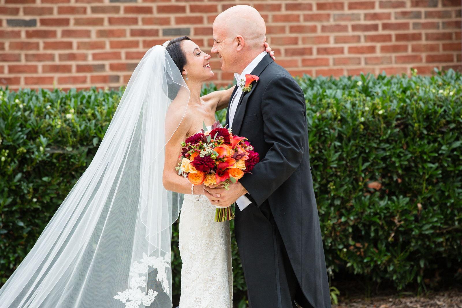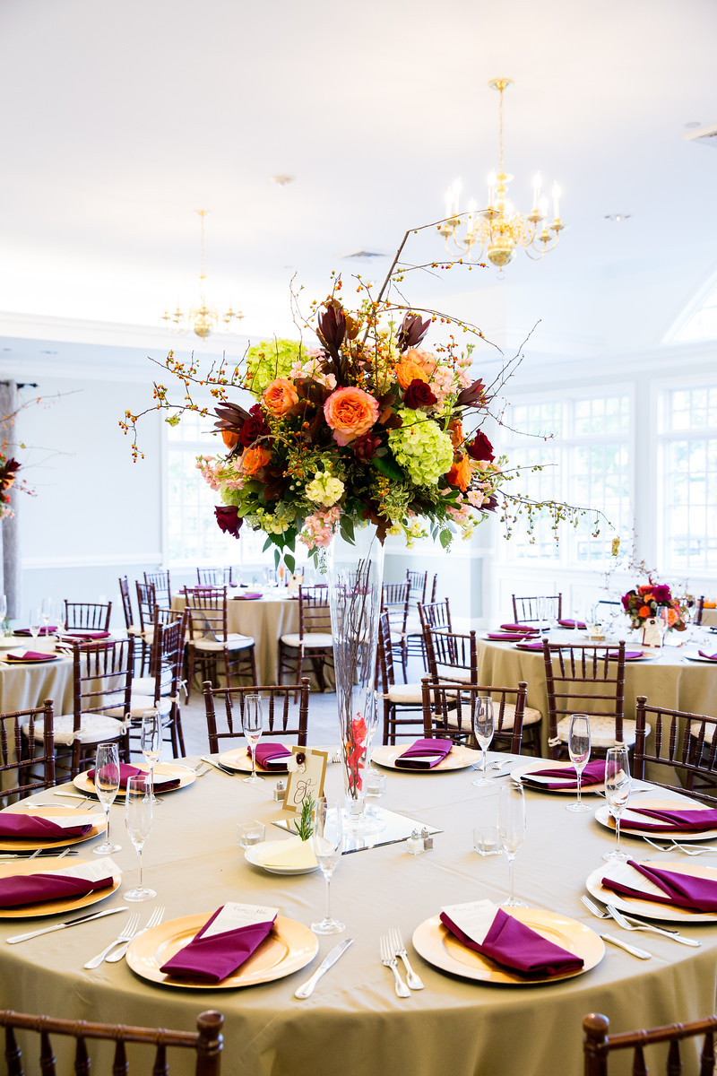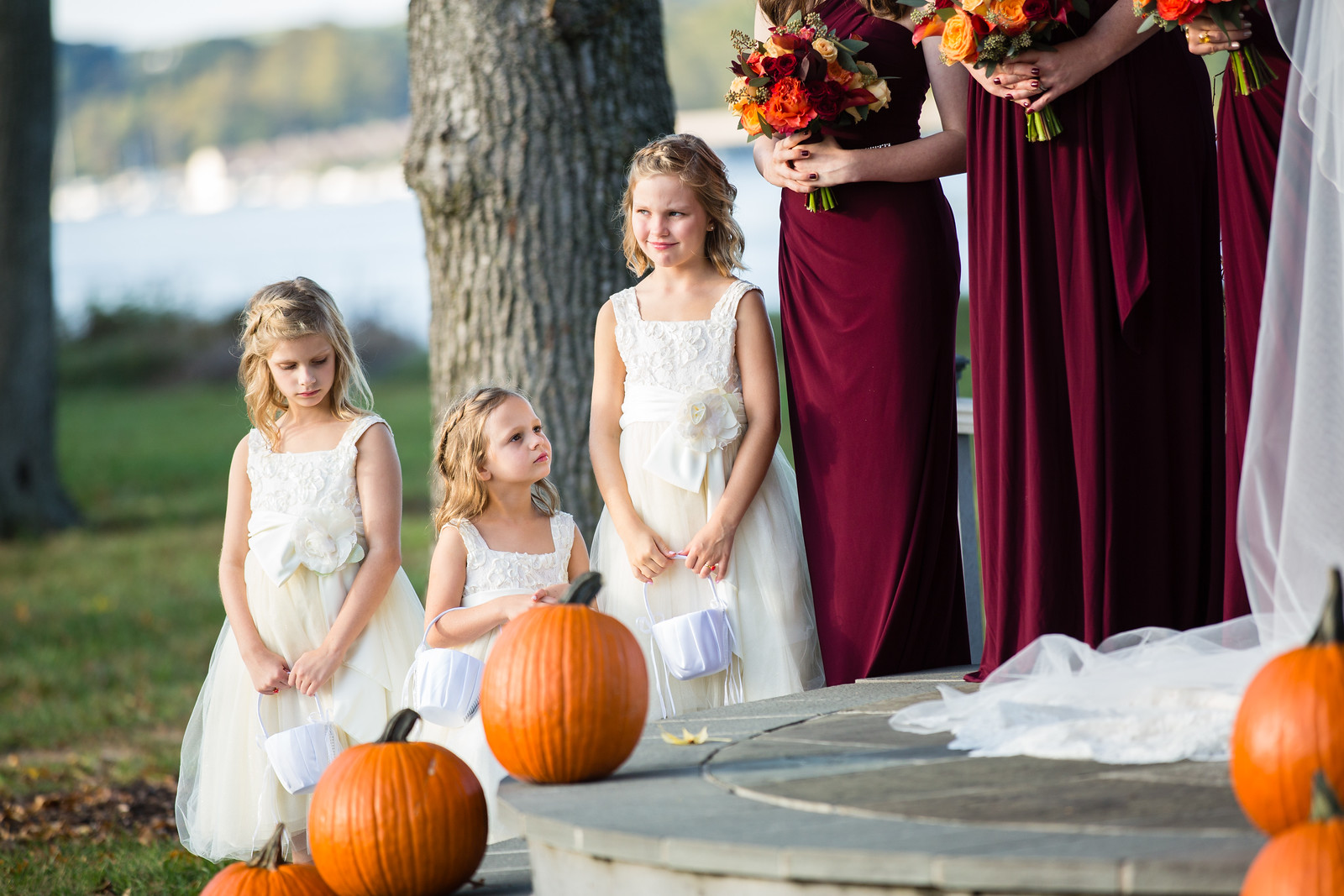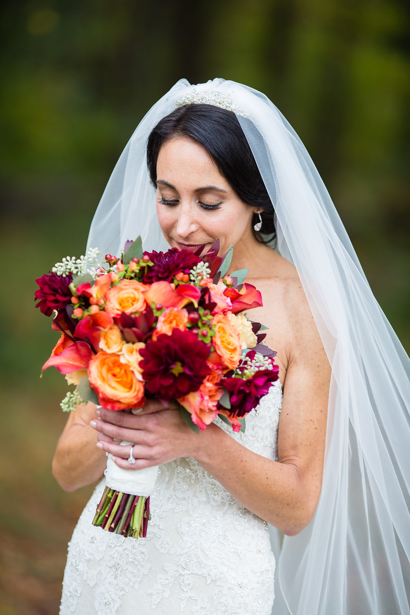Their beautiful fall wedding was not only enriched with love but also enriched with the season with the beautiful selection of colors and décor used for their special day. Rich colors ranged from cinnamon to pumpkin spice, to burnt umber to amber, to bronze to marigold; a beautiful array of seasonal fall colors. Other intimate details on their wedding day, included the miniature pumpkin gourds with escort cards leaves on top; pumpkins were used as vases at the reception hosting a bounty of fall floral arrangements inside; pumpkins lining the steps at the altar; and a Harry Potter inspired groom’s cake. Details, details, details.
