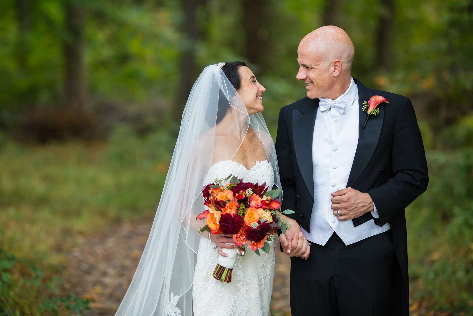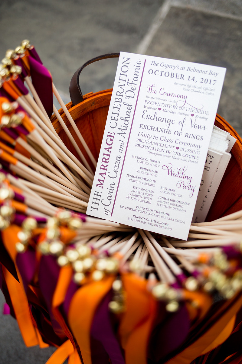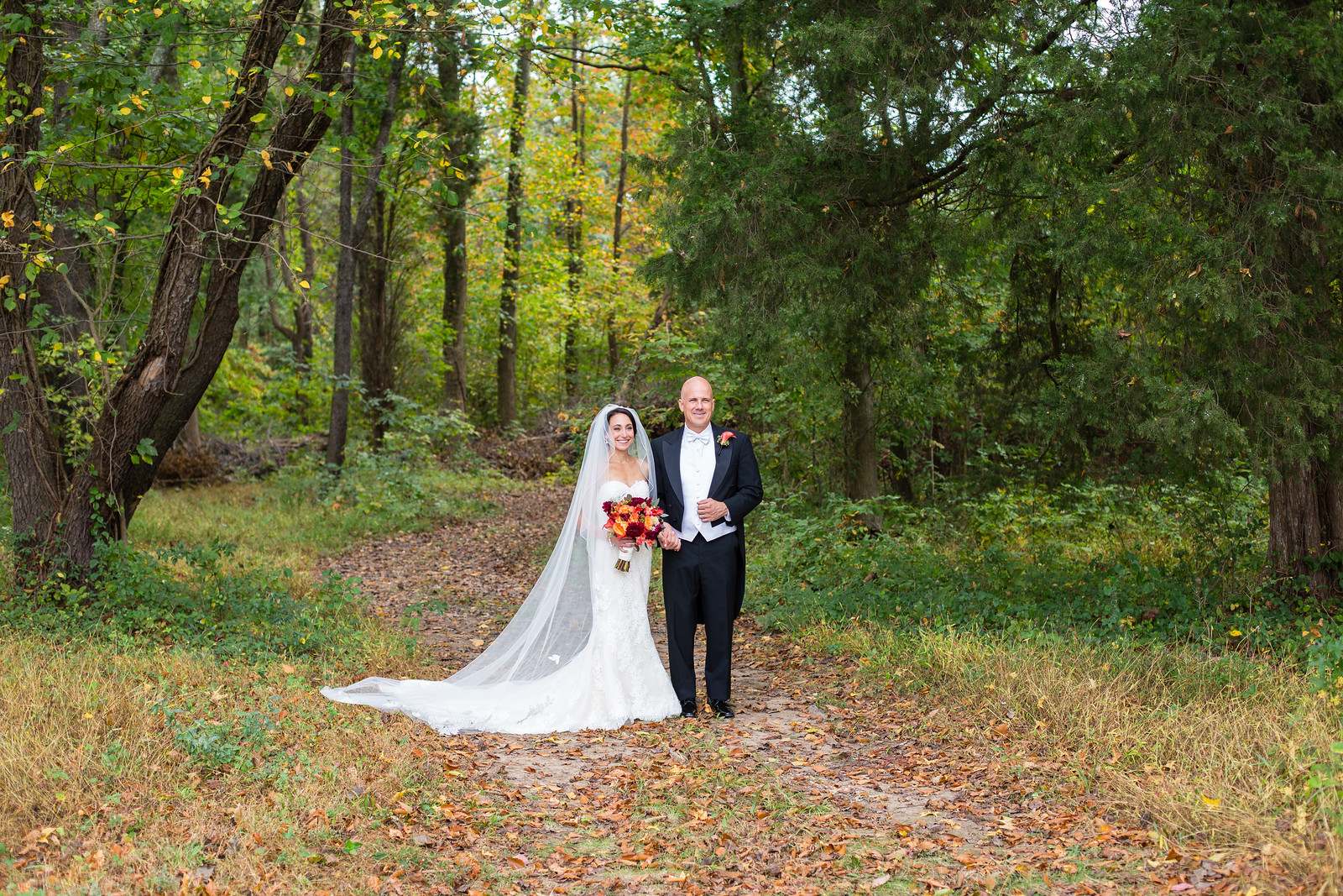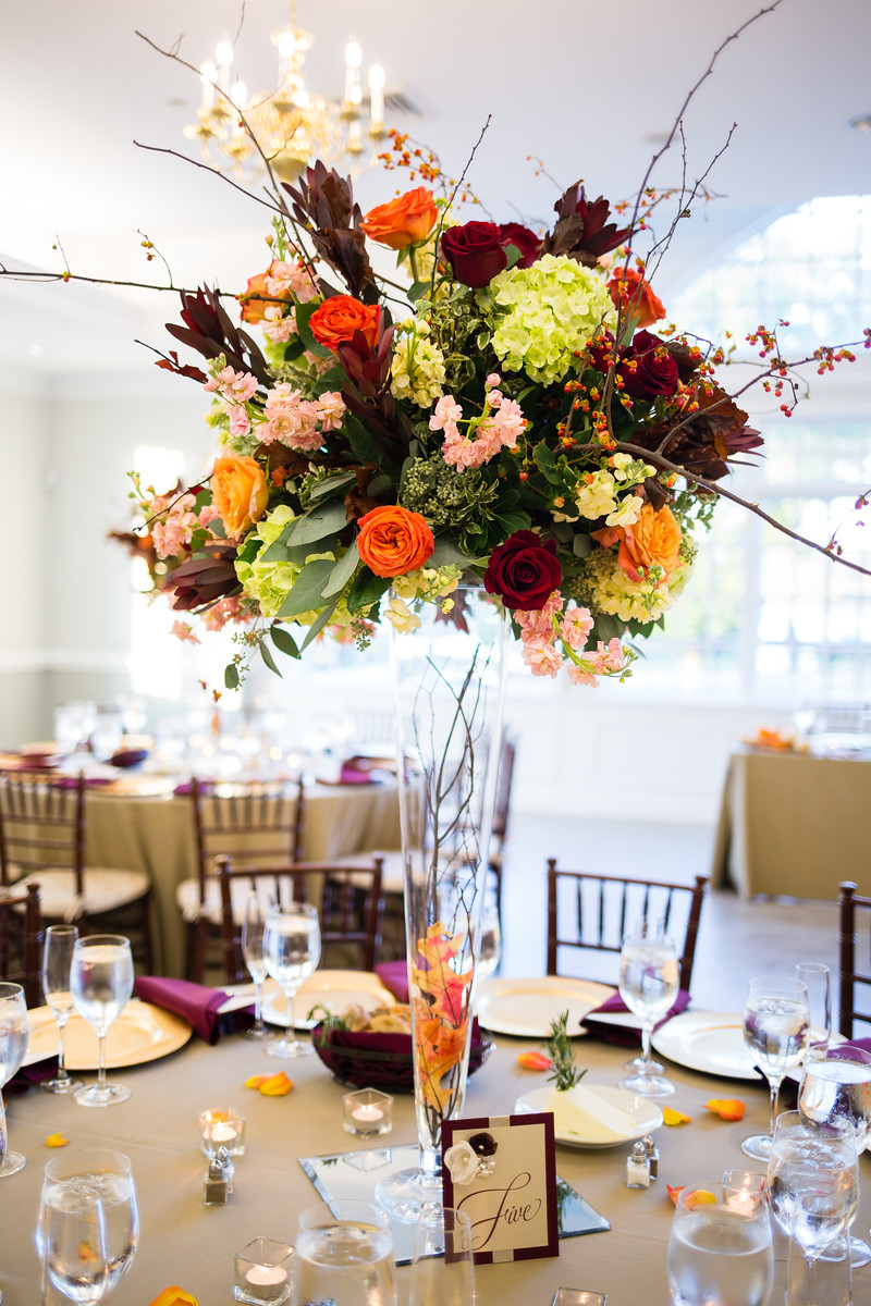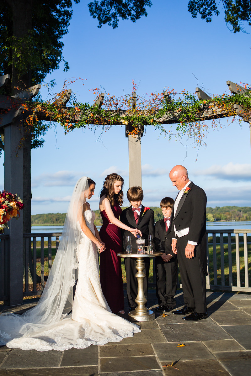 Their beautiful fall wedding was not only enriched with love but also enriched with the season with the beautiful selection of colors and décor used for their special day. Rich colors ranged from cinnamon to pumpkin spice, to burnt umber to amber, to bronze to marigold; a beautiful array of seasonal fall colors. Other intimate details on their wedding day, included the miniature pumpkin gourds with escort cards leaves on top; pumpkins were used as vases at the reception hosting a bounty of fall floral arrangements inside; pumpkins lining the steps at the altar; and a Harry Potter inspired groom’s cake. Details, details, details.