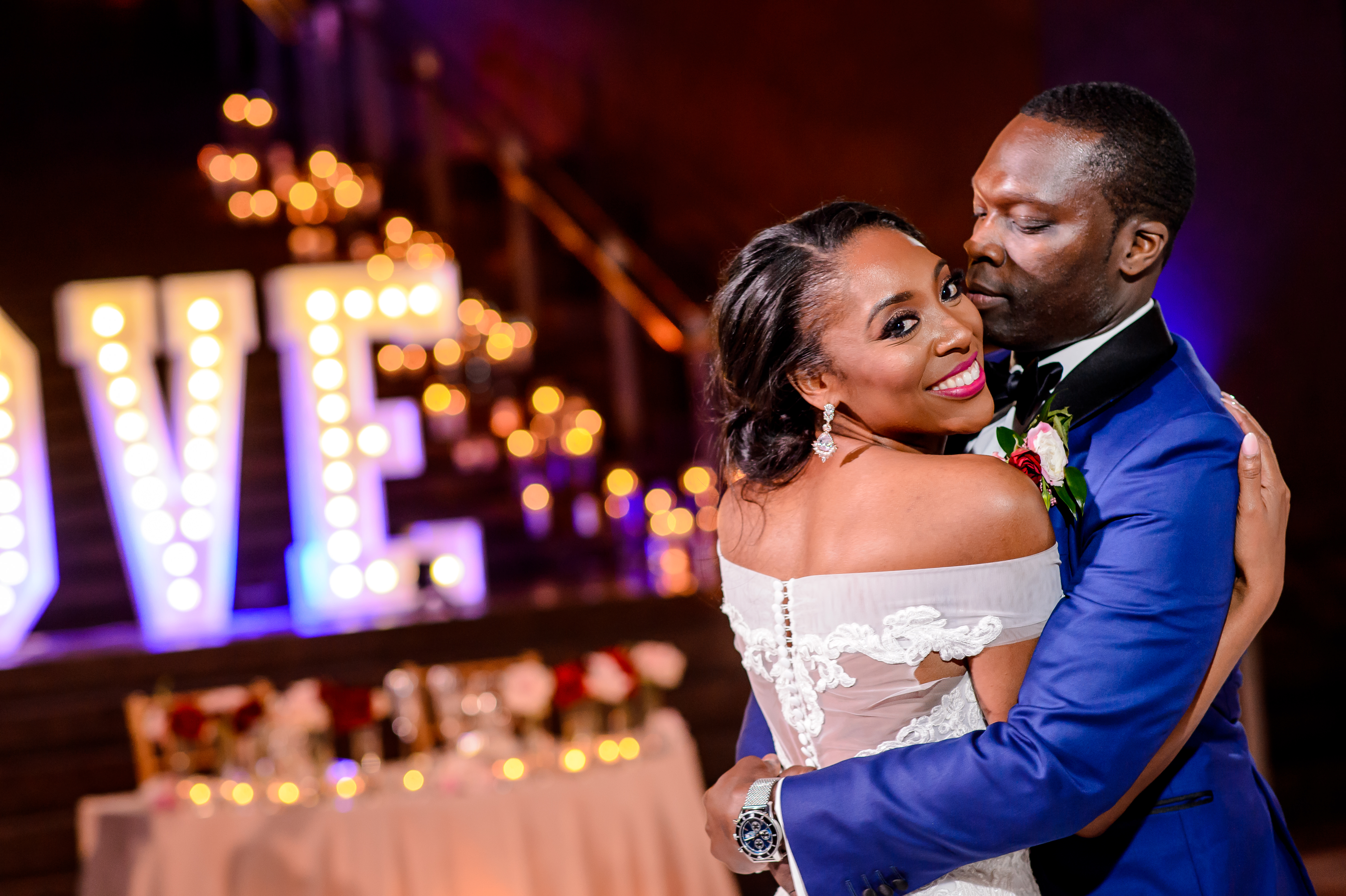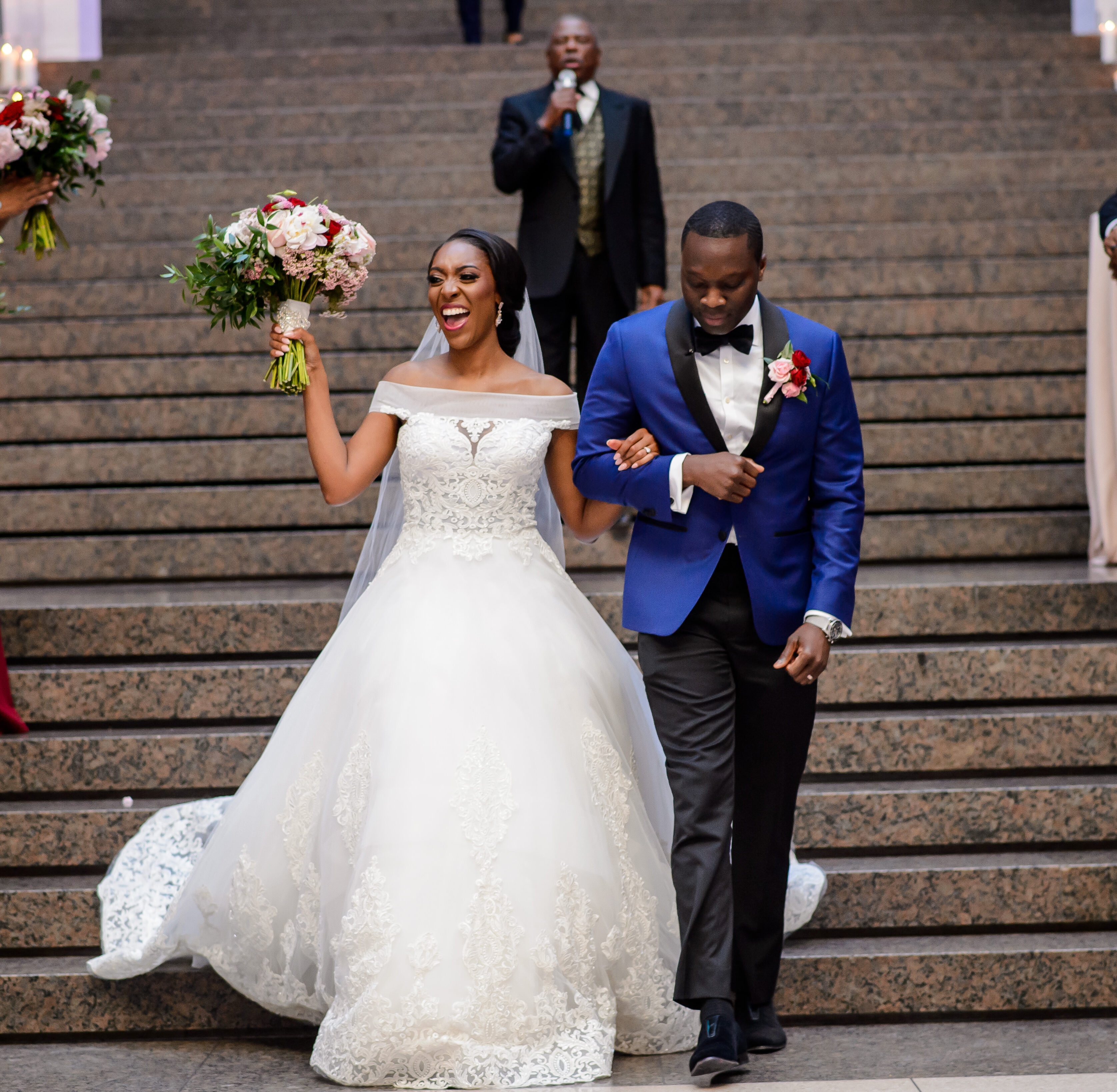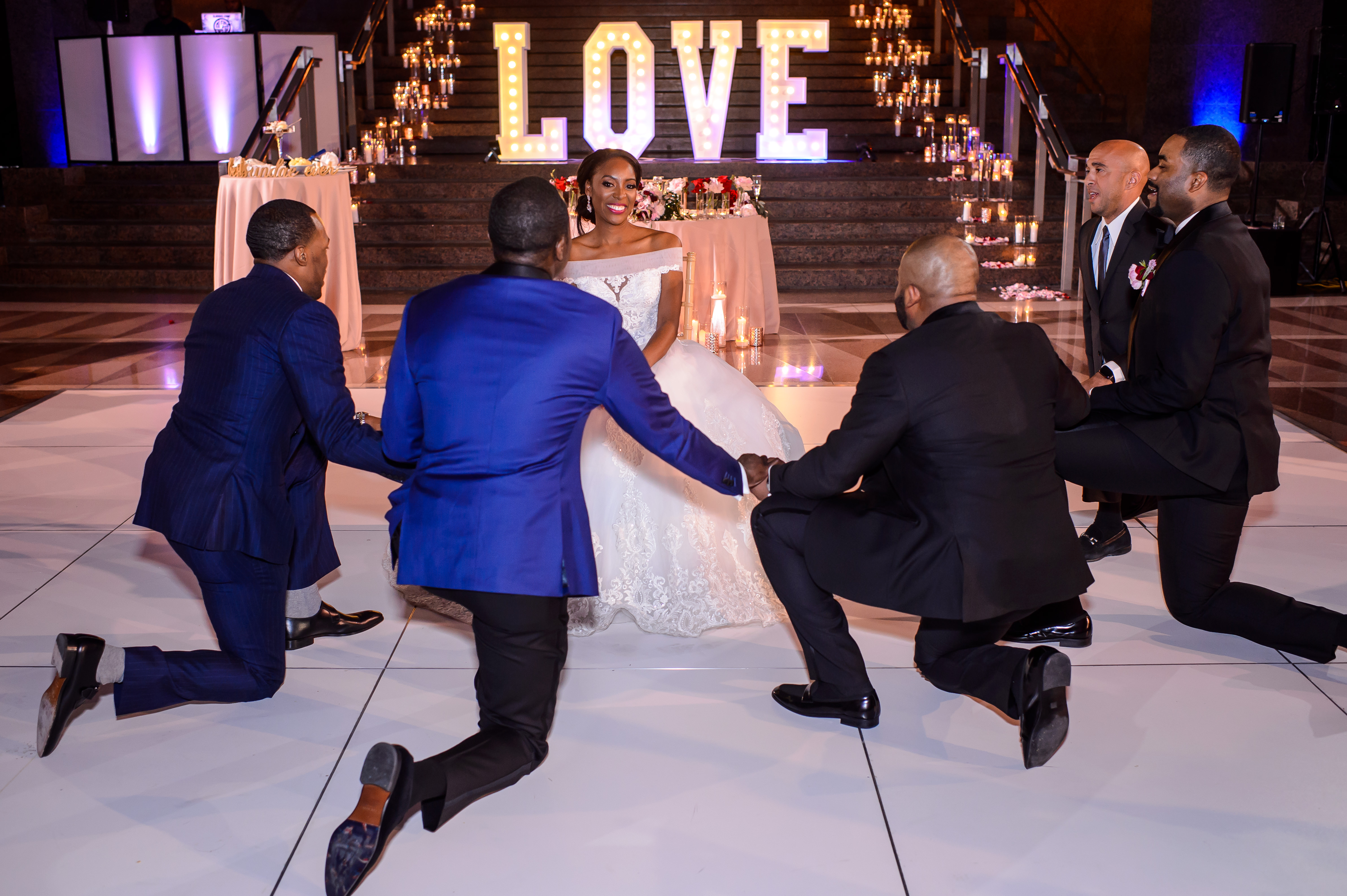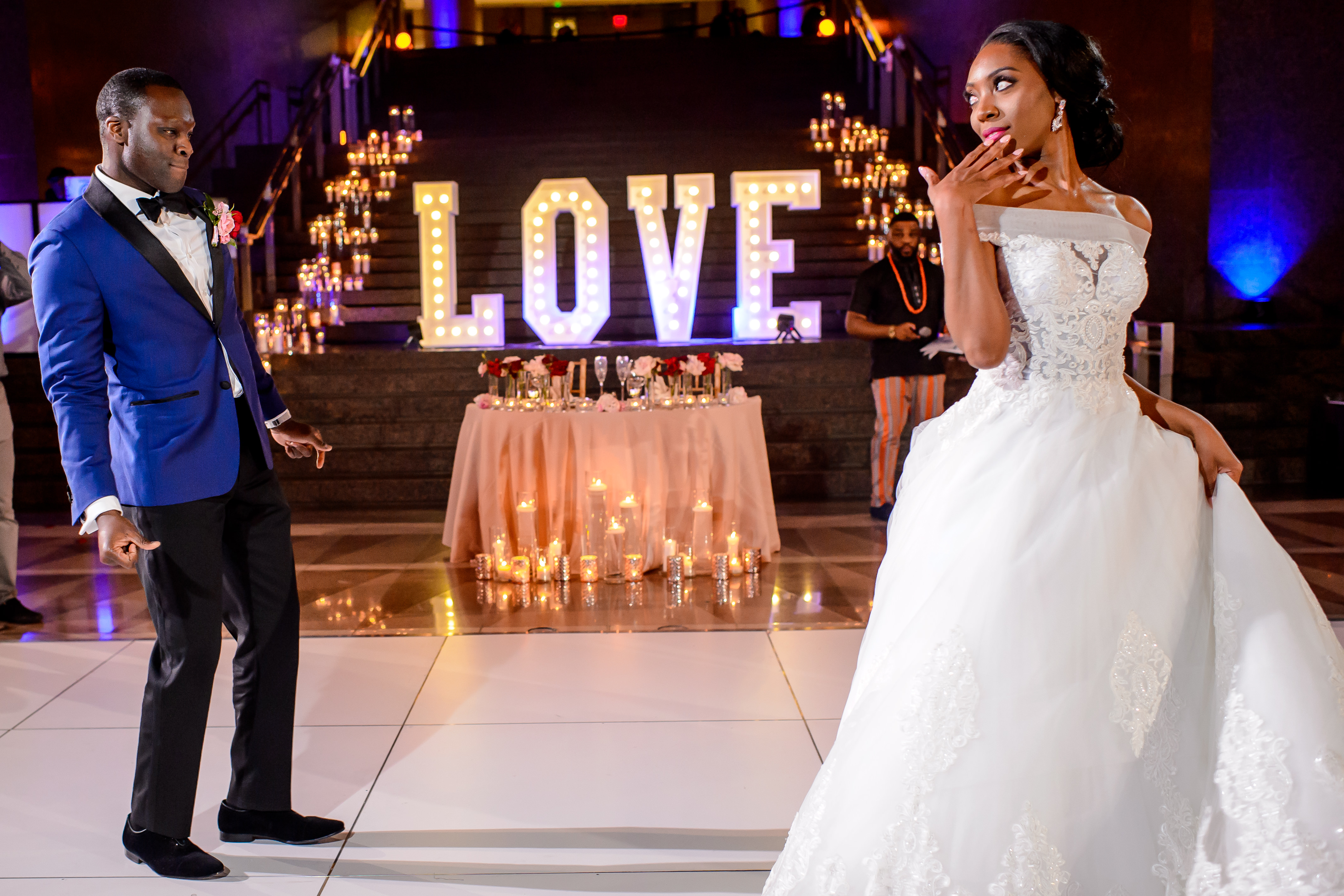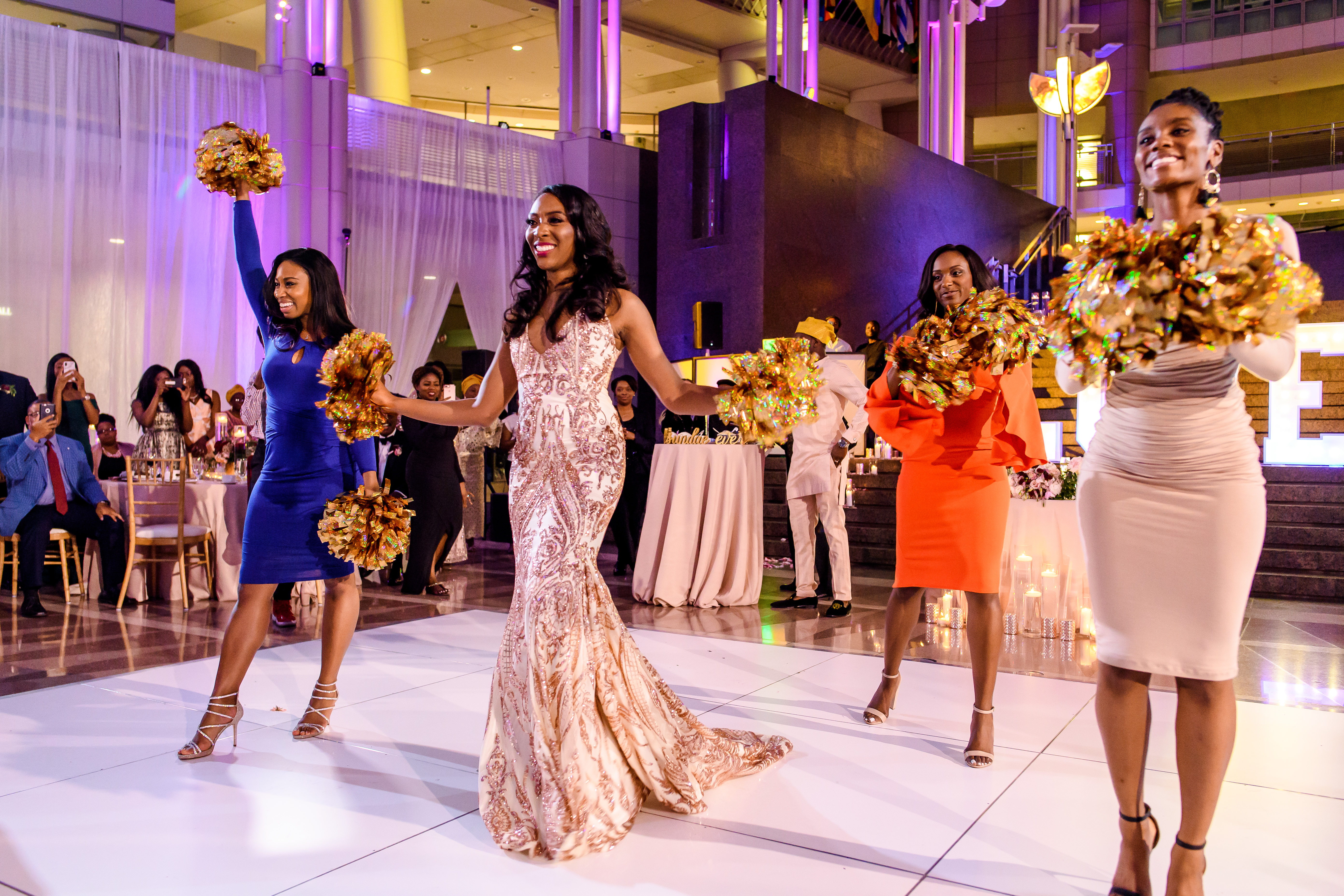 (EMERALD) The best moment of the wedding for me was our grand entrance into the reception. Our guests were expecting us to come from a different direction so to hear their reactions of cheer and surprise as we danced down 30+ stair steps onto the main dance floor was amazing! We felt like Beyonce’ & Jay-Z performing at the Grammy’s. (TOLU) The best moment of the wedding was Emerald’s dance tribute with her former Washington Redskins cheerleader teammates. Tolu met Emerald after her time as a cheerleader, so the wedding was the first time Tolu got to see her perform with pom-poms and friends.