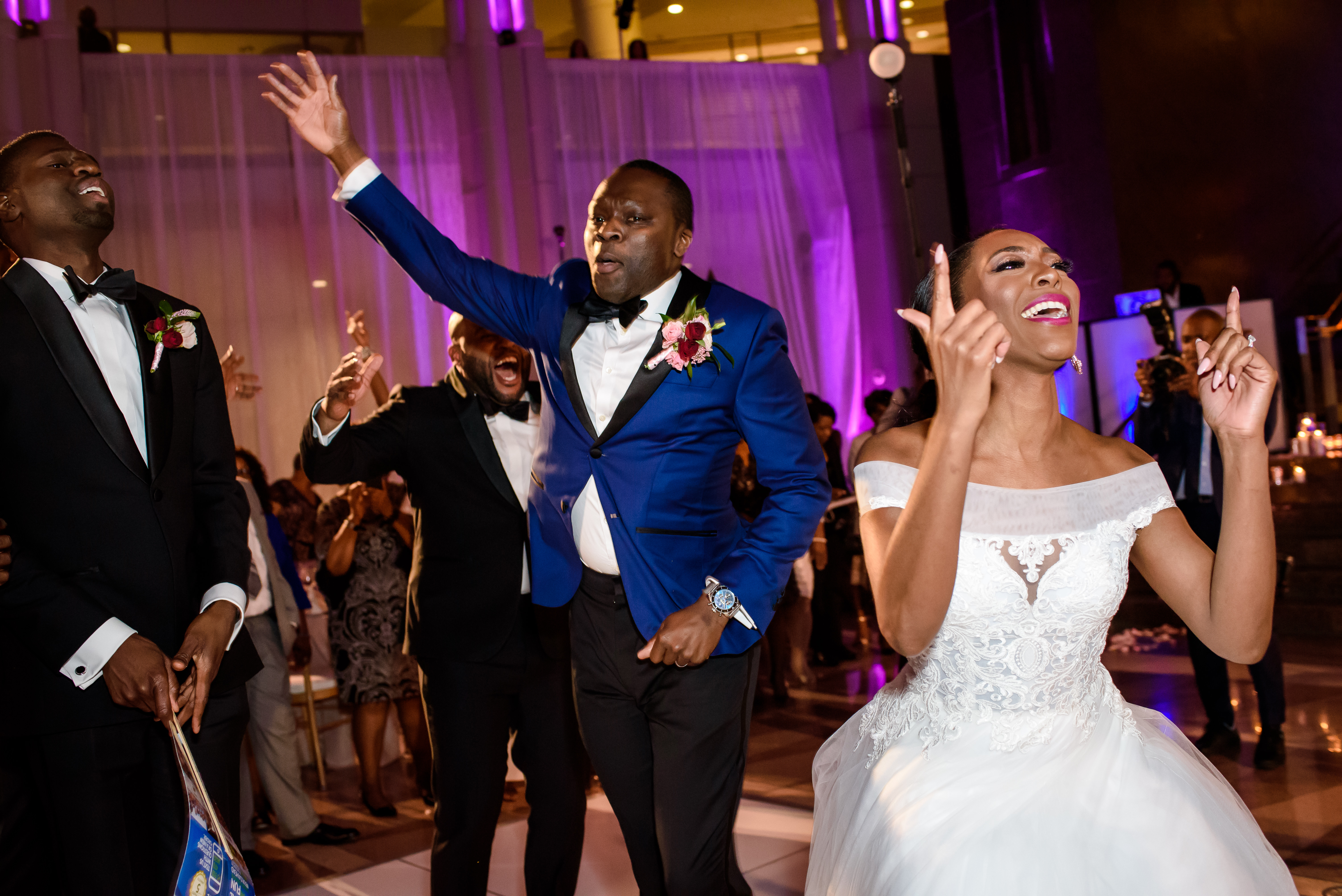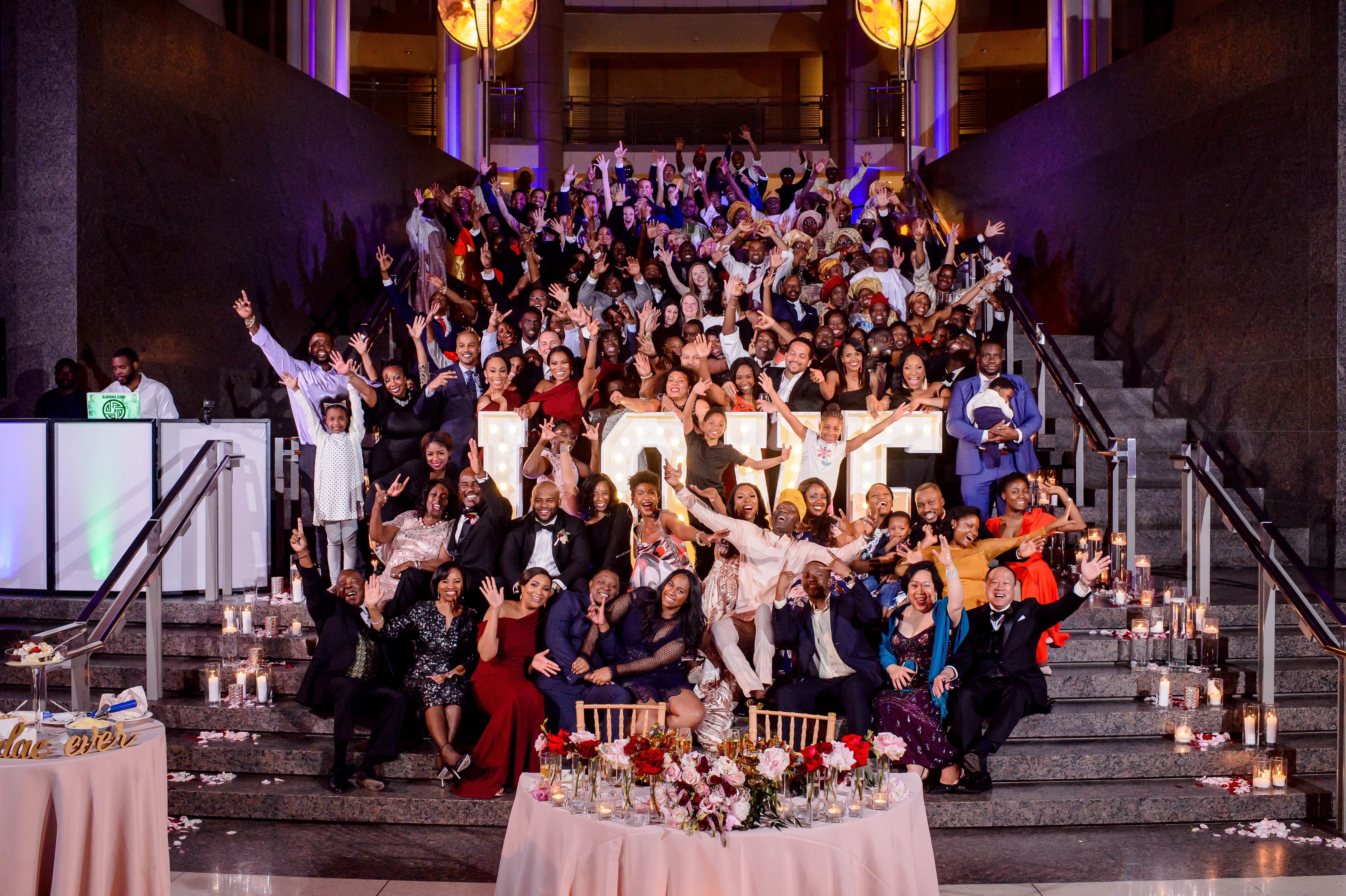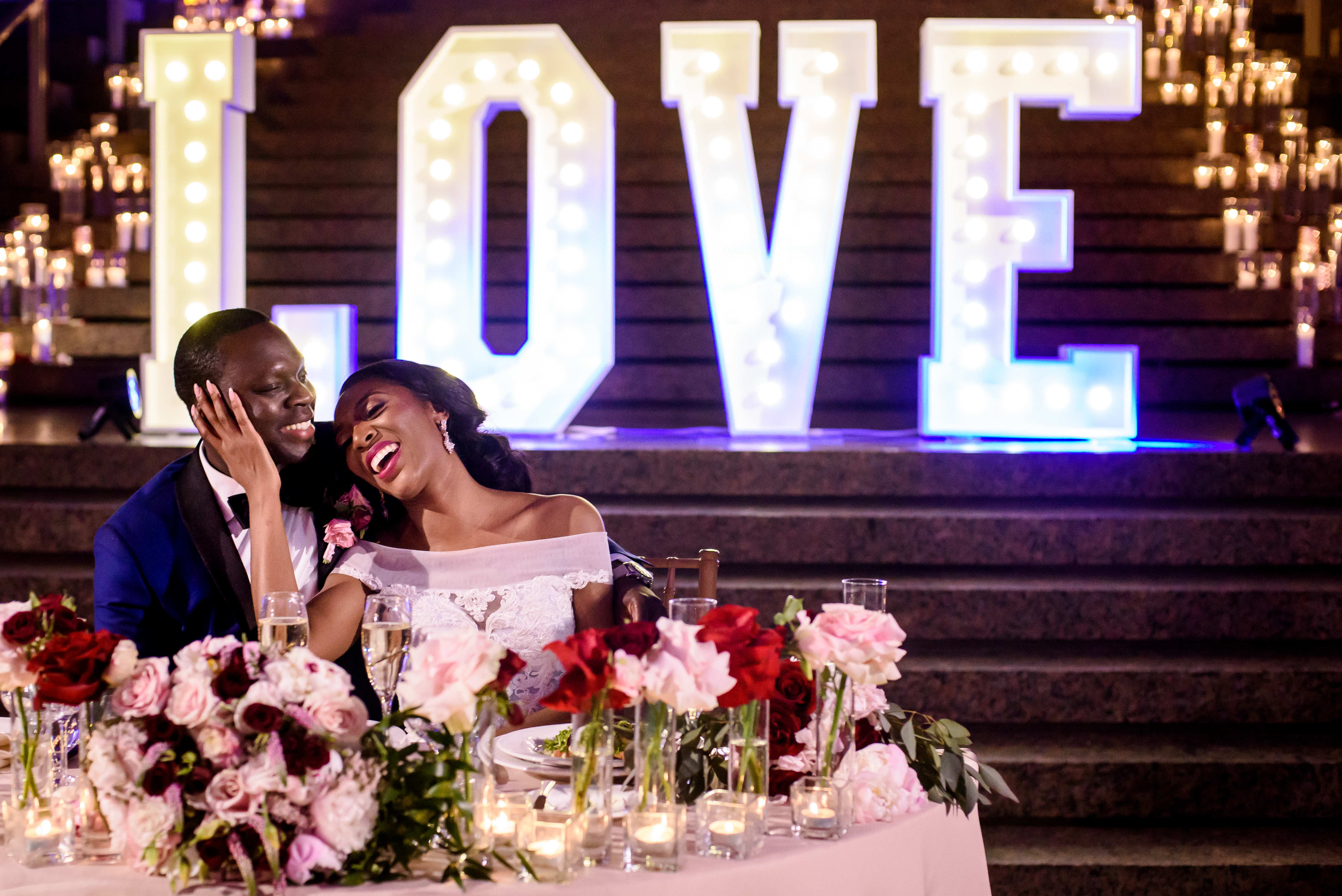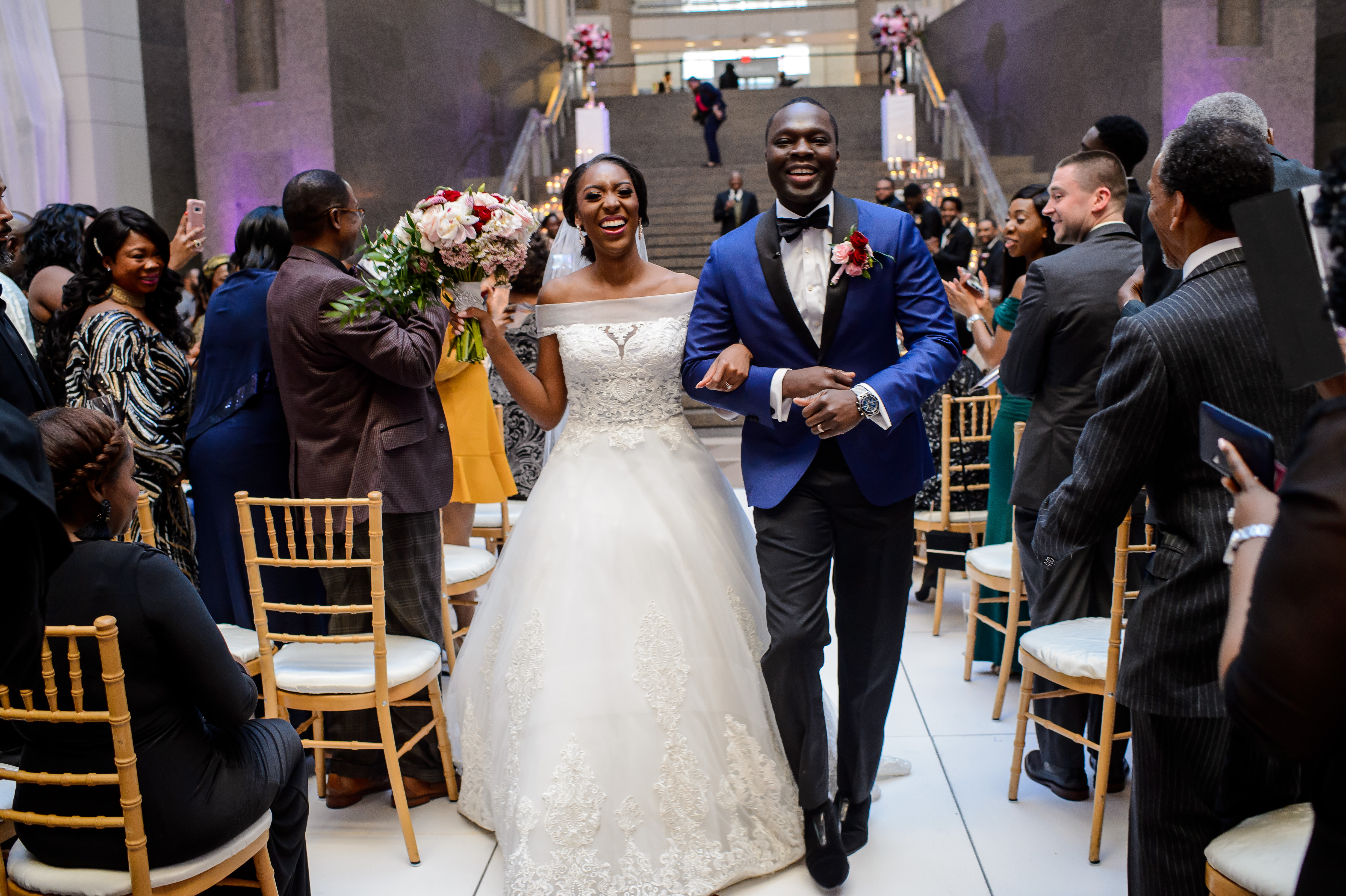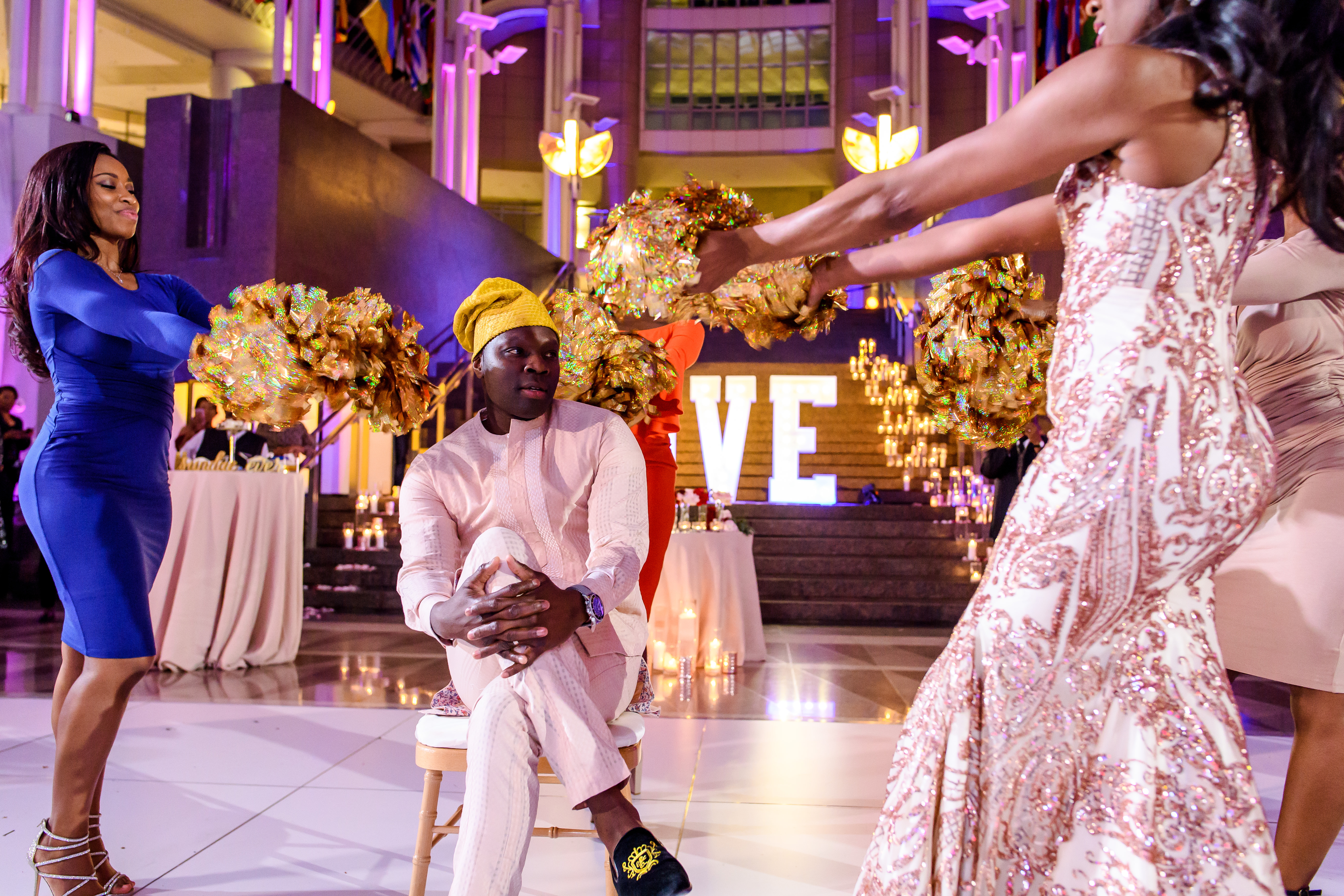 (EMERALD) The best moment of the wedding for me was our grand entrance into the reception. Our guests were expecting us to come from a different direction so to hear their reactions of cheer and surprise as we danced down 30+ stair steps onto the main dance floor was amazing! We felt like Beyonce’ & Jay-Z performing at the Grammy’s. (TOLU) The best moment of the wedding was Emerald’s dance tribute with her former Washington Redskins cheerleader teammates. Tolu met Emerald after her time as a cheerleader, so the wedding was the first time Tolu got to see her perform with pom-poms and friends.