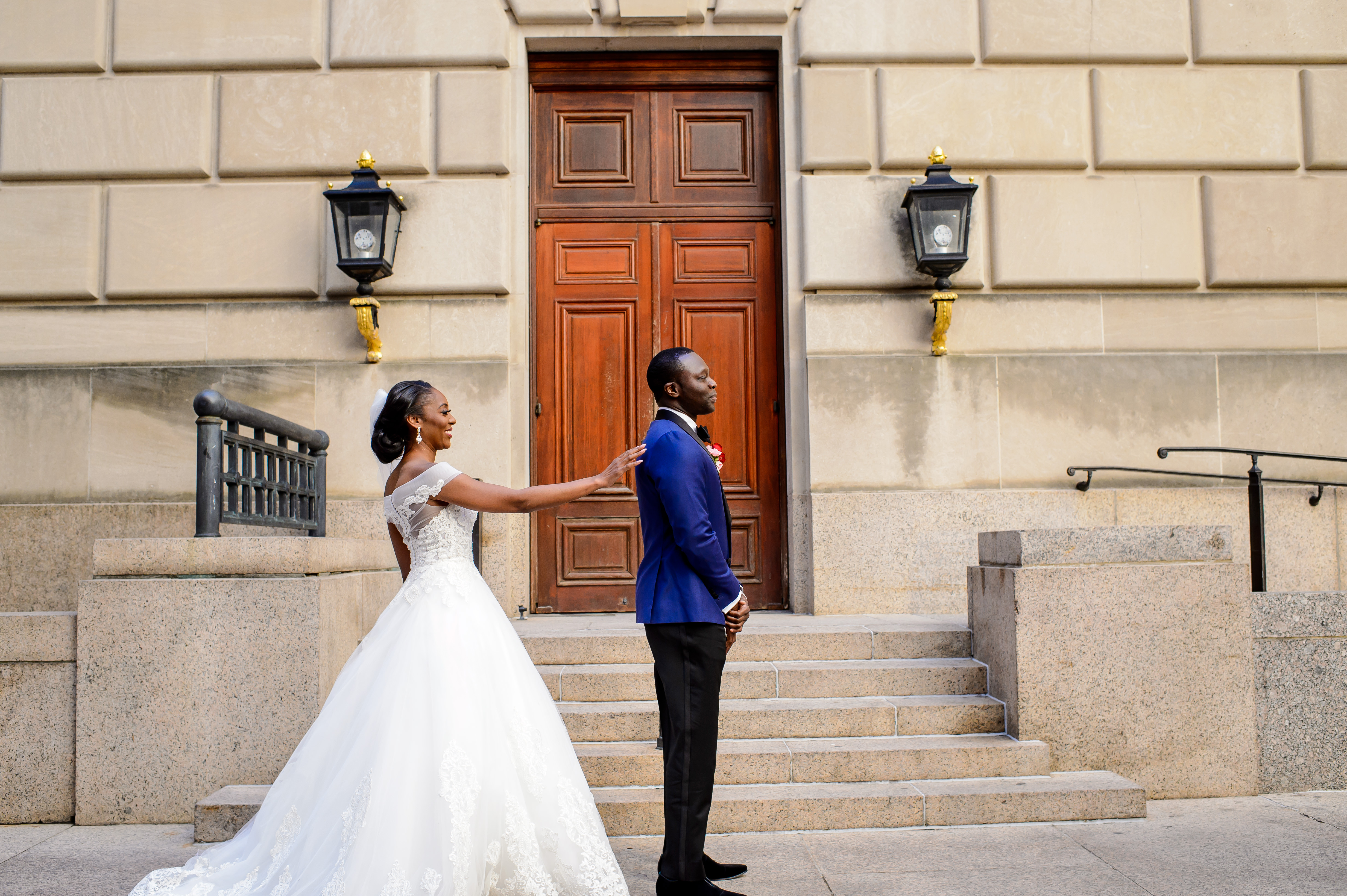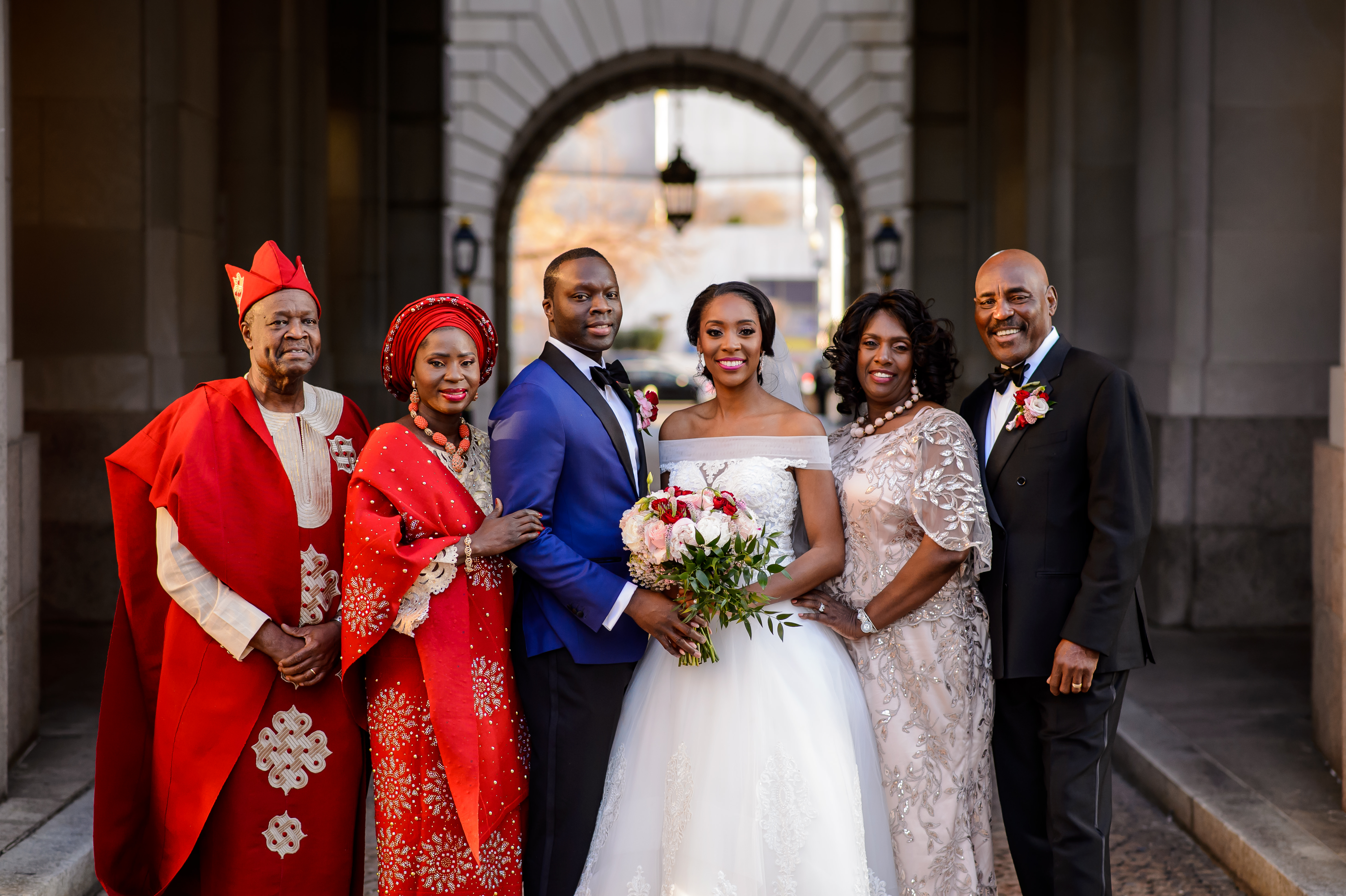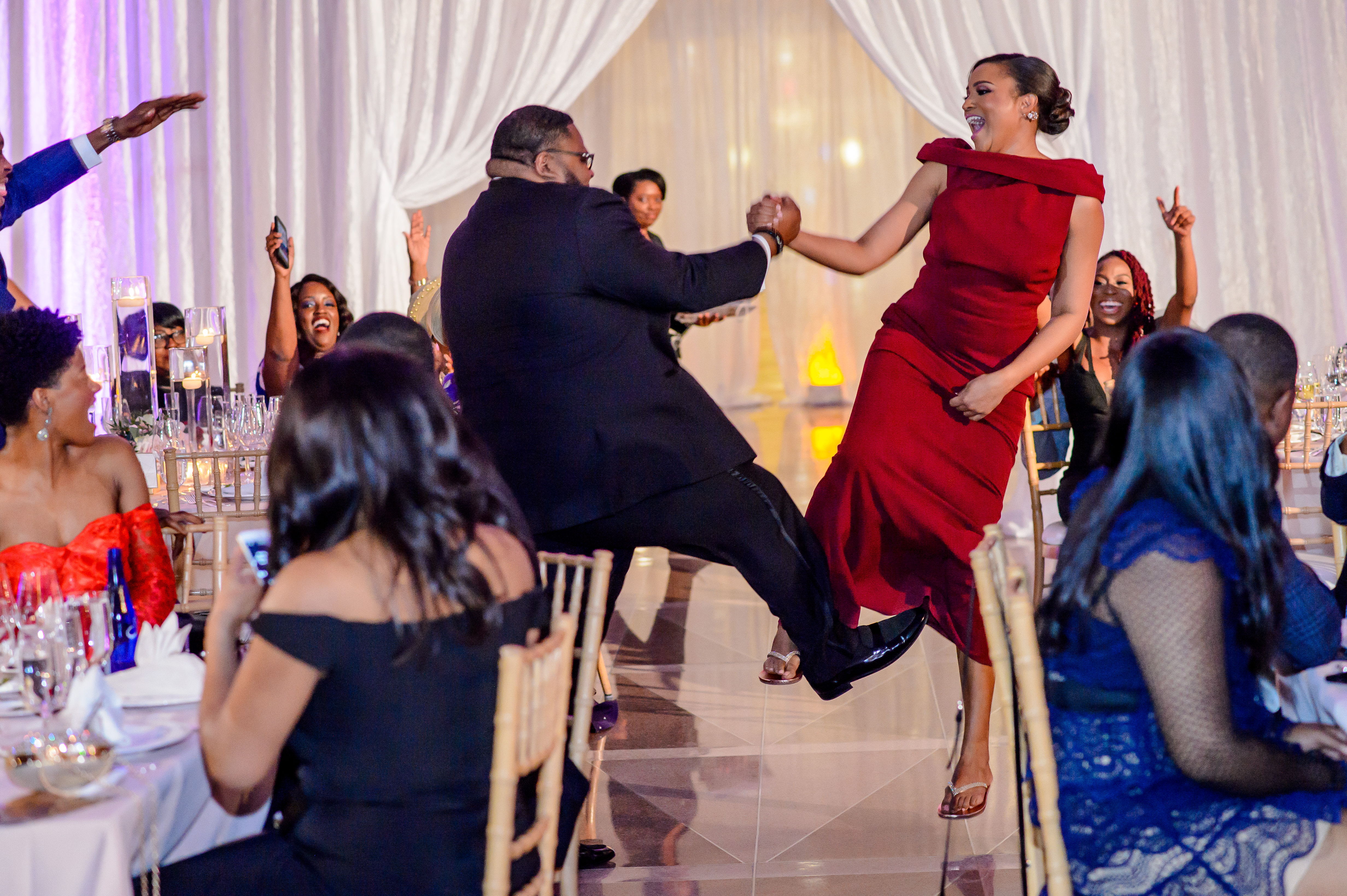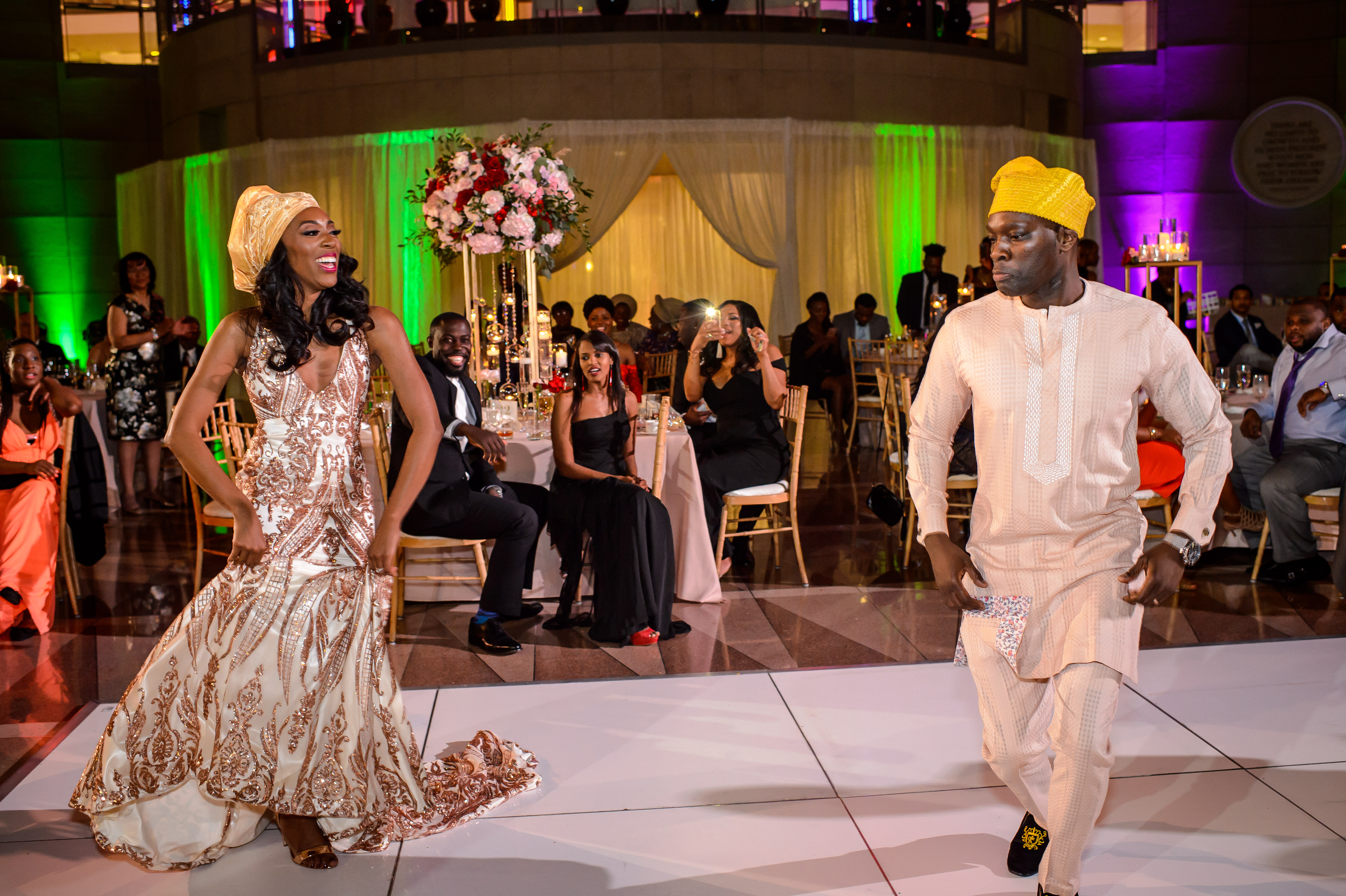 (EMERALD) The best moment of the wedding for me was our grand entrance into the reception. Our guests were expecting us to come from a different direction so to hear their reactions of cheer and surprise as we danced down 30+ stair steps onto the main dance floor was amazing! We felt like Beyonce’ & Jay-Z performing at the Grammy’s. (TOLU) The best moment of the wedding was Emerald’s dance tribute with her former Washington Redskins cheerleader teammates. Tolu met Emerald after her time as a cheerleader, so the wedding was the first time Tolu got to see her perform with pom-poms and friends.