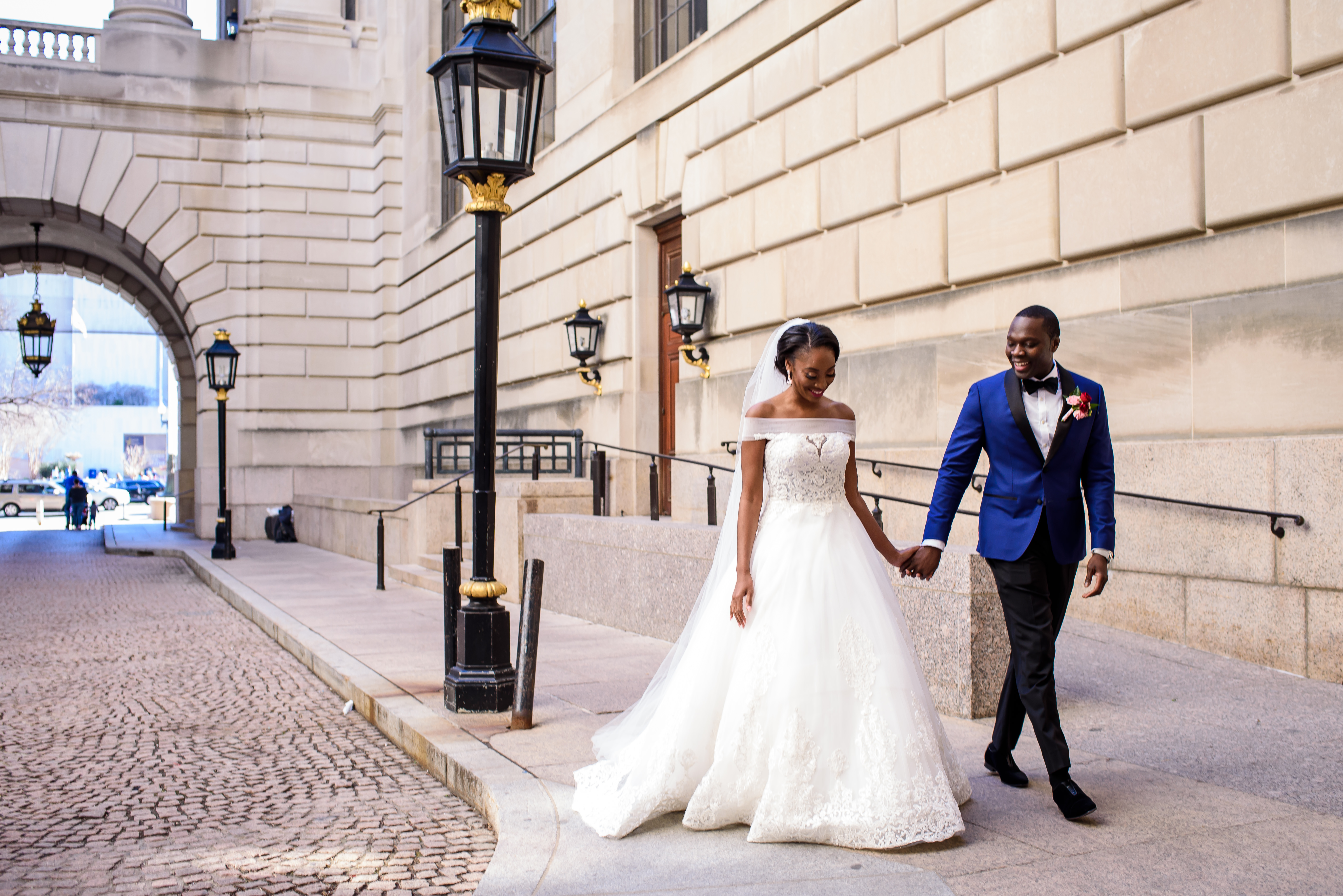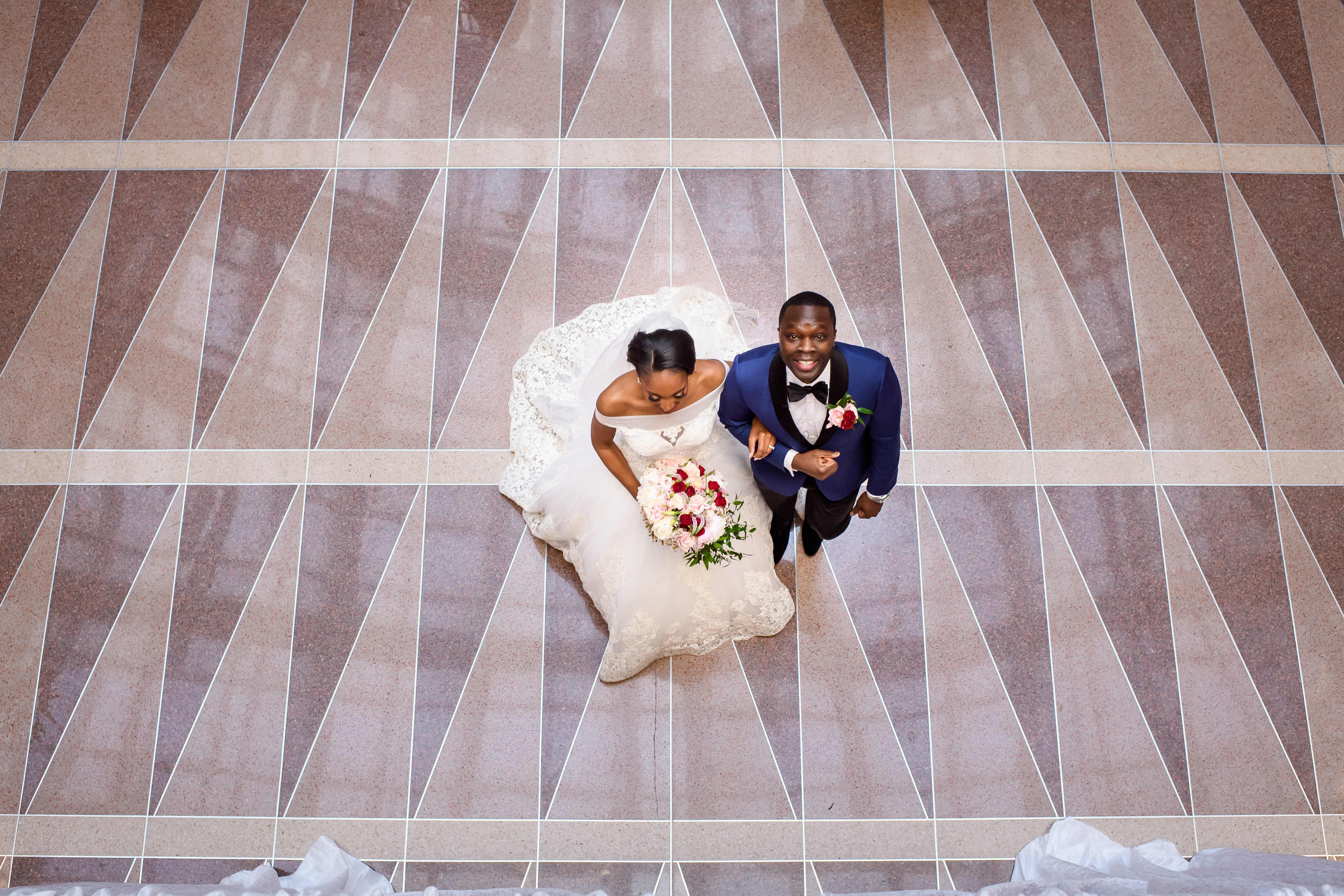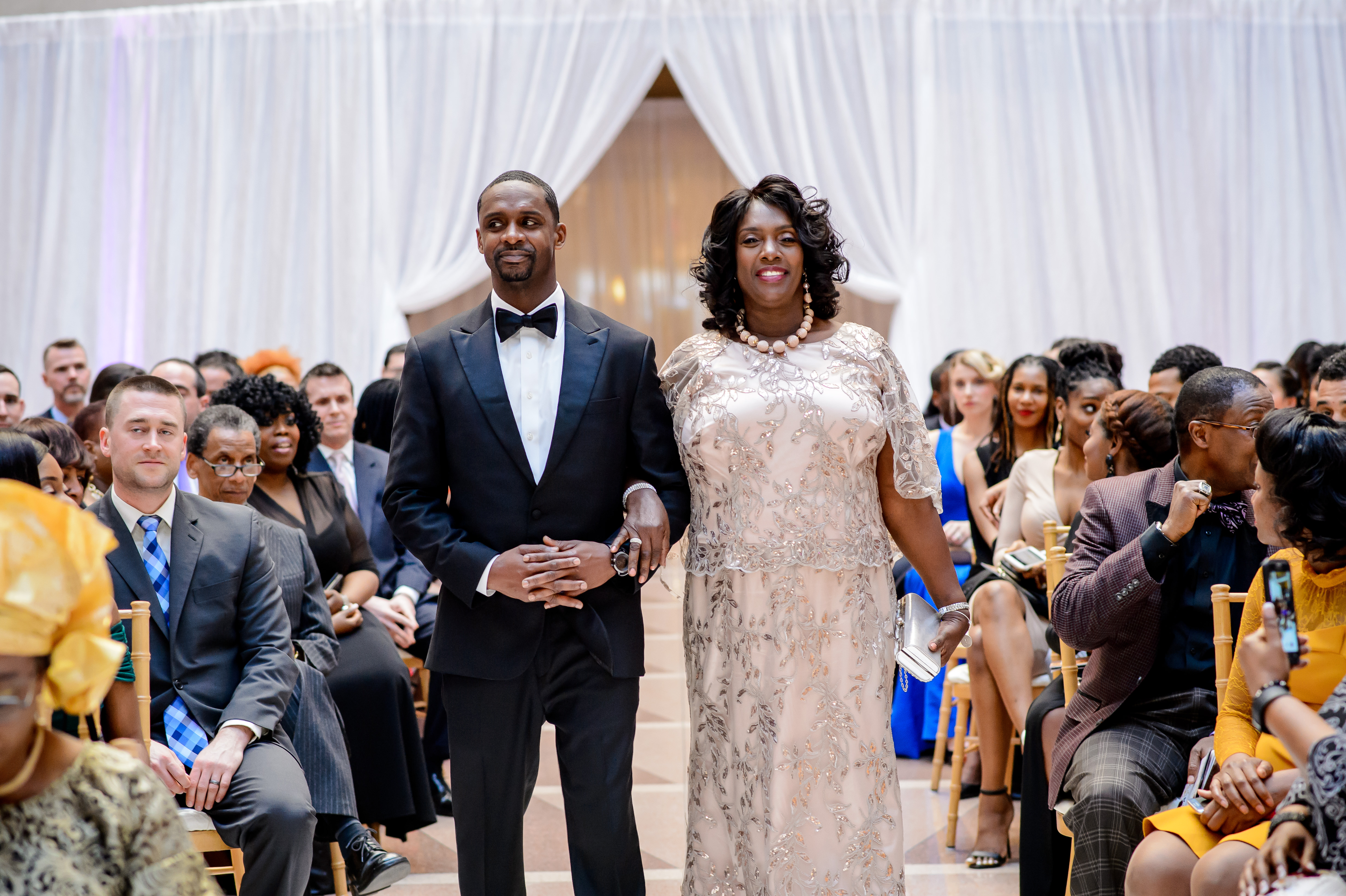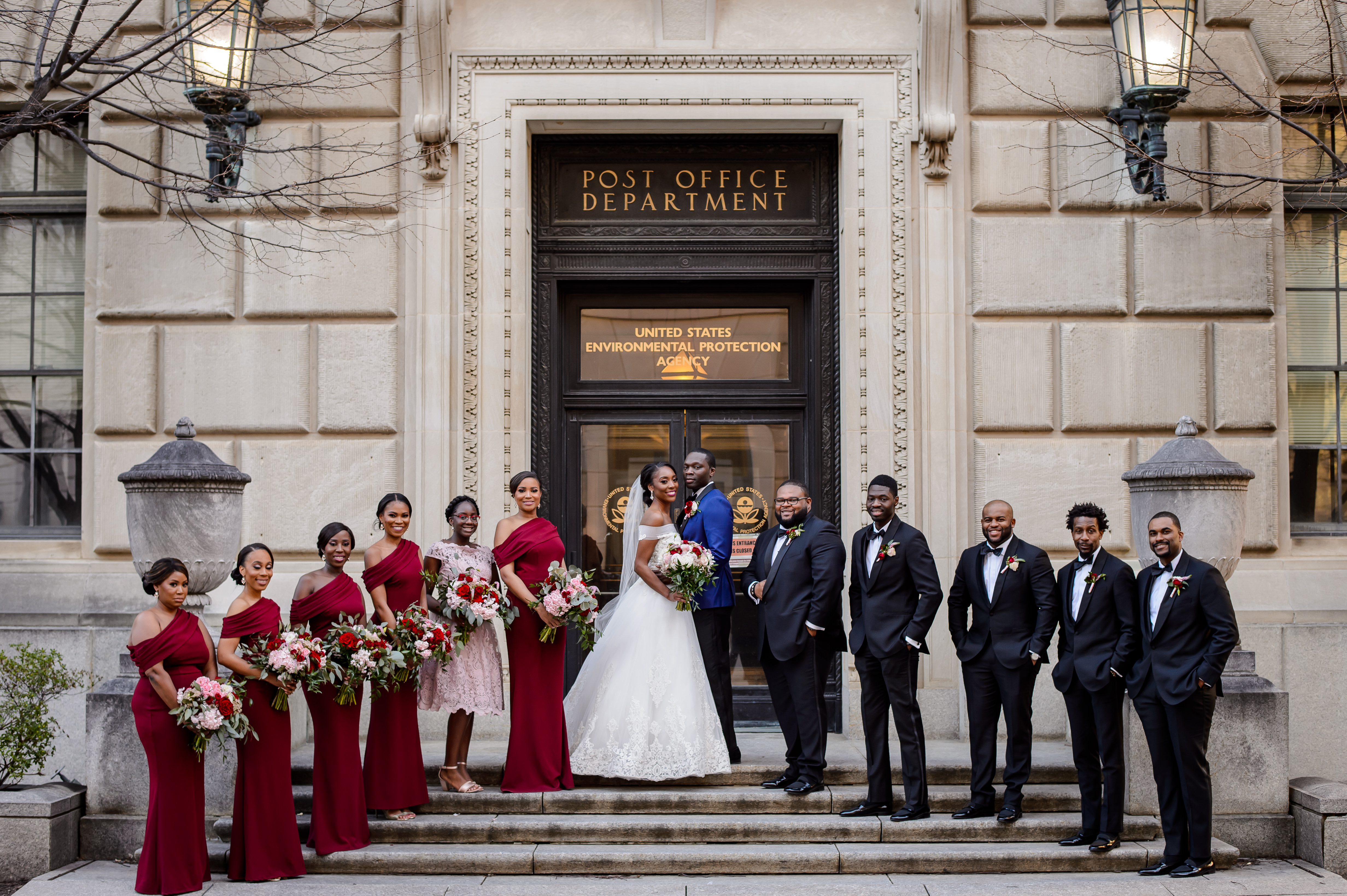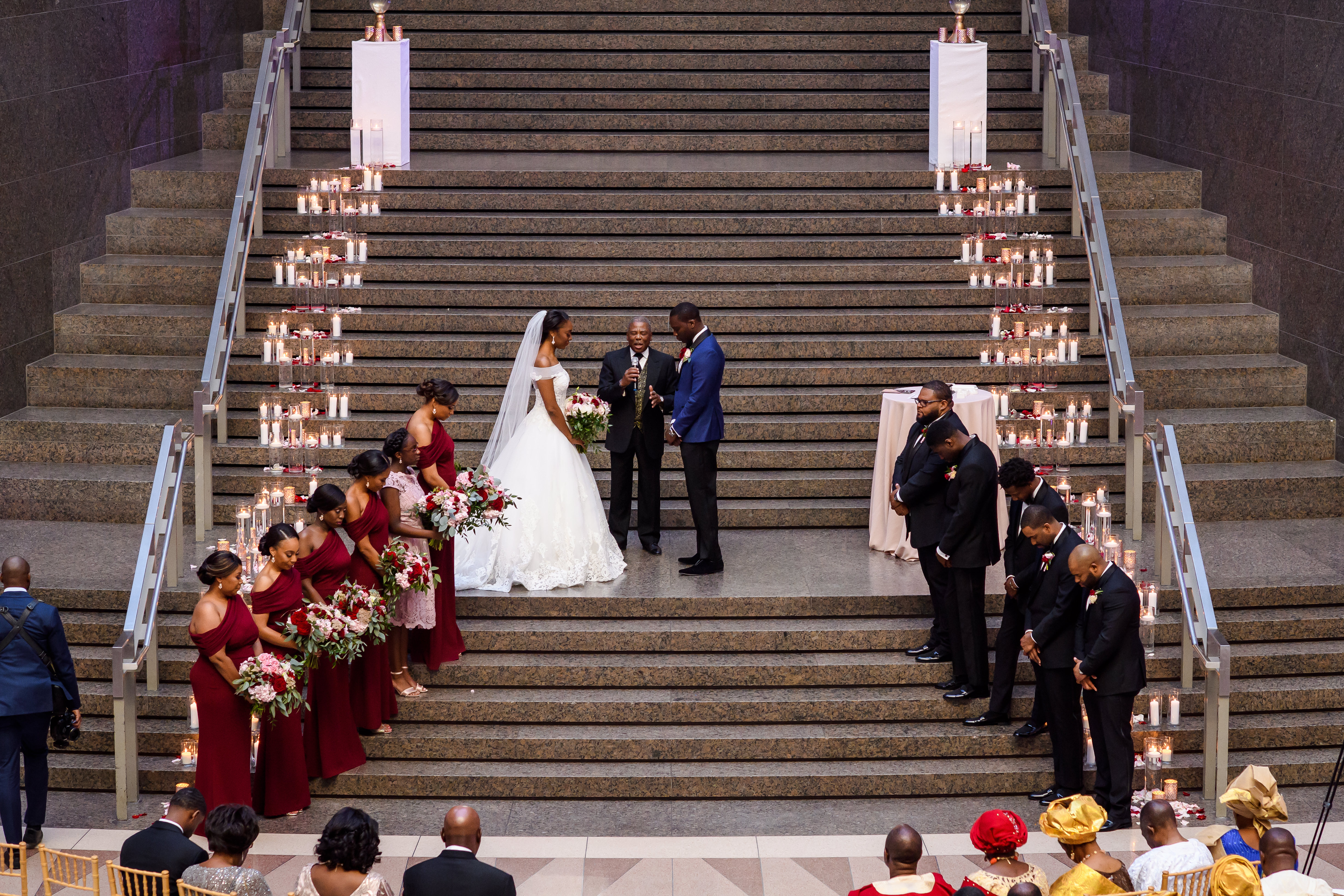 (EMERALD) The best moment of the wedding for me was our grand entrance into the reception. Our guests were expecting us to come from a different direction so to hear their reactions of cheer and surprise as we danced down 30+ stair steps onto the main dance floor was amazing! We felt like Beyonce’ & Jay-Z performing at the Grammy’s. (TOLU) The best moment of the wedding was Emerald’s dance tribute with her former Washington Redskins cheerleader teammates. Tolu met Emerald after her time as a cheerleader, so the wedding was the first time Tolu got to see her perform with pom-poms and friends.