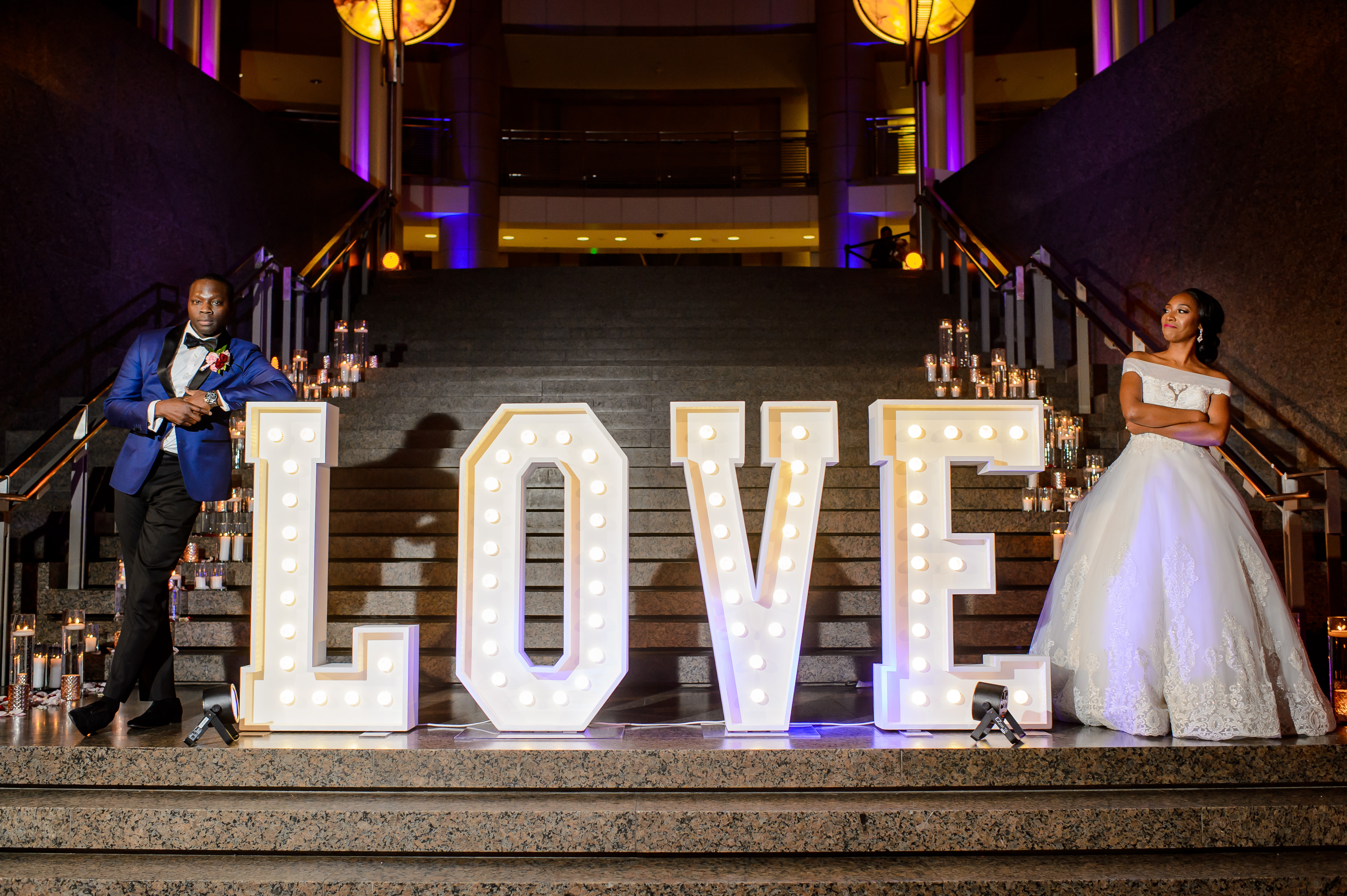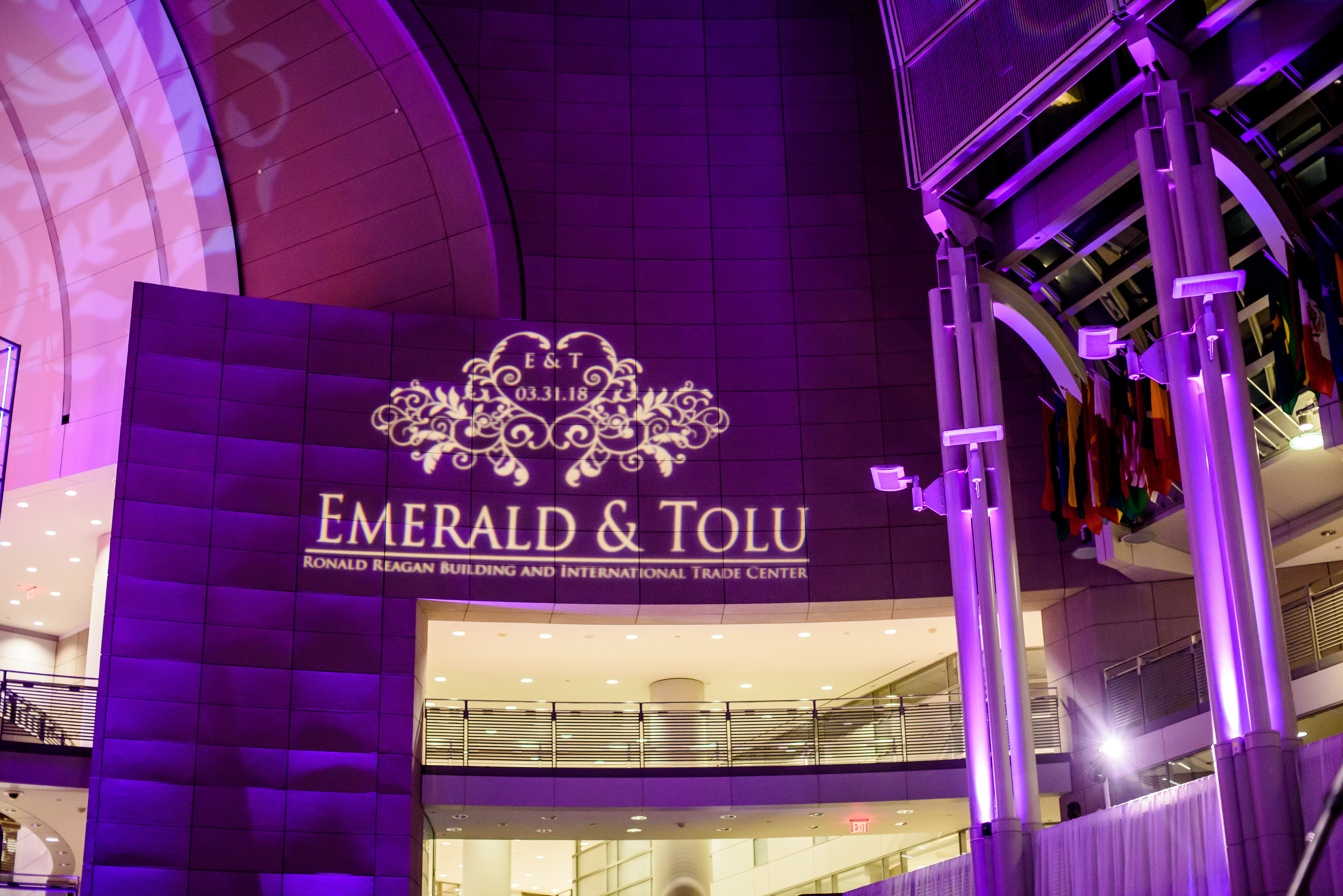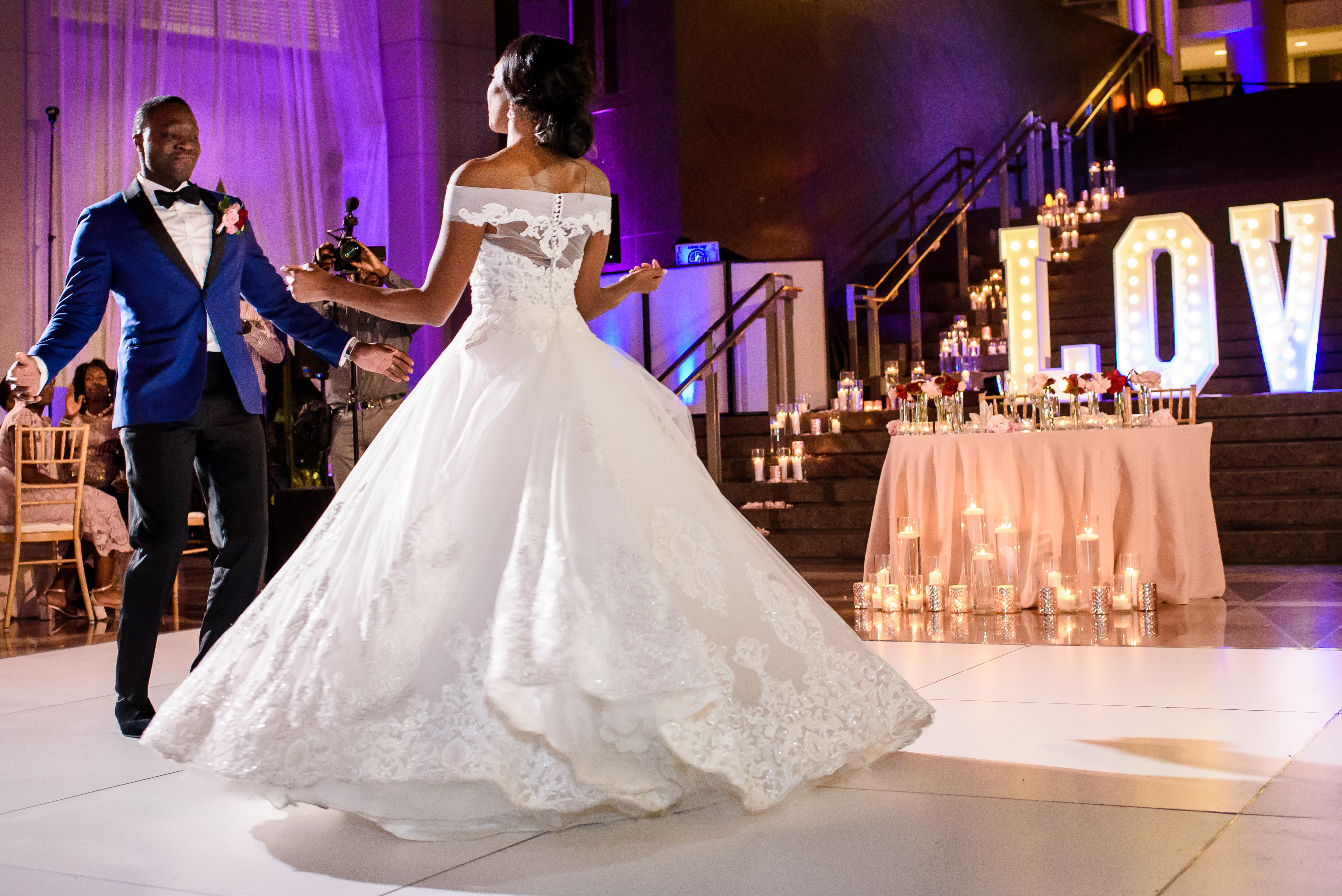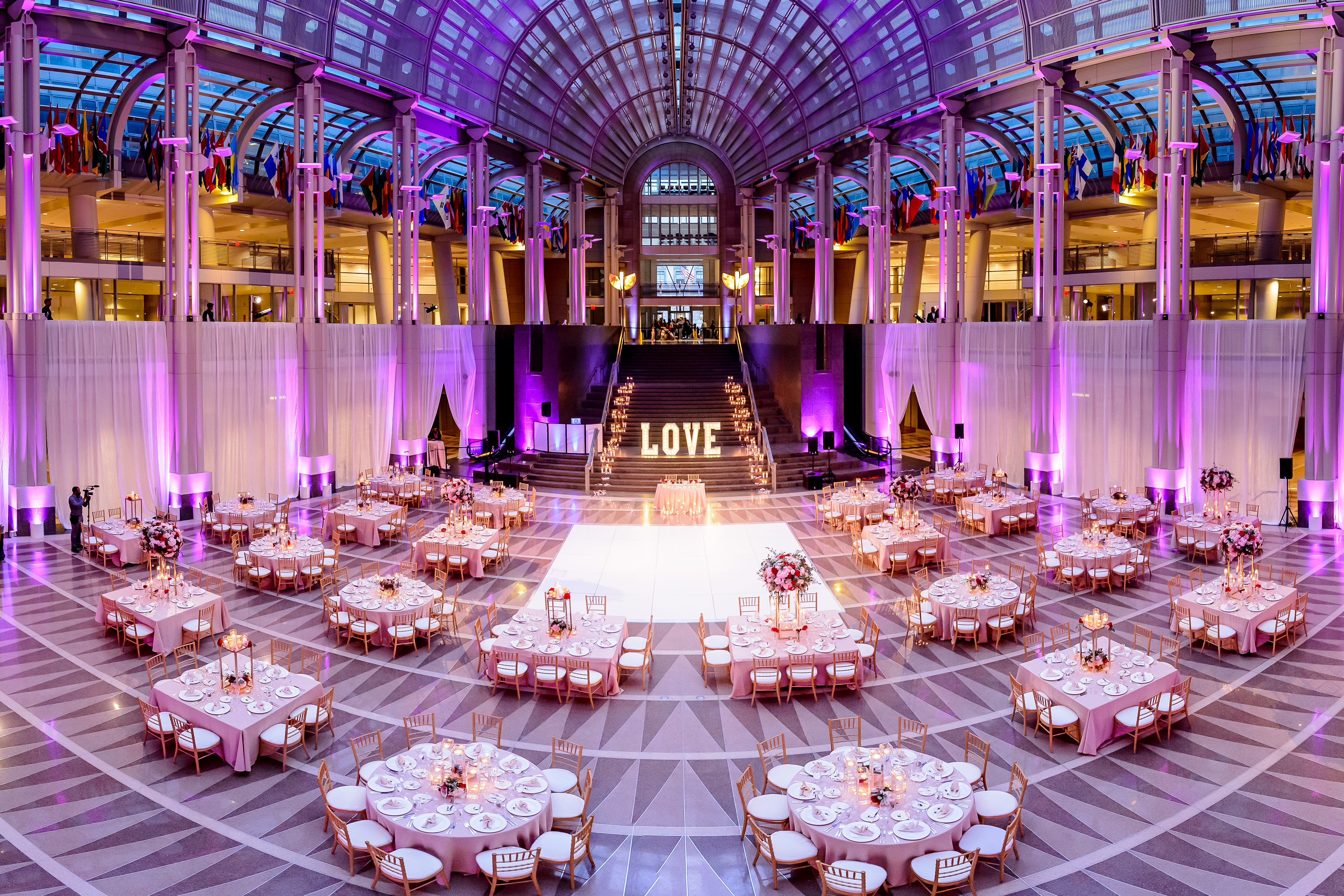 Location – Ronald Reagan International Trade Center • Photography – Joshua Dwain Photography • Florals – BCG Events • Videography – The Media Experience Film House • Deejay – DJ Donx • Ceremony Musician – Chelsey Green • Stationery – Taylor & Hov • Linens – BBJ Linens • LOVE Letters – Brightly EverAfter • Draping – Fabrication Events • Lighting, Dance Floor – The Light Source Company • Officiant – Reverend Dr. Williams • Hair Stylist – Tress Art Hair • Make-Up Artist – Irie Jade Beauty • Transportation – Reston Limousine • Rehearsal Dinner – Old Ebbitt Grill •