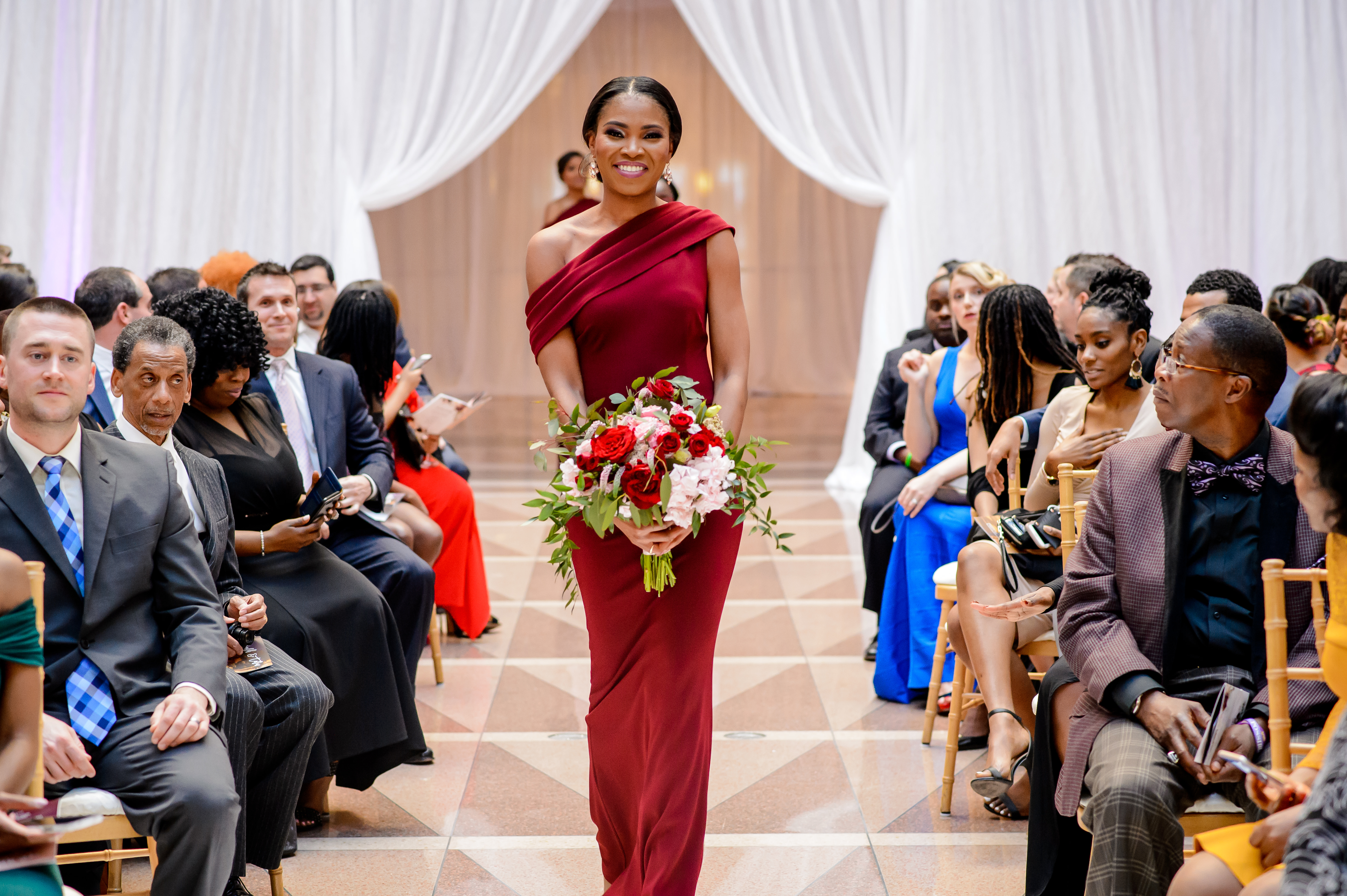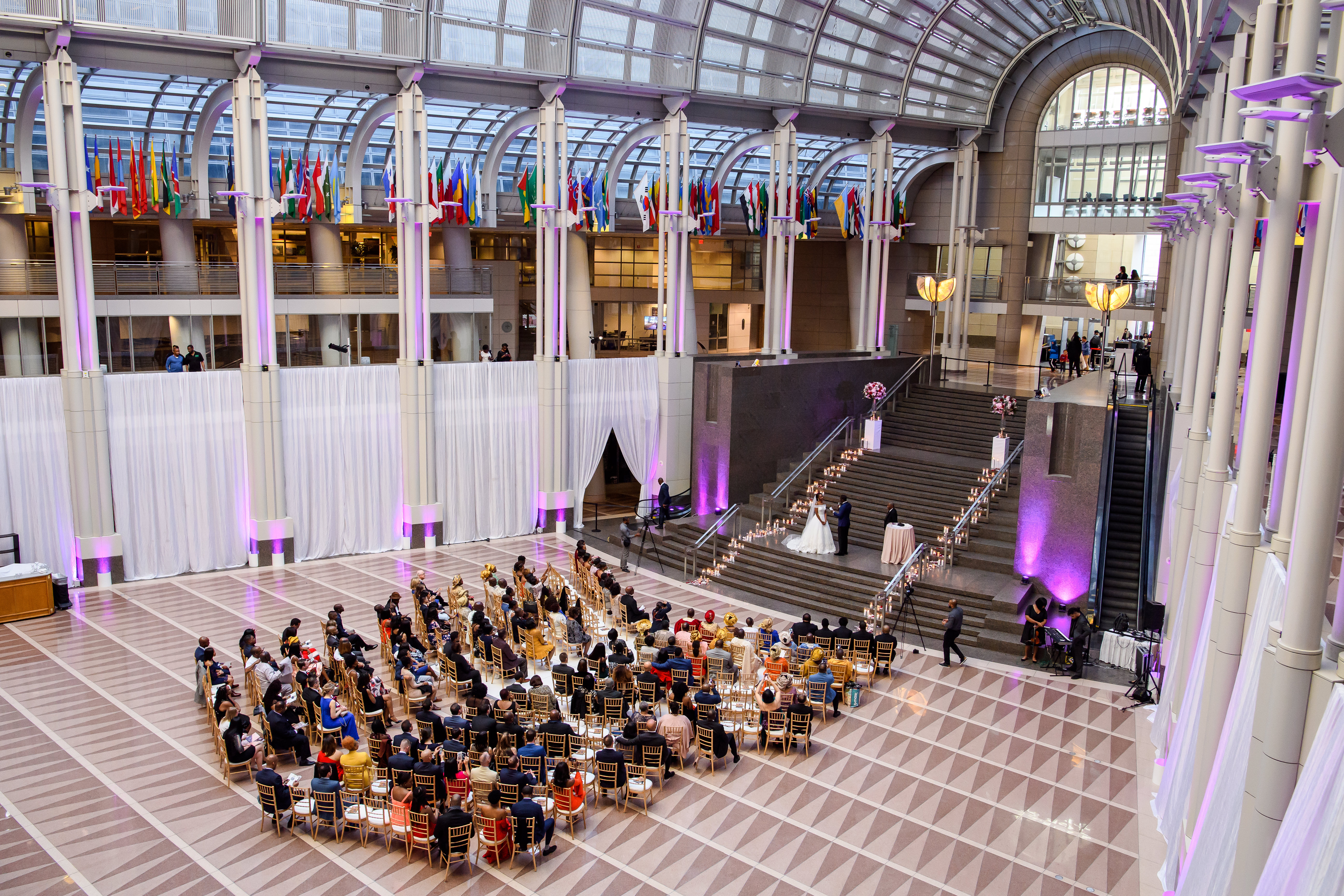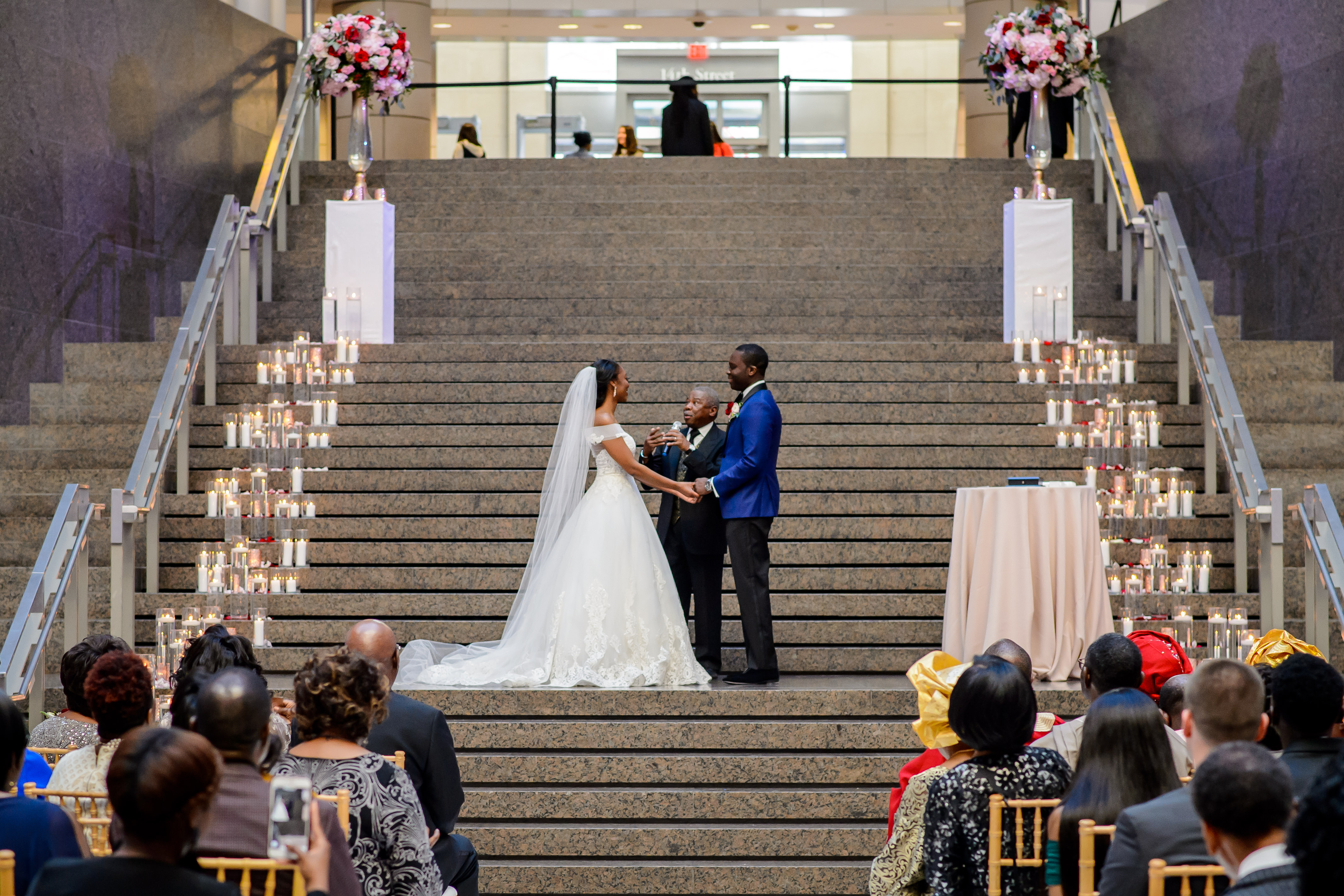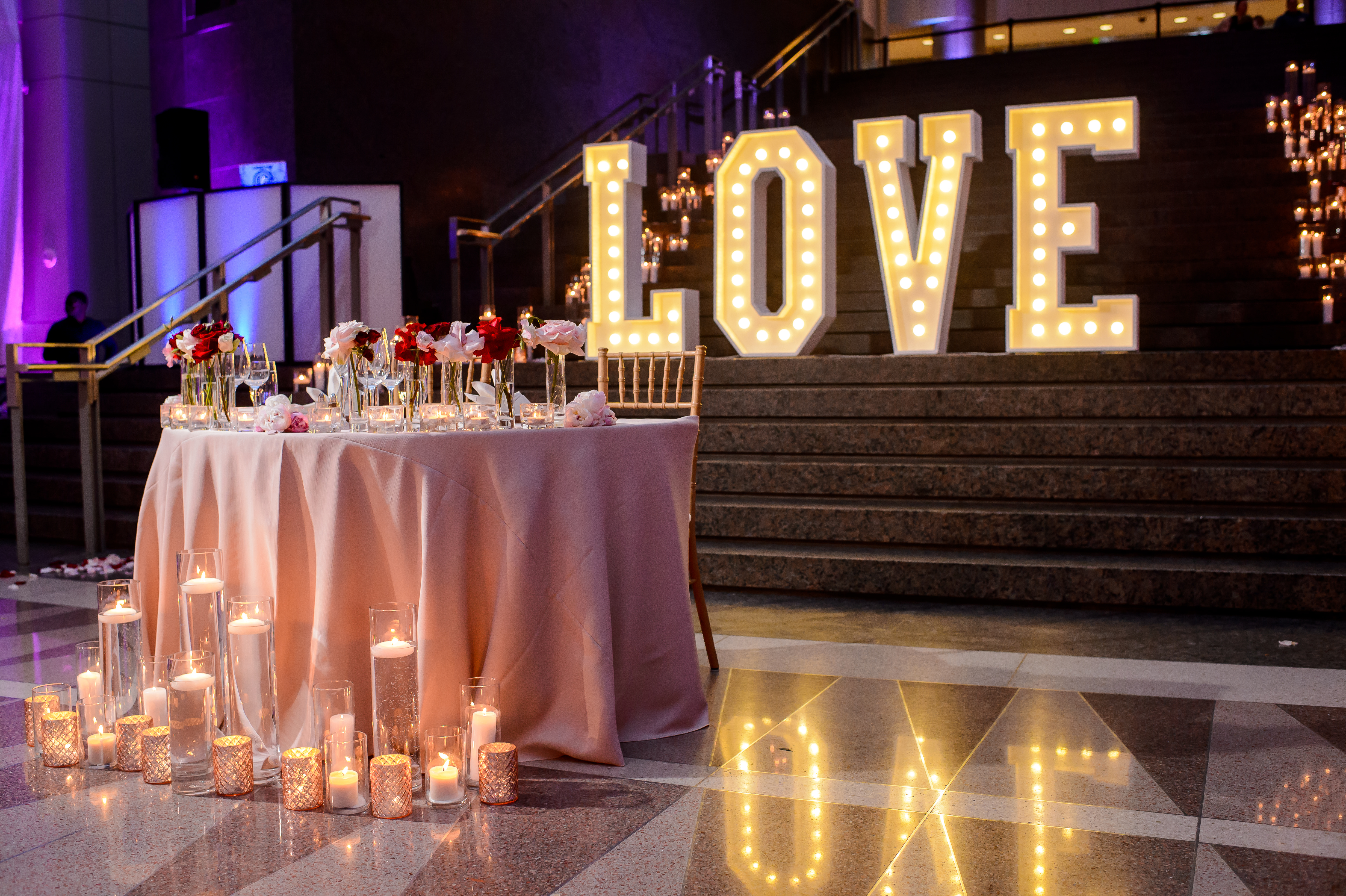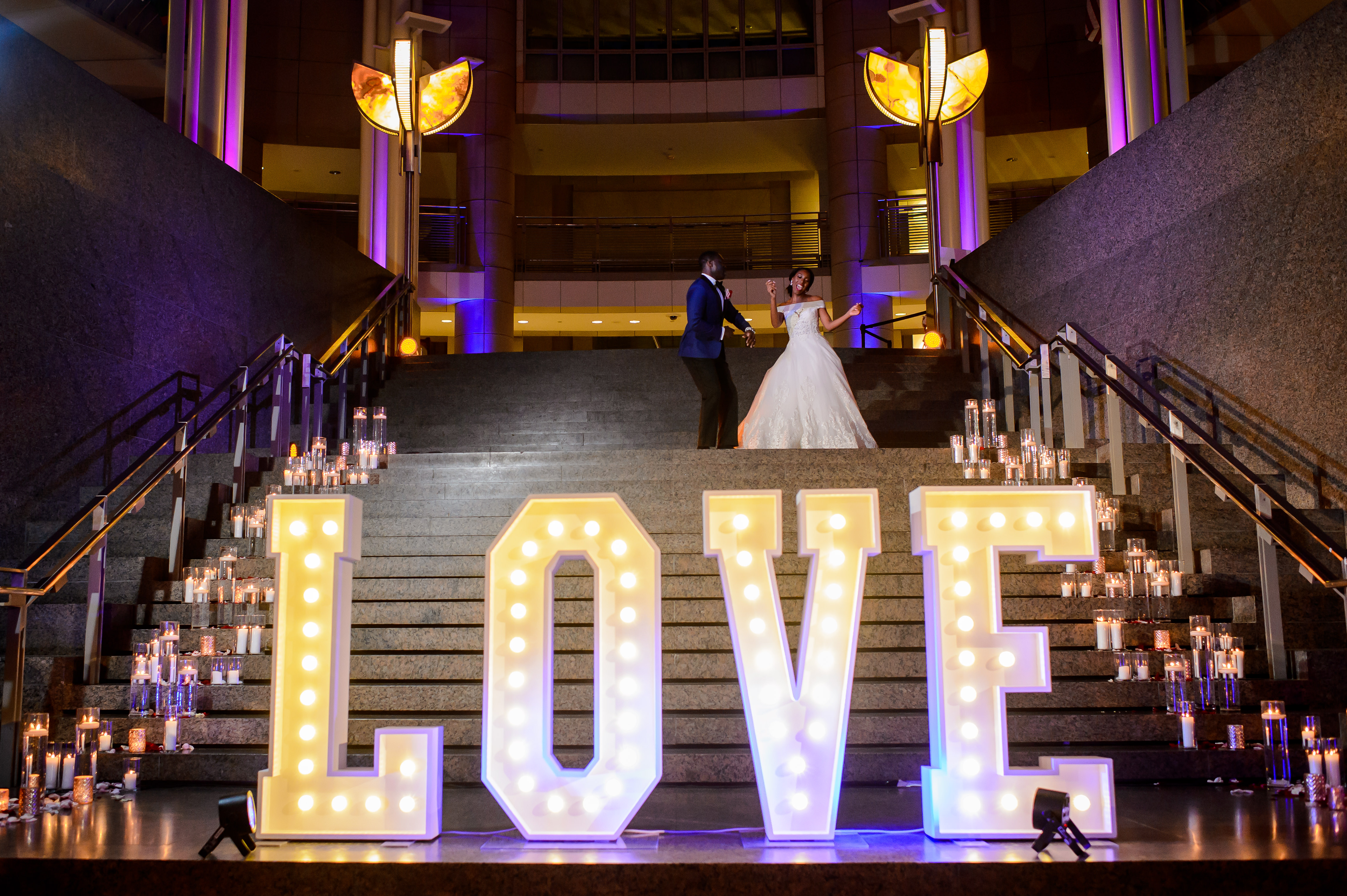 Location – Ronald Reagan International Trade Center • Photography – Joshua Dwain Photography • Florals – BCG Events • Videography – The Media Experience Film House • Deejay – DJ Donx • Ceremony Musician – Chelsey Green • Stationery – Taylor & Hov • Linens – BBJ Linens • LOVE Letters – Brightly EverAfter • Draping – Fabrication Events • Lighting, Dance Floor – The Light Source Company • Officiant – Reverend Dr. Williams • Hair Stylist – Tress Art Hair • Make-Up Artist – Irie Jade Beauty • Transportation – Reston Limousine • Rehearsal Dinner – Old Ebbitt Grill •