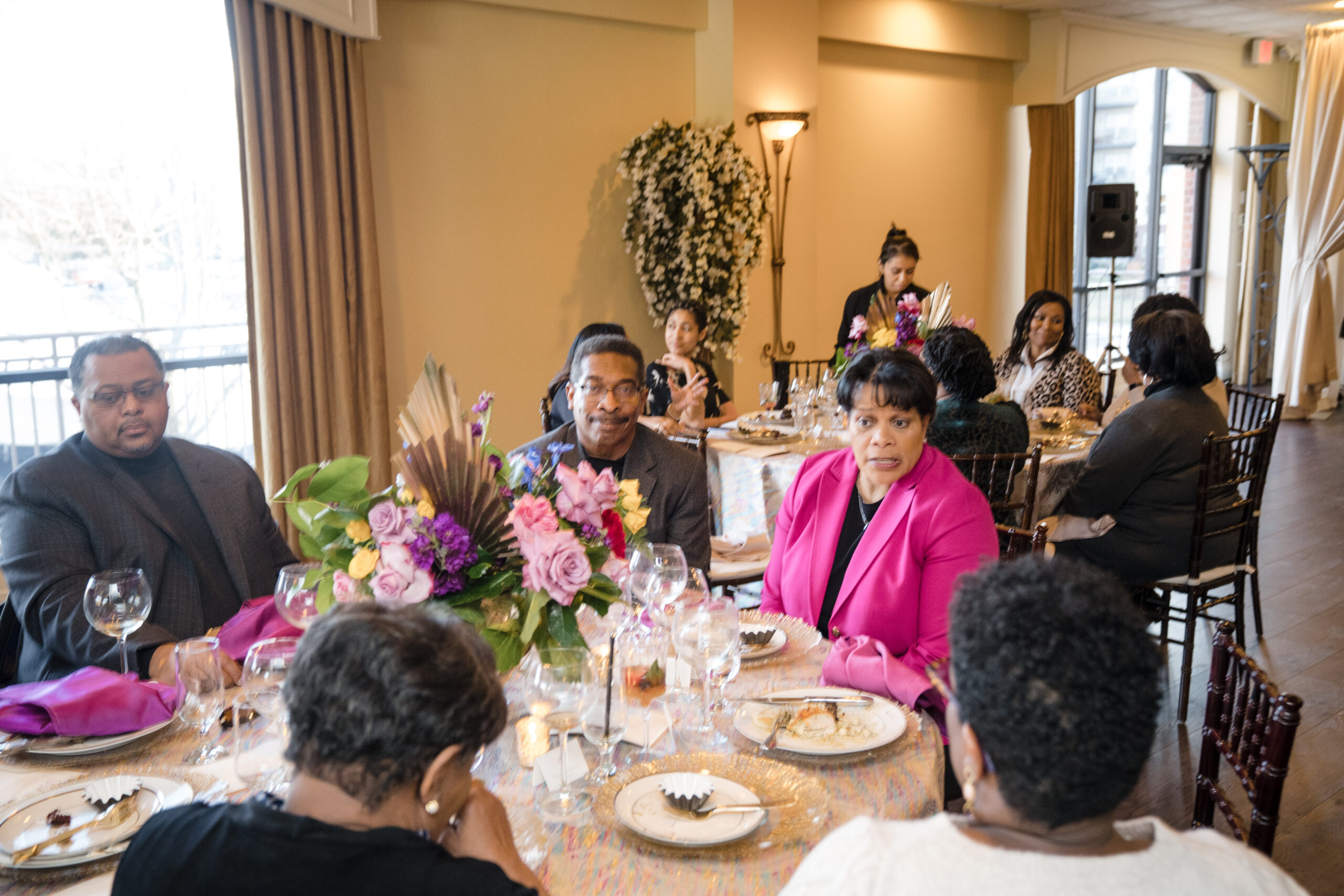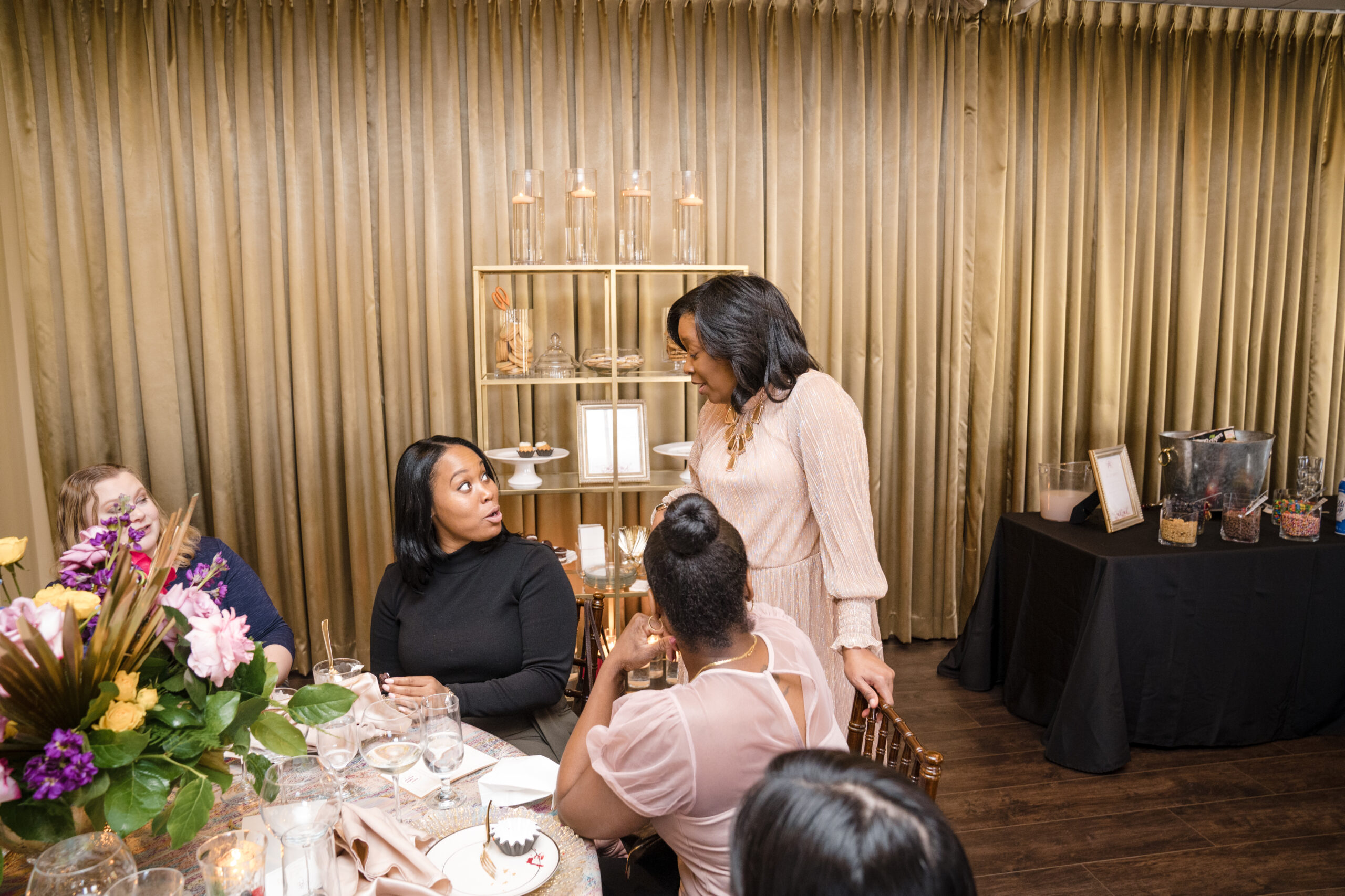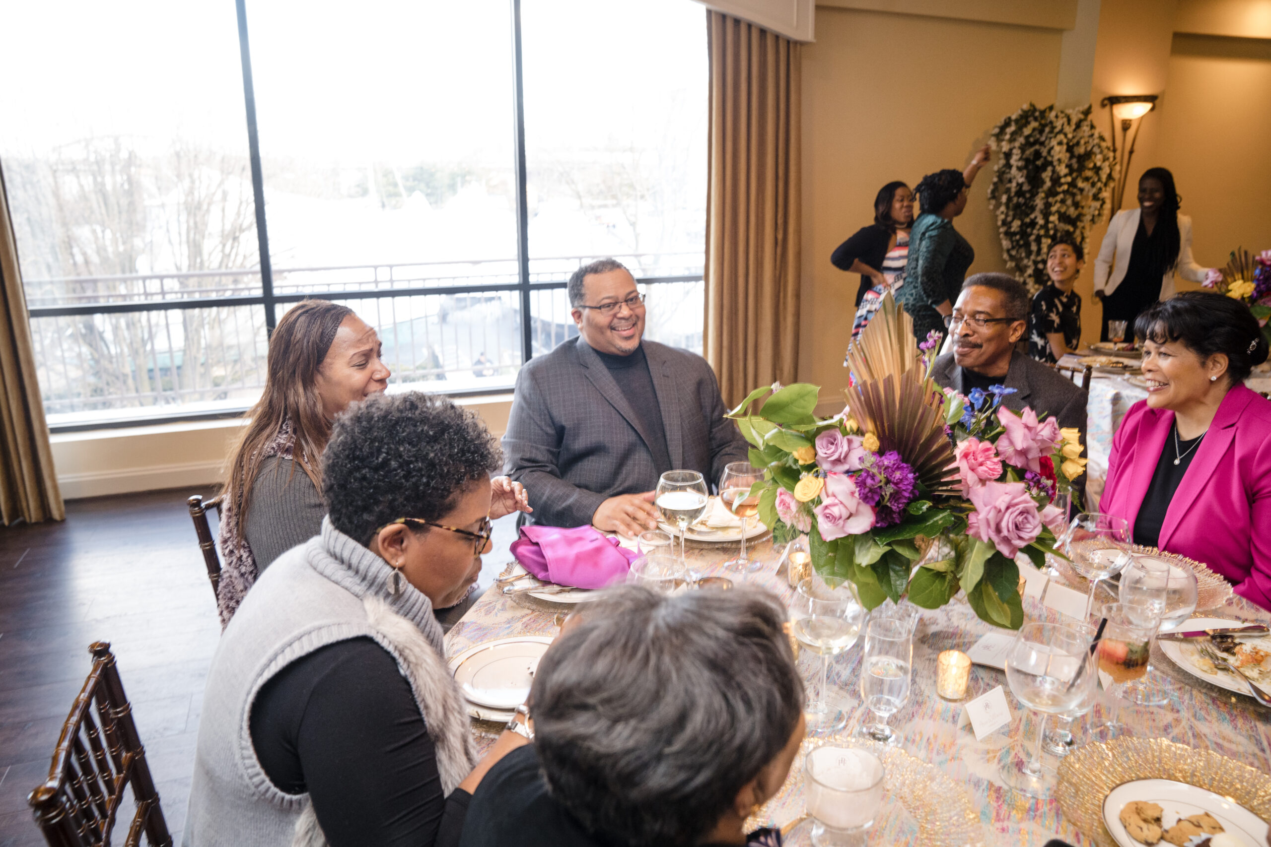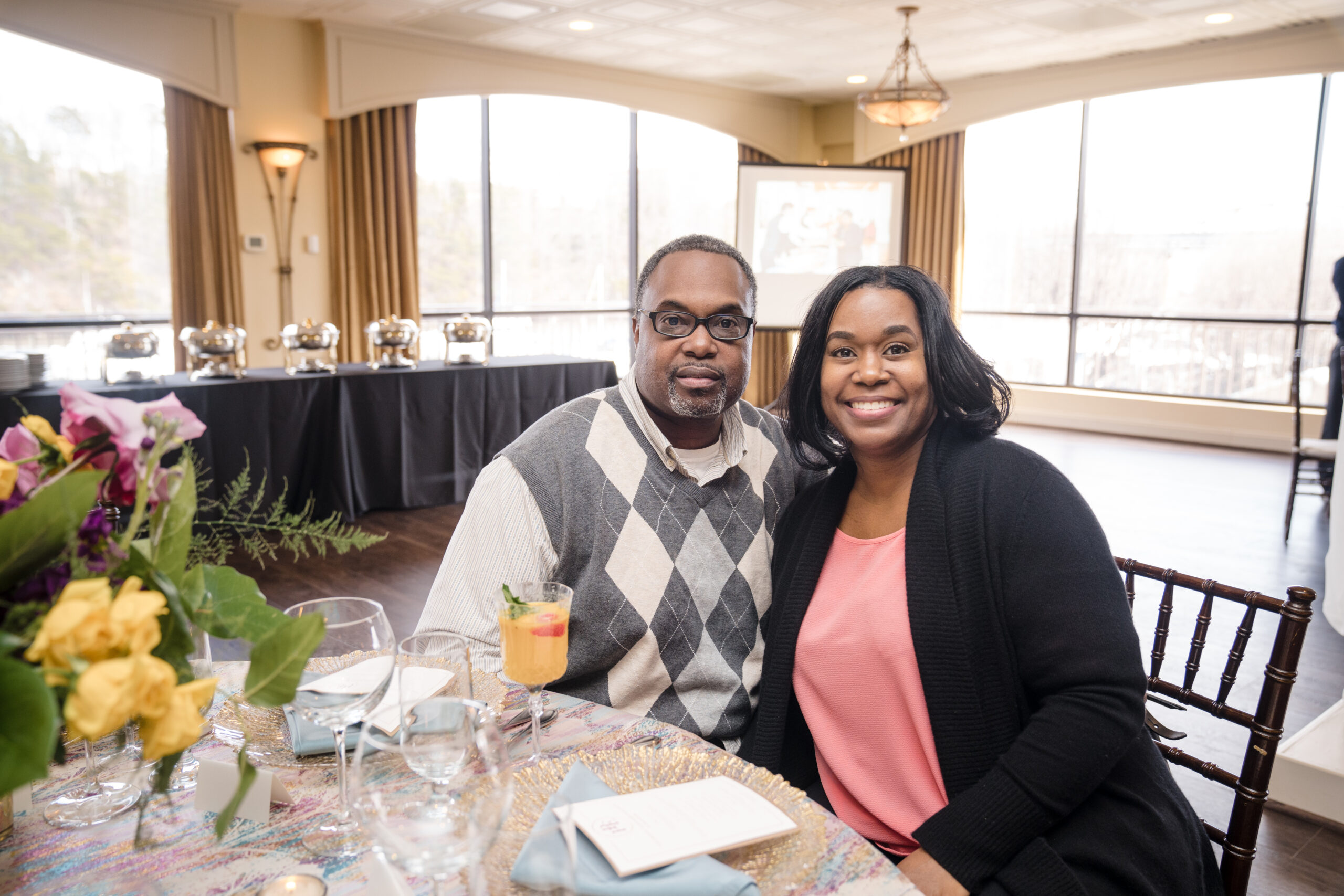 The event was held at Harbour View, a beautiful event space with waterfront views in Prince William County. The day began with everyone arriving and being greeted by a member of my team and served a delicious Mango Berry mocktail and scrumptious butlered hors d’oeuvres – Mediterranean orzo, mini chicken and waffles, and parmesan ravioli. Guests had the opportunity to mix and mingle as they indulged in the bites provided by Kindle Cuisine. I strategically seated everyone who I thought would have common interest and boy did they! Surprise outcomes from their social engagement ranged from realizing they lived in the same neighborhood, going to school with siblings, friends of friends, and more!