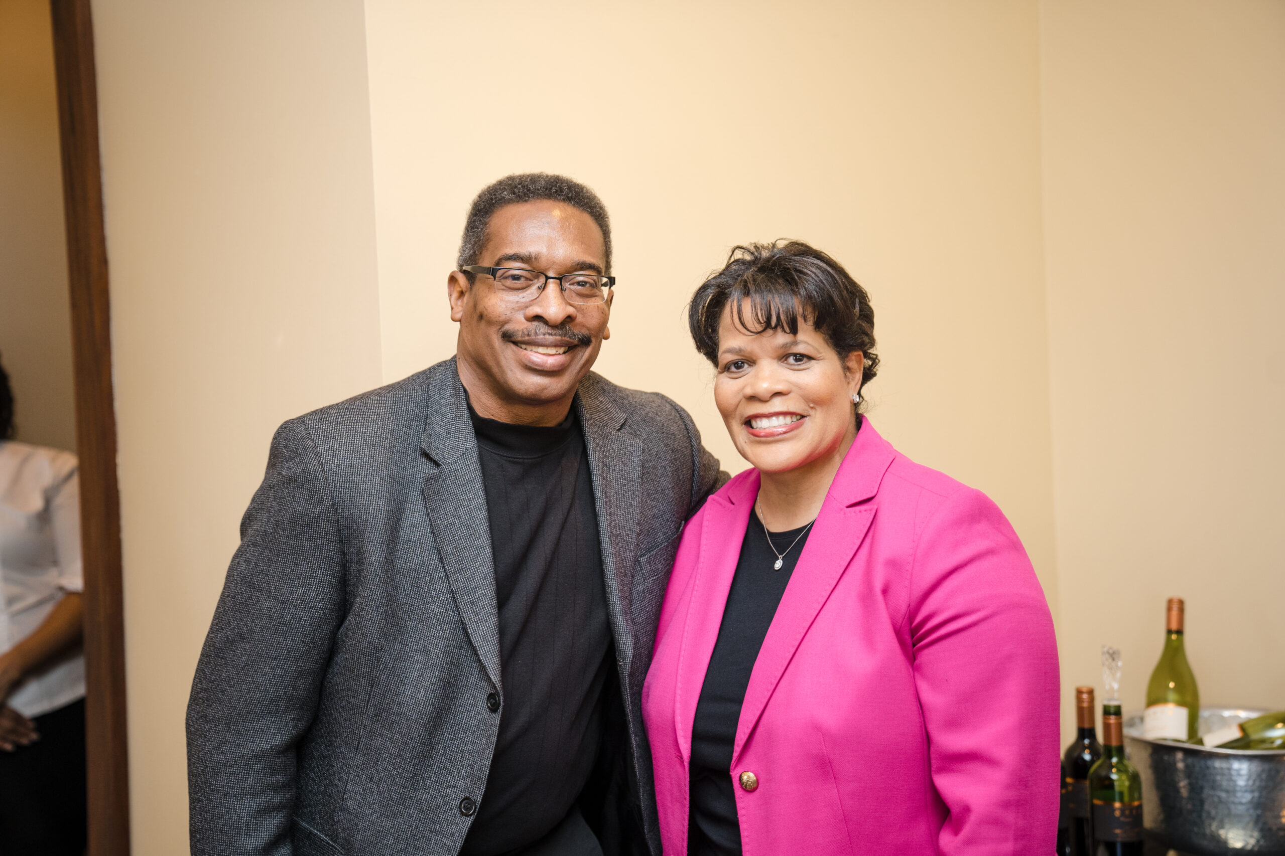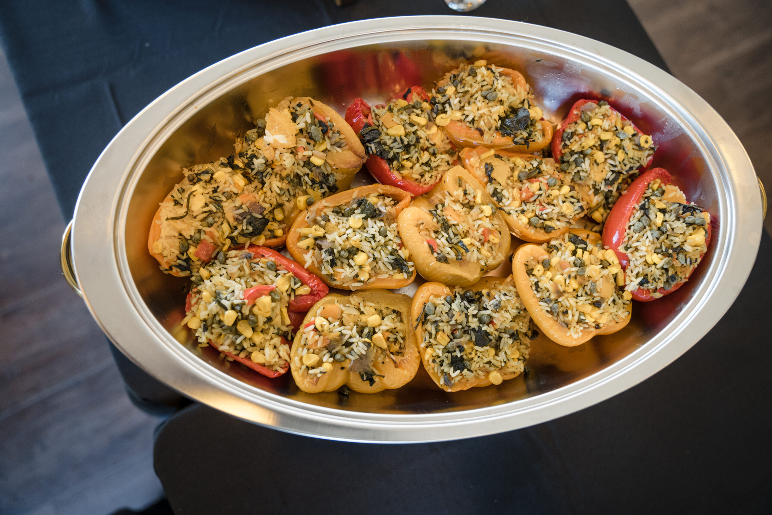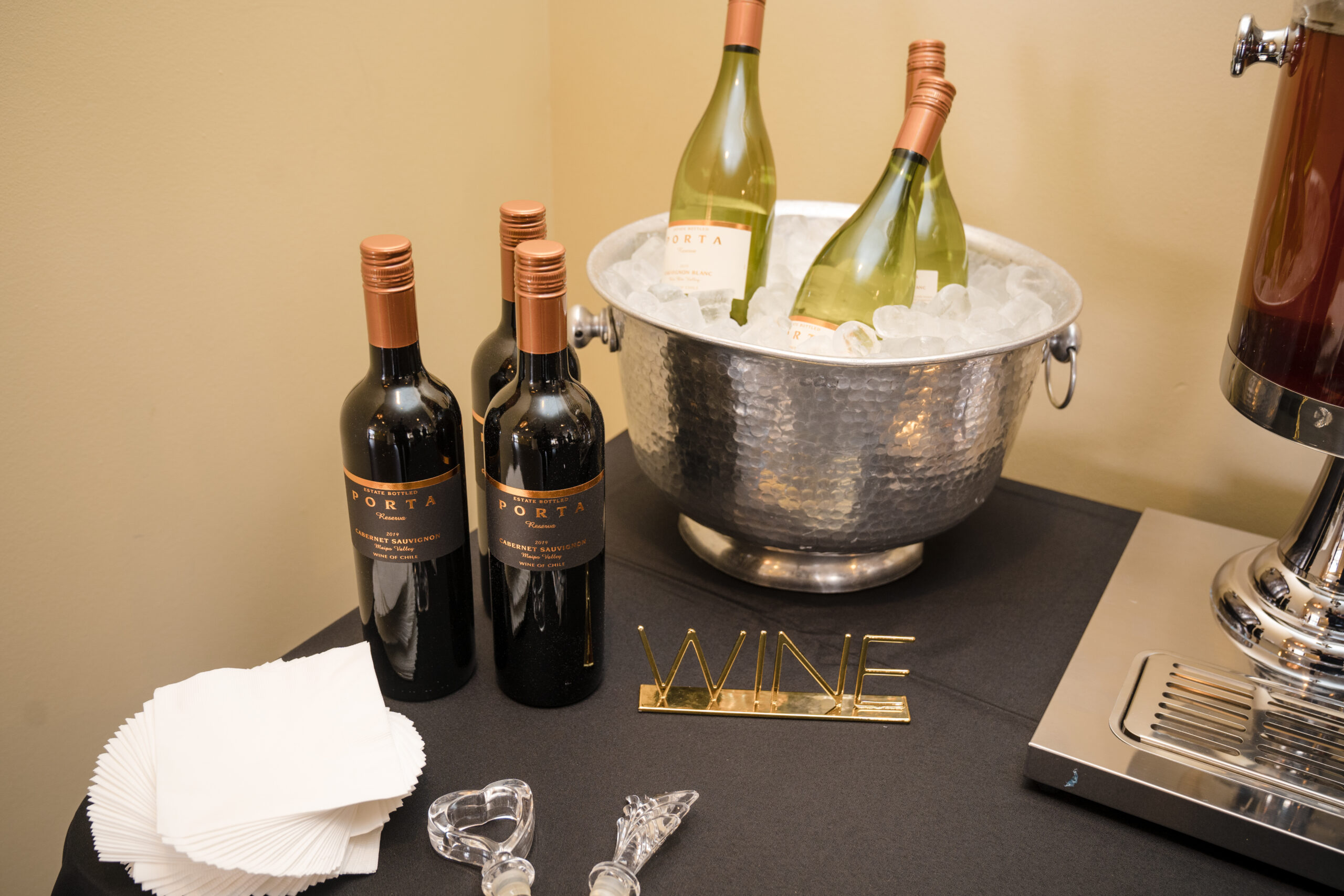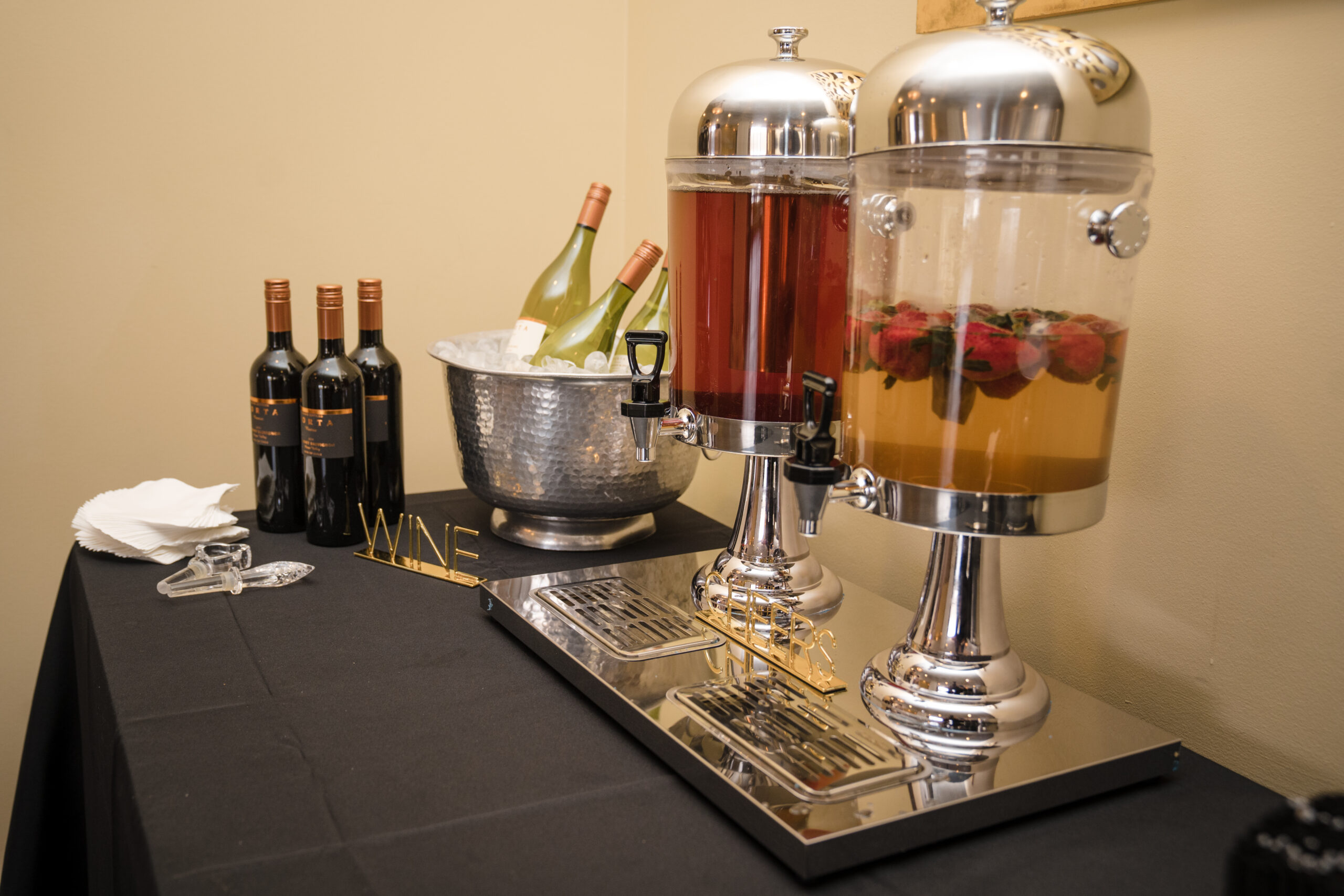 I opened the evening with a few remarks about each of my clients and the purpose of our evening. Chef Renee Weaks came before the guests to describe the meal that she prepared for us – poached pear and goat cheese salad with candied pecans, herbed-cheese stuffed chicken breast, rosemary garlic butter steak, stuffed bell peppers, smoked-grilled vegetables, lemon pesto basmati rice, and honey butter rolls. For dessert we had a variety of self-serve desserts – a variety of bundt cakes from Nothing Bundt Cakes, variety of chocolate brownies, whoopie pies; and to top it off an ice cream station. Oh, and we had a wine bar! Guests departed with a gift of bubbly as a token of my appreciation for their attendance.